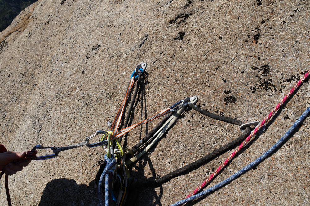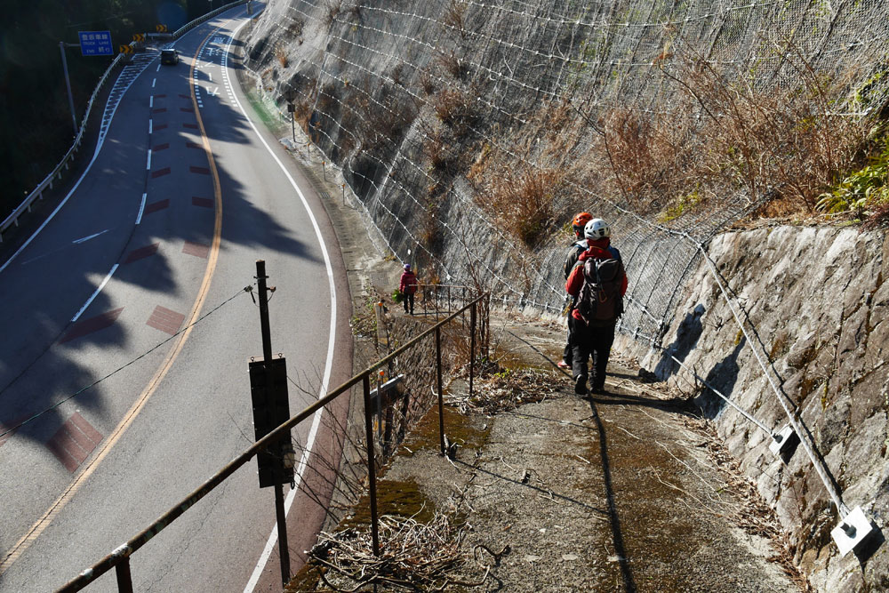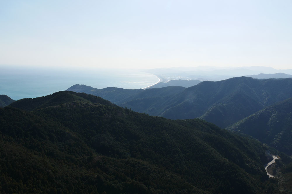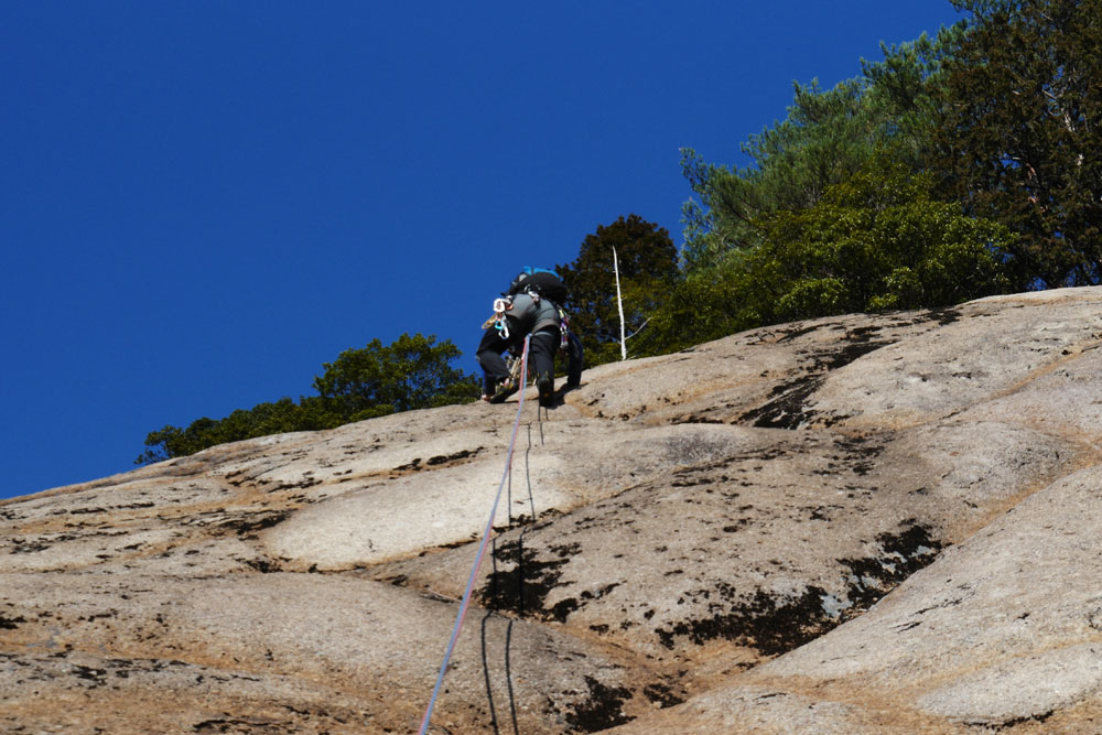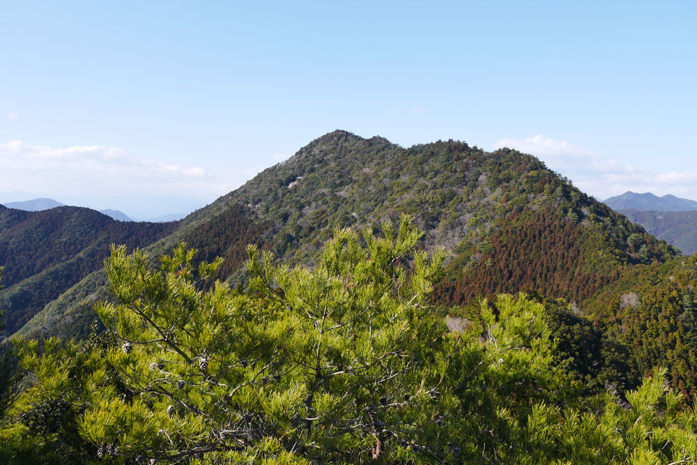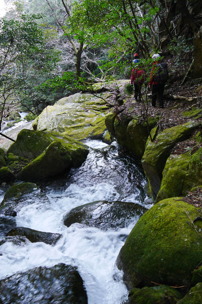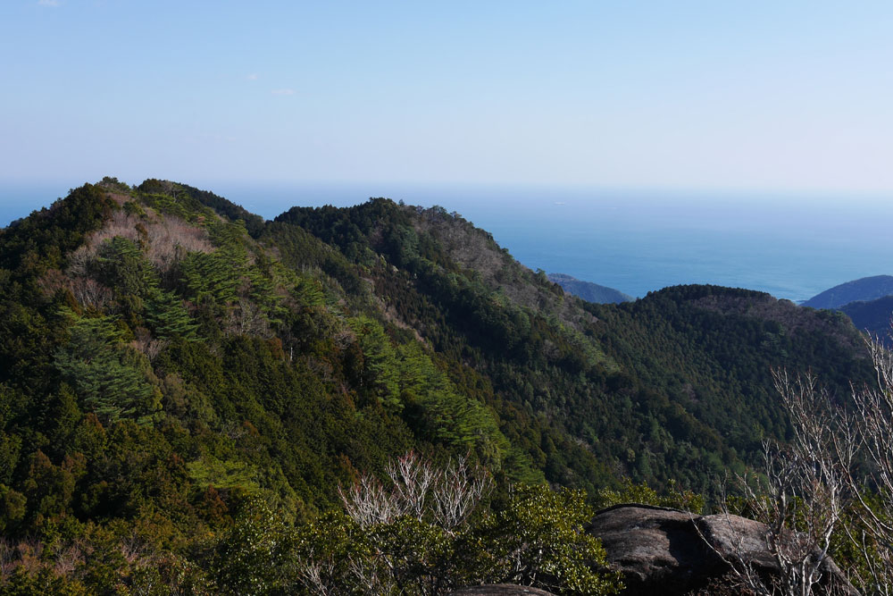 第1スラブ 4ピッチ ノーハンド 4ピッチ目は歩いても行けるほど傾斜が緩み、安堵感に続いて徐々に充実感が湧いてくる。終了点は樹林帯まで20m位の所に設けられている。開拓時にロープgあ足りなかったのか。歩いても行けるが、念のために確保した。 終了点も展望はいいが、もっと景色のいい烏帽子岩まで登ってから休憩にした。 烏帽子岩 烏帽子岩は岩壁から10程登ったところだ。今回は4回目だが目印もあり、踏み跡もしっかりとしていた。 下山 烏帽子岩からは一般登山道がある。ガイドブックに紹介するまでは、踏み跡も薄かったが、最近では良く歩かれているようで、ルートもはっきりとしている。この日は谷の水量が多く、きれいナメを見ながら下った。 50分くらいで駐車場に到着。さて買い物ツアーだ。まずは有馬のJAでミカンと野菜を調達。尾鷲まで戻って、おととで魚を調達。最後は紀北町の始神テラスでうろちょと、地元の大いに貢献した一日だった。