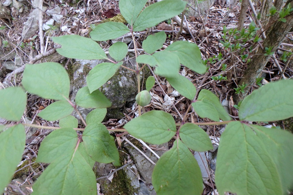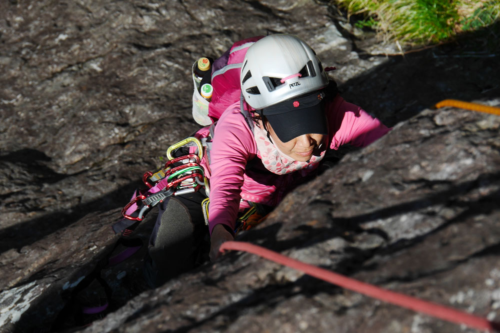 5ピッチ目 5.8、40m 易しいが長いピッチでロープが重い。樹林の中間バンドの岩に支点が整備されている。登りすぎるとトラバースの時にクライムダウンすることになるので、整備された支点で切った方がいいだろう。中休みするには一段上に上がった方がいいのだが。後半戦に備え、食事と休憩に都合のよいところだ。 |