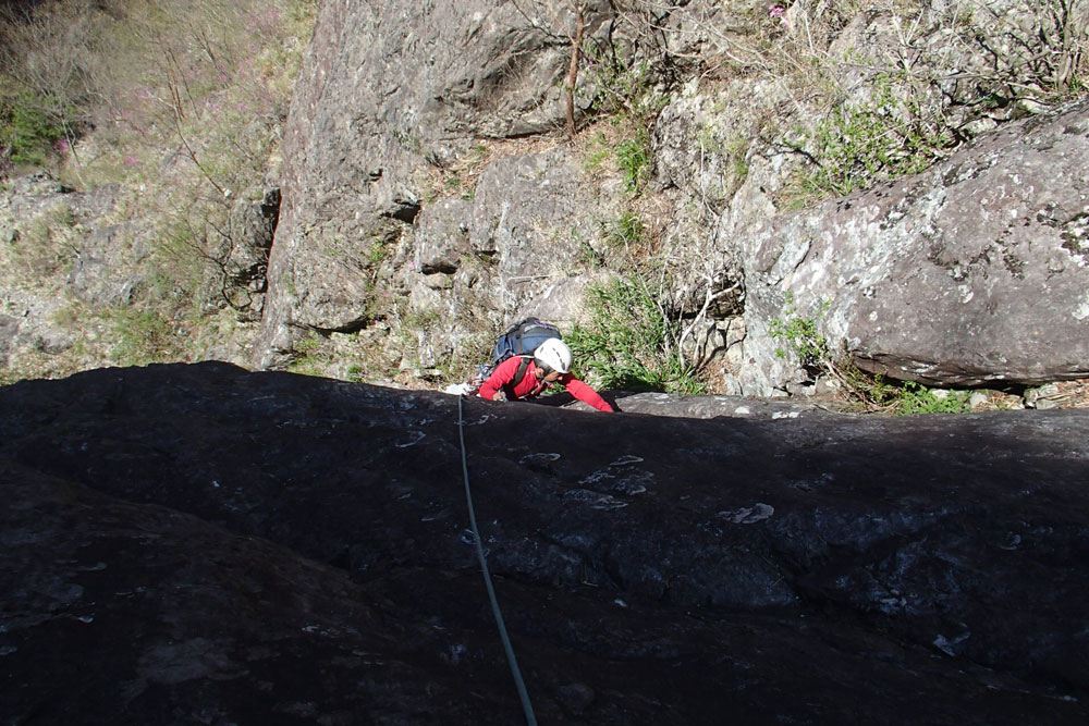 プロローグ 大台遠征の二日目は本命の千石ぐらサマーコレクションの登攀。グレードも高く、長いルートなので、チーム編成、登攀システムなどを考慮し、計画的な登攀が求められる。今回は1−2−1の登攀システムを選択。 アプローチ 千石ぐらは西大台に入ることになるので、立ち入り許可書が必要になる。遊歩道をシオカラ谷へ下っていく。階段を下りきったところからトロッコ道に入る。開かれてから100年以上経過していて、軌道も自然にかえりつつあるが、水平になっているので歩きやすい。尾根を一つ乗り越すと千石ぐらの谷に入るが、一つ手前にテープがあったのでその谷を下った。結局、途中で尾根を乗り越すことになるので、最初から千石ぐらの谷を下った方がいい。時間にすると、遊歩道から10分くらいの距離。 一つ尾根を乗り越すと千石ぐらの岩壁が見えてきた。谷におり岩壁に沿って下っていくと、まず最初に、サンダーボルトの取り付きがある。日本の岩場には、こちらもルートの紹介があるが、サマーコレクション寄りの少しグレードが高い。サマーコレクションの取り付きはさらに一段下がったルンゼ。 サマーコレクションの概要 1ピッチ目V 易しいルンゼだがプロテクションなし、カムも使えそうにない 1ピッチ目 易しいルンゼの登攀で、終盤はチムニー状になる。支点はないのでカムでプロテクションをとった。登攀へのアプローチ的なピッチ。これを登るというよいよ、サマーコレクションが始まる。 2ピッチ目 5.10a、30m ここから実質的な登攀が始まる。プレートに刻まれたルート名「サマーコレクション」を見ると身が締まる。滑りやすいスラブで、細かいスタンスを拾いながらの登攀が続く。微妙なムーブもあり、1ピッチ目が終わるころに、こわばった手と足がなじみ始めた。ボルトの間隔は狭いが1ピッチ目のリードなので、なかなか大胆になれない。 朝が早いのでまだ岩壁は日陰になっているが、岩壁のコンディションは、暑くもなく、寒くもなく良好だ。1−2−1のシステムだが、2人を上げたところでスタートできるので、時間的には1−2とあまりかわらない。 3ピッチ目 5.10a、50m 気持ちにゆとりの出てくるピッチだが、長い。5.10aは部分的で、全般的に気持ちの楽なピッチだ。 左の岩壁に日が差し始め、明るい雰囲気になってきた。ルートは左の岩壁とのコーナーに沿って登り、スラブで乗り越すと少し傾斜が緩む。このピッチから陽射しが入ってきた。 4ピッチ目 (5.10c/d、15m) さて4と5ピッチ目は繋げることもできそうだが、4ピッチ目が厳しいので切った方が良さそうだ。ただし、切るとハンギングビレイになる。このピッチのみのフリーならあれやこれやムーブを工夫する楽しさがあるが、4人がそれぞれやっていると時間がなくなる。とにかく時間内に抜けることが第一優先なので、1カ所だけアブミを使い安全策をとった。 核心部は薄かぶり状態だが、ホールド、スタンスは探せば見つかる。短いピッチだが保持力も必要になっている。
