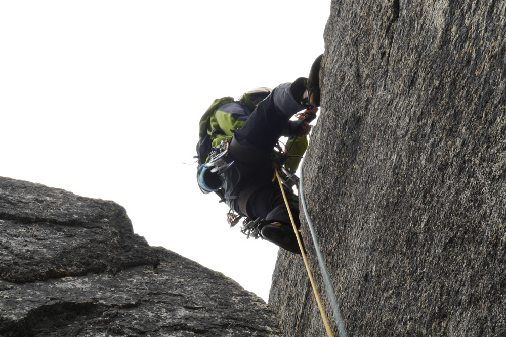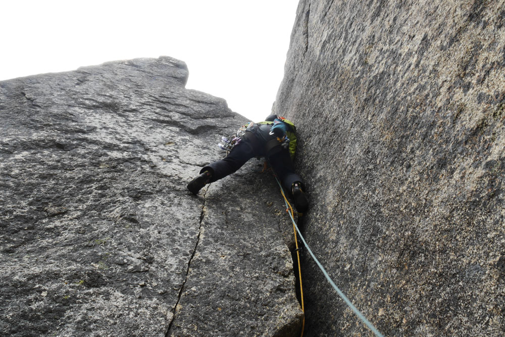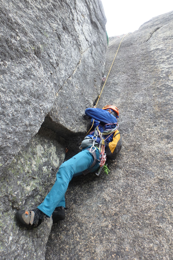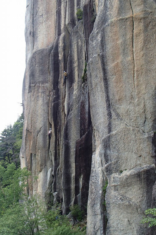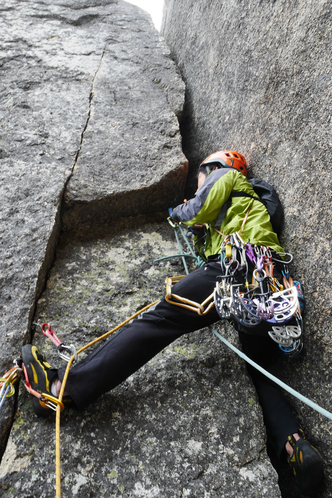 右足のジャムがぬけやすいところがあるみたいで、たくさんとしんくんがぬけた。さて核心はこのクラックではない。ピナクルの頭からはブリッジングでフェースに移るが、ここがむずかしい。