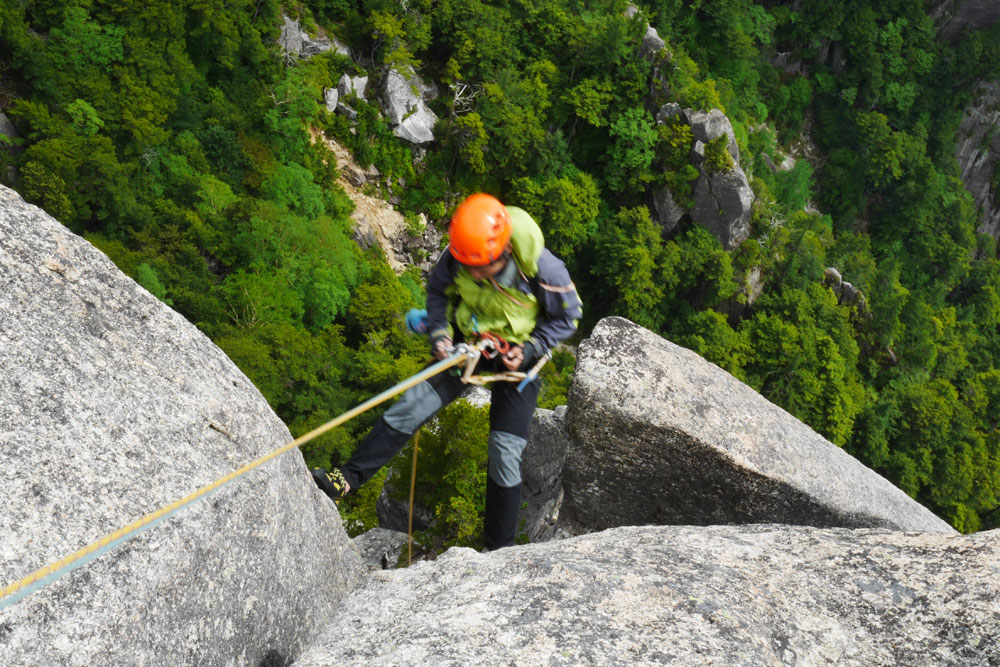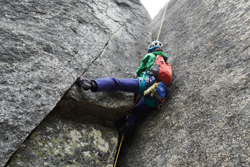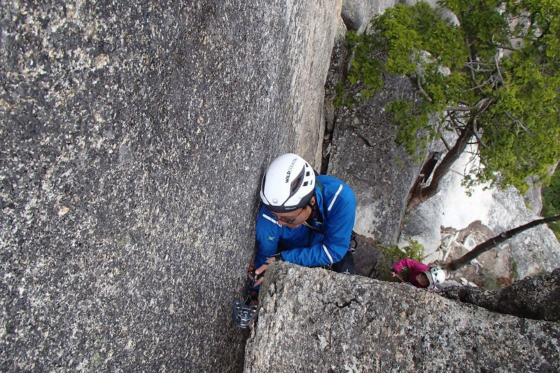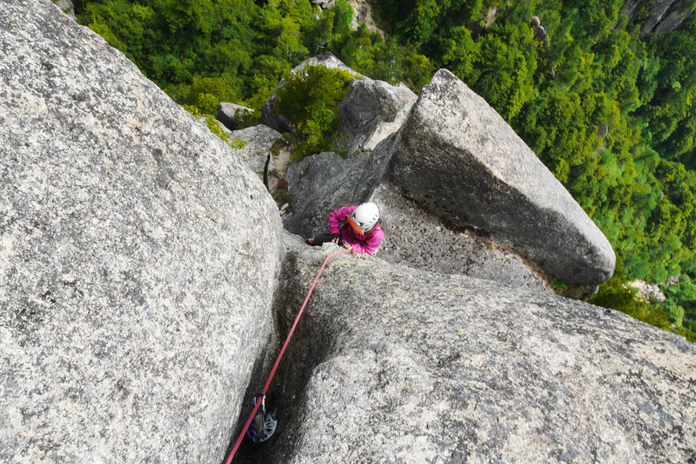 5ピッチ目 最終ピッチ 5.8 5.10a キャメロット#2、#3、#4、#5 ピナクルのコーナークラックを登る。クラックの前半はワイドでジャムが効かない。中間部で#5が使えるが、後半に備えて温存。後半は#2、#3、#4がセットでき、ホールドはジャム。出口が広がるので#4を温存。
