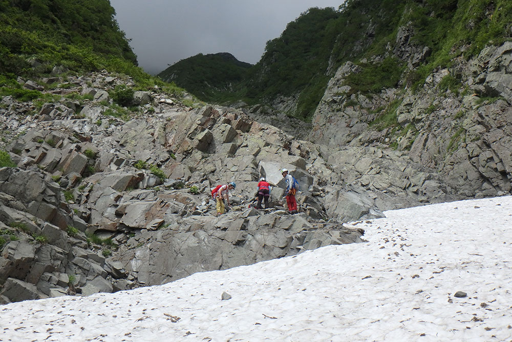 プロローグ この夏、アルパイン第2弾は、「花とロケーションと登攀と岩稜歩き」、この全部を満足できそうなコブ尾根をチョイス。コブ尾根は残雪期に人気ルートだが、無積雪期も十分楽しめる。今年は雪が雪が極端に少ない年で、コブ尾根登攀の成否はコブ沢の雪渓の状態にかかっていた。 前回のレポート → コブ尾根@奧穂高岳(北アルプス)2013年8月16日17日18日No.750 アプローチ 前夜車泊で沢渡に入った。北岳以降、どうやら風邪をひいたようで、体がすっきりとしない。とりあえず6時の出発まで眠れたのでなんとかなりそうだ、体は重く感じる。5時半にTjさんたちと合流し予約してあったタクシーに乗って上高地に入った。5人乗るとタクシーの方がお得だし早い。 上高地ー岳沢 心配していた天候だが、オホーツク海高気圧が張り出したおかげでなんとかなりそうだ。少なくとも先週の北岳よりは、かなりよい条件になりそうだ。河童橋から、前穗、奥穂、西穂に囲まれた岳沢が見えている。景色としてみるのは美しいが、気になるのはひとつだけ。コブ沢の雪渓だ。ここの状態により、今回のプランが大きく左右される。そんなことを考えながら河童橋を渡った。 重いザックを担いで歩き出すが、体が重くて歩けない。ロープを助けてもらっているがいつもよりザックが重く感じられた。とにかく今日は、岳沢までなので、体調と相談しながらみんなから遅れてゆっくりと歩いた。 岳沢までは所々で草地があり、夏の花がよく咲いていた。樹林ではゴゼンタチバナ、イチヤクソウ、センジュガンピ、草地ではヒヨドリバナ、クガイソウ、ホタルブクロ、クルマユリ、ミヤマアキノキリンソウなど。夏の花は今が盛りなのかもしれない。 4時間もかかってやっと岳沢に到着した。体が熱っぽいので、とりあえずテントに入って横になった。少し体が軽くなったが、食欲がない。時計を見ると13時前になっていた。今日中に偵察を済ませておく必要があるので、コブ沢に出かけてみた。 コブ沢の偵察 前回は8月中旬の登攀だったが、そのときよりも雪が少ない。気になっていたのは滝で、残念ながら、滝で雪渓が切れていた。これは右岸から巻き、再び雪渓に降りた。上部の雪渓は中央部分がかなり薄くなっていてたが、端の方を歩くとなんとかなりそうだ。落ちてもいいようにスカタットで登った。 もう一つの核心は、岩壁への取り付き。当然シュルンドが開いている。岩壁へ移れる箇所は一カ所ある。これは前回と同じ。ここもなんとか突破できそうだ。見切りをつけて偵察を終了した。滝の巻きは懸垂下降し、明日のためにロープをフィックスした。