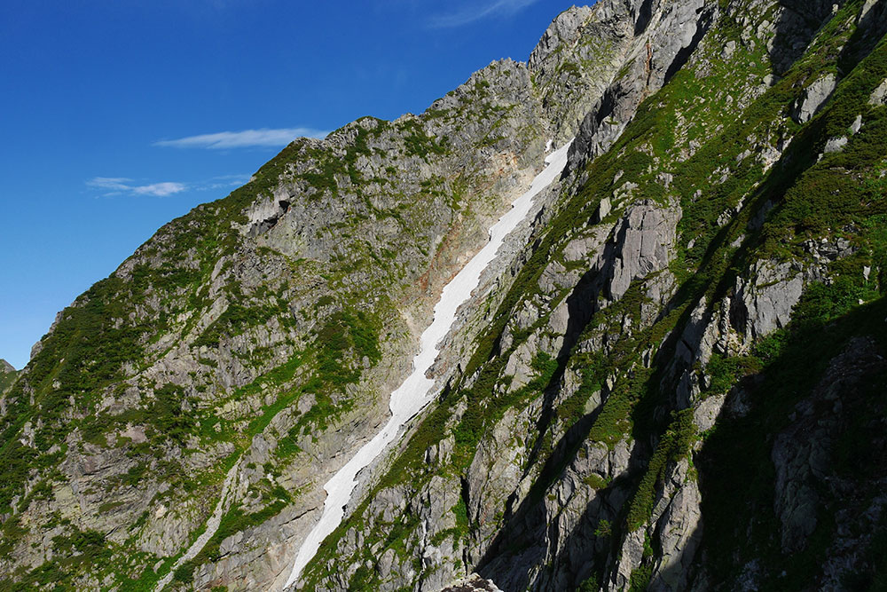 コブ尾根のコル コルに出ると一気に視界がひろがり、右手の奥穂ー前穂の吊り尾根、正面に奥穂、ロバの耳、ジャンダルム、左に畳岩尾根が見えている。この角度から見るのは、バリエーションルートに入った者に与えられた特権だと思う。 ところどころでハイマツが邪魔になるが、踏み跡はしっかりとしている。約1時間半でT峰に到着した。 コブ(T峰)の登攀 さてコブの登攀。このために重いロープ、クライミングシューズ、ギア類を担いできたというもの。易しい登攀だが、この高度とロケーションだから味わえる醍醐味がある。グレードの高いマルチフリーとは価値観が違う。3ピッチで登ったが、実質的な登攀は2ピッチのみ。あっという間に終わってしまいちょっと物足りなさを感じる。 3ピッチ目 2ピッチ目はほぼ歩きで、3ピッチ目が登攀。ここも残置ハーケンがある。 ピークに立つと一気の展望が開ける。ルート中で最も展望がいいところで、正面にロバの耳やジャンダルム、コブの頭が、右手に吊り尾根をゆく登山者もよく見えている。穗高の岩峰に囲まれての登攀は実に痛快だった。ピークに立つと徐々にガスが湧いてきた。予報通りだ。これが最後かもしれないので、見えているうちに何枚か写真を撮った。 懸垂下降 さてピークからは懸垂下降。50mロープを連結。途中で中継すれば1本でもいけそうだが。この懸垂が終わると、後はひたすら岩稜歩きだ。その前に少しクライムダウンがある。あぶないと思えば懸垂を選択。 | 7/23 | 7/23-1 | 7/23-2 | 7/23-3 | |