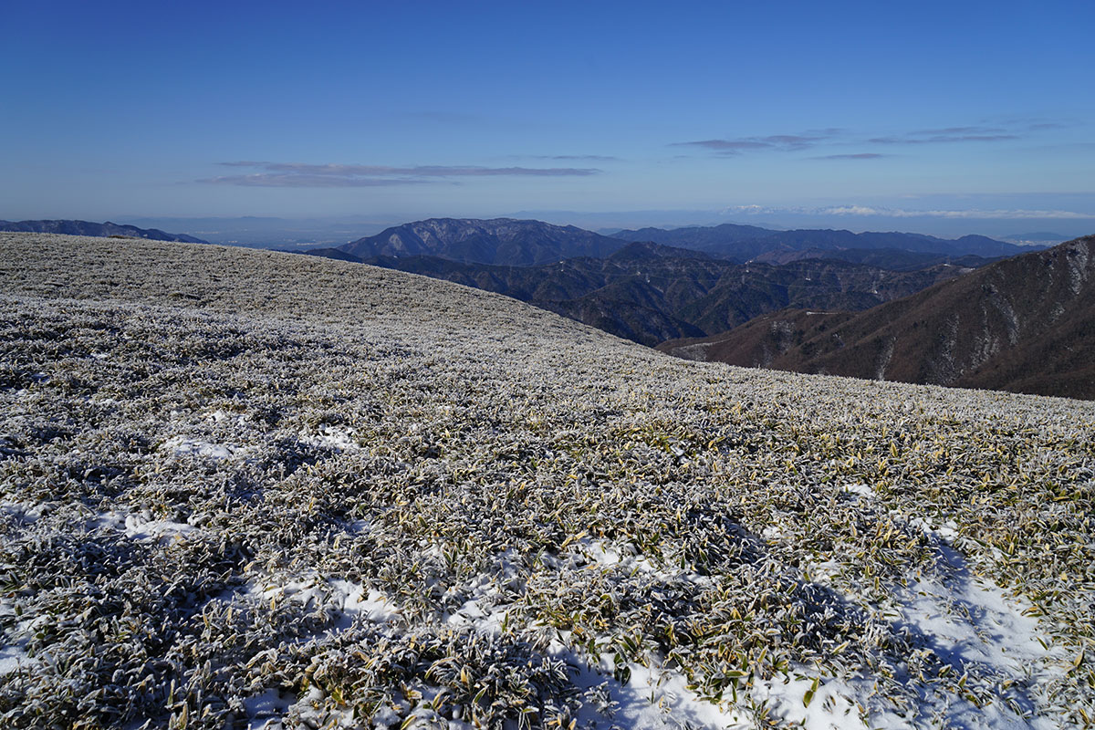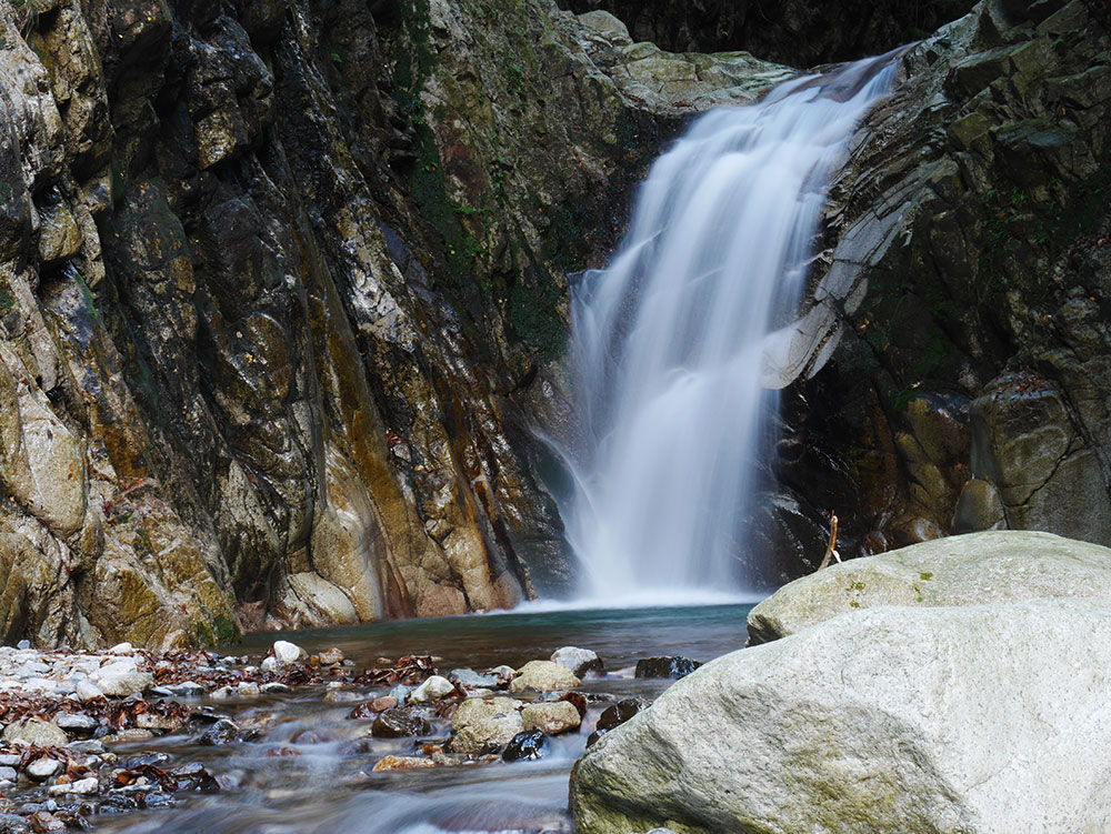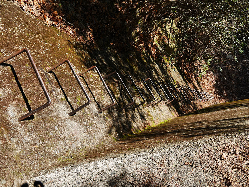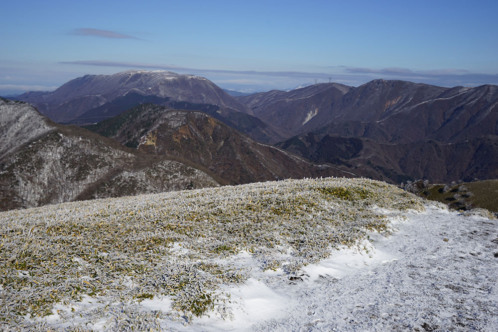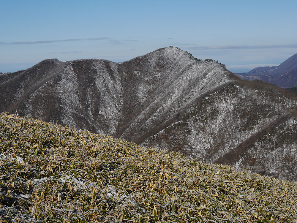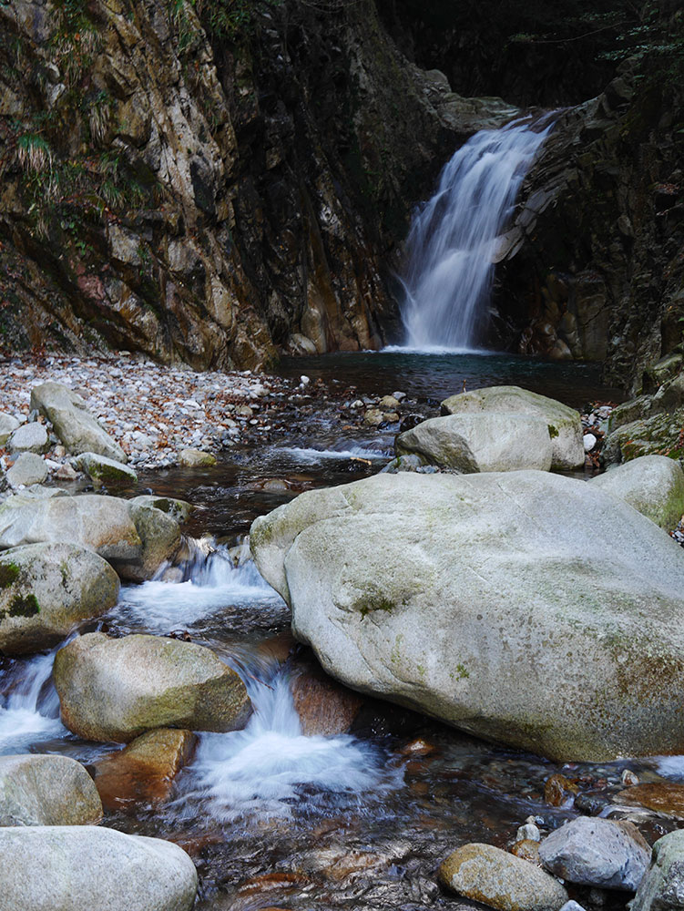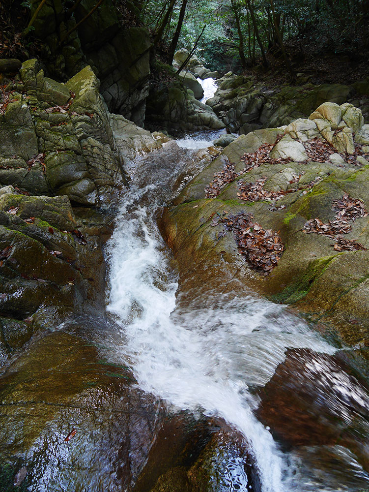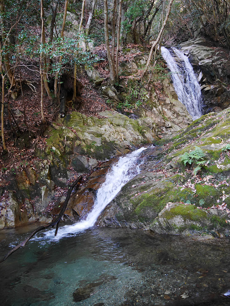 | ページ1 | ページ2 | 竜ケ岳1099.6 山頂はさすがに気温が低く風が通るので、笹に樹氷が付いて白い粉をまぶしたようになっていて、なかなか面白い景観だ。単独男性が二人やってきた。週末はいつも賑わう山頂もこの日は、登山者が少なかった。風裏に腰を下ろし、大展望を楽しみながら、ポットのお湯でカップ麺をつくり暖まった。 ヨコ谷 さて下りは、ルートチェックを兼ねてヨコ谷で下ることにした。ルートとしてはあまり良くないが、目印テープがたくさんあって安心できる。下っていく途中で2パーティーと行き交った。いずれも若いグループだった。雪が付いていたのは中腹くらいまでで、日当たりも良くて晩秋のような雰囲気だった。 今回は、長尾の滝はパスして、五階の滝と魚止滝の撮影をして駐車場に戻った。時計を見るとちょうど昼で、半日登山にしてはボリュームのある内容だった。 来年もまた季節を変えて登りたいと思う山だ。 五階滝 魚止滝