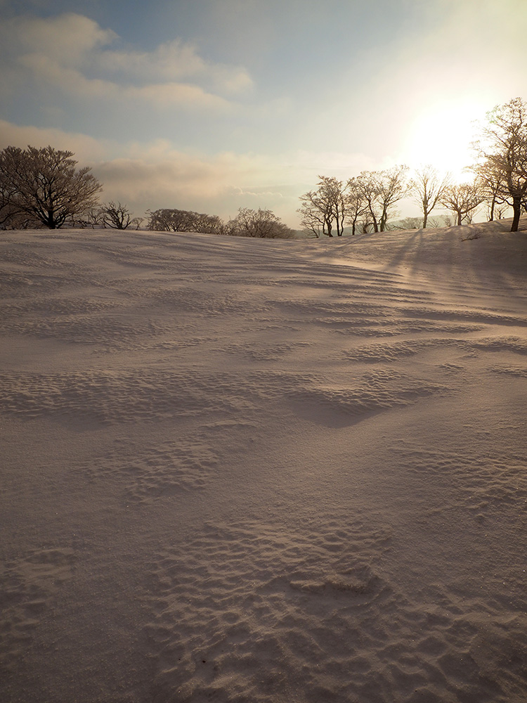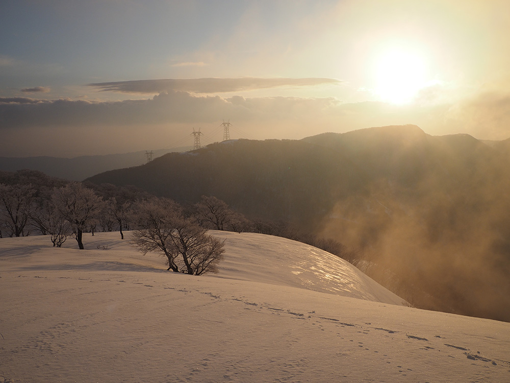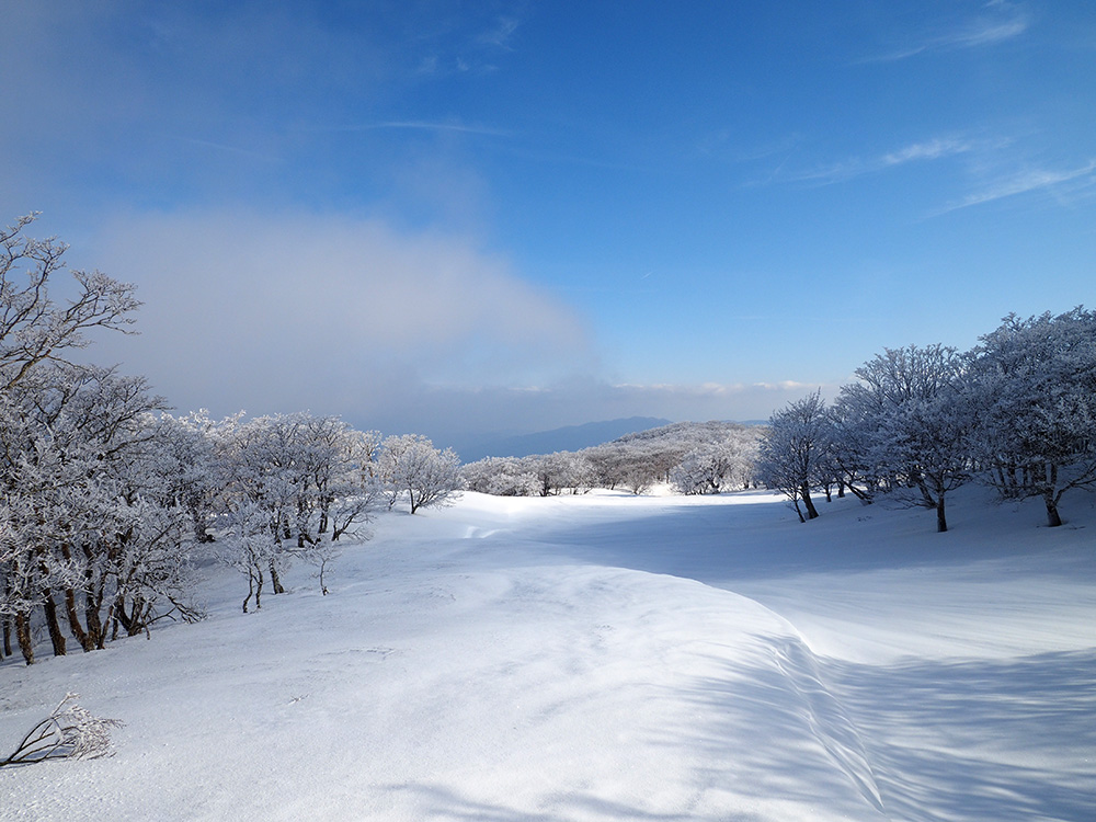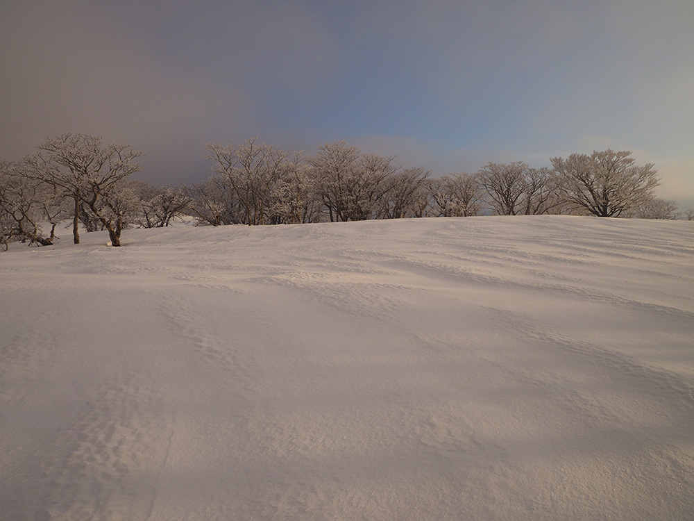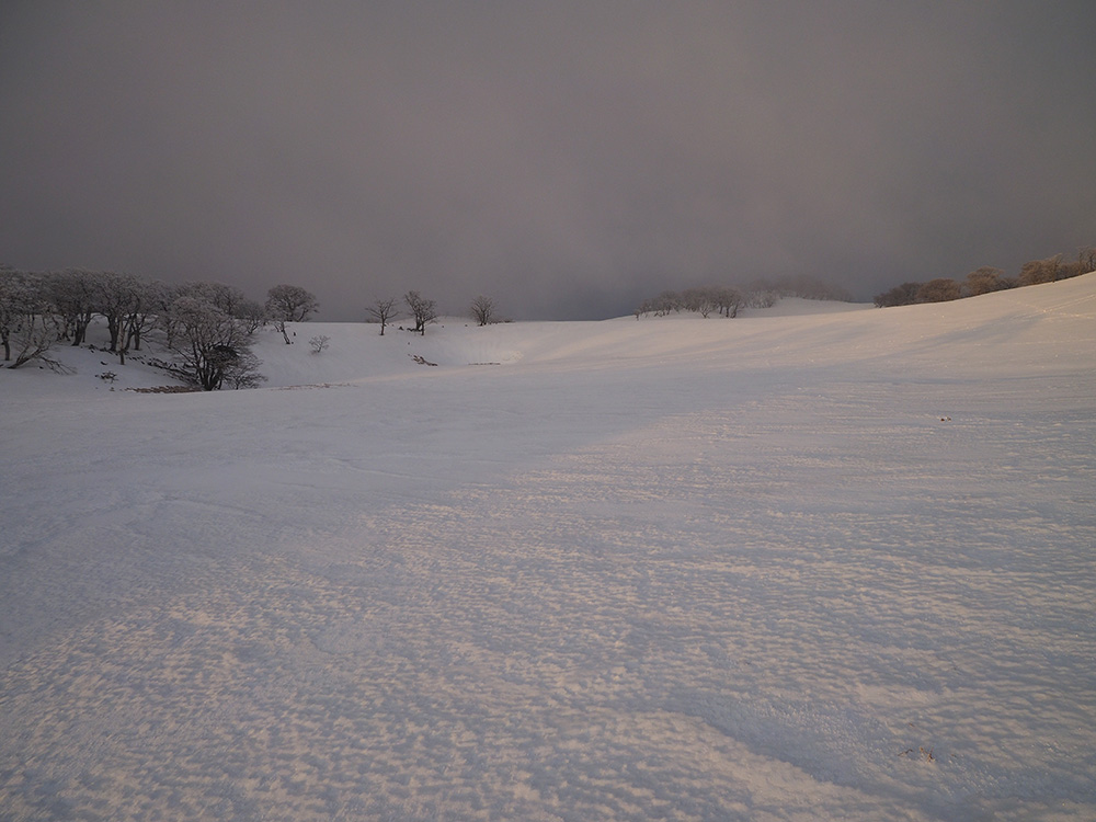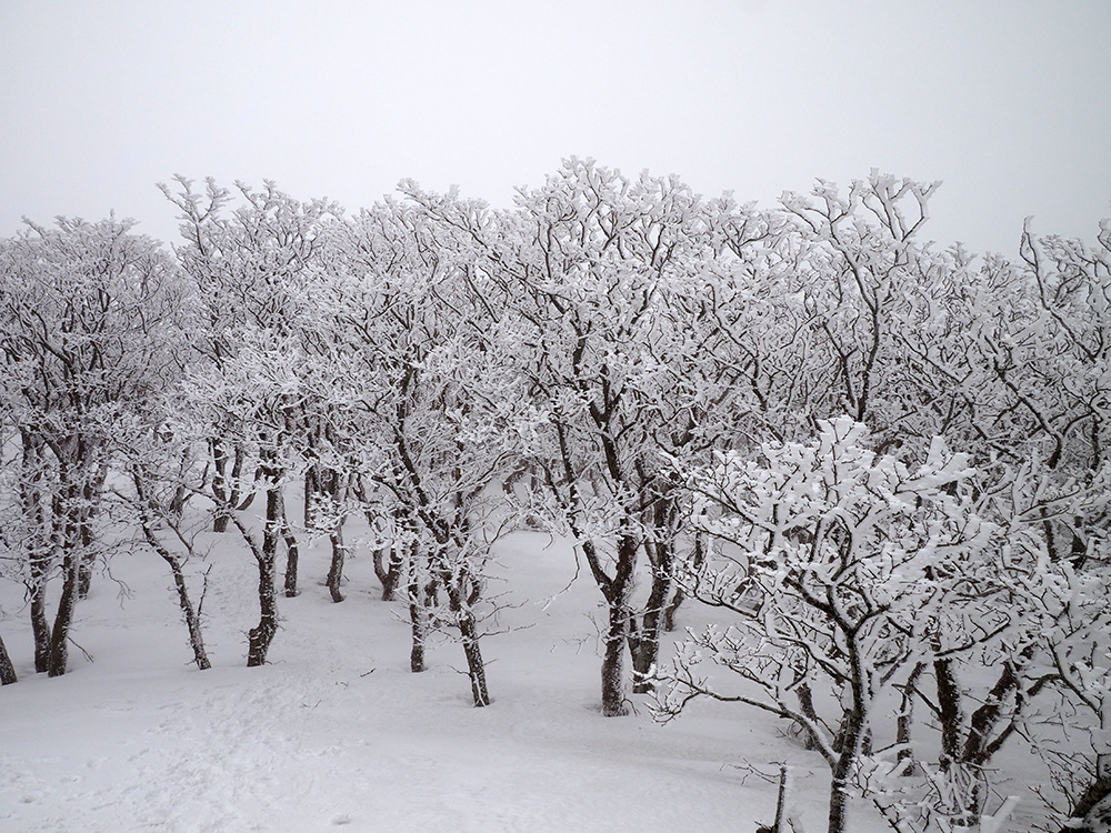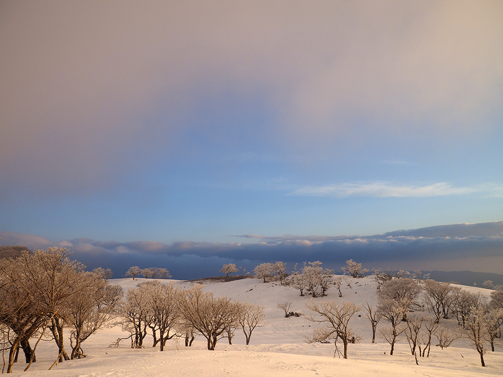二日目 日の出が見たくて4時間に起きて食事の準備をした。霧氷がフライシートにあたりサラサラと音がしている。霧氷が成長するのはうれしいが、どうもガスのようだ。予報では晴れるようだが、少し気温が上がらないとガスも上がらない。とりあえず6時前にテーブルランドの周回に出かけることにした。 奥の平からの展望を期待したがガスで何も見えなかった。とにかく東端へ行けば視界が開けるかもしれないので、真の谷側を歩いていると、ガスが切れだし、東の方が赤らんできた。チャンスはありそうだ。東端に行くとガスが晴れ朝日が上がってくるところだった。ドリーネのあたりで待ち構えたかったがすでに遅い。中途半端な撮影になってしまったことが悔やまれた。自然相手なので、なかなか思うようにならない。 東端へ行くと単独者が一人散策に出てきた。昨日はT字尾根から登ってきたようで、登ったところにテントを設営したようだ。光と影の黄金タイムが過ぎ去ったので、東端から少し戻ってくると内側の方はまだガスがまとわりついていて、青のドリーネのくぼみすら解らない状態だ。撮影をあきらめボタンブチの方へ向かった。するとテントが三張り。ということは我々を含め今週は3パーティーが入ったということ。 ガスが晴れそうもないのでとりあえずテントのある山頂に戻ることにした。ガスは薄くなってきているので、もう少し気温が上がるのを待つしかない。その間にテントを撤収した。撤収が終わった頃に男女のペアが登ってきた。昨日はカタクリ峠にテントを張ったようだ。 山頂を後にすると青空が広がりだした。ドリーネ撮影のチャンスが巡ってきたが、もう一度戻る気にはなれず、鈴北岳に向かうことにした。鈴北岳へ行くということは、鞍掛峠に降りるということ。山頂へ登ってきたペアの話によると、国道はスノーシューが必要だったと言っていたことが気になった。 鈴北岳まで来ると青空が広がり始めた。何度も御池方面を振り返り風景を楽しいだ。 さて鈴北岳からは、県境縦走路で鞍掛峠に下る。雪の状態がいいので快調に峠までは下れたが、本日の核心はその先にあった。峠から国道までの下りだ。夏道なら20分ほどで下れるが、日当たりの良い斜面は雪が緩み、何度も雪を踏み抜きながらの下りになった。 やっと国道まで降りることができたが、冬季閉鎖の国道はガードレールが埋まるほどの積雪があり、しかも雪が緩んでいて、ワカンを装着して下った。山中ではワカンがお荷物になっていたが、まさか国道で使うことになるとは思わなかった。2時間半かかりやっと国道のゲートに到着し、そこからはタクシーを頼んで大貝戸の登山口に戻った。 | ページ1 | ページ2 | |