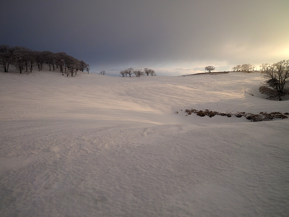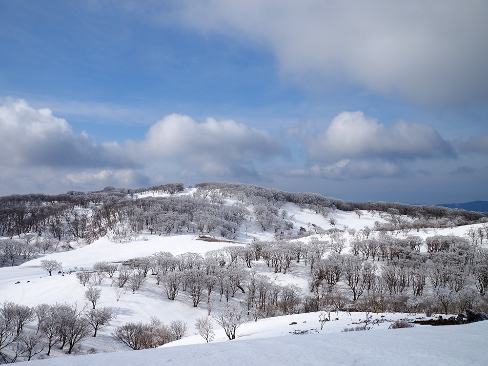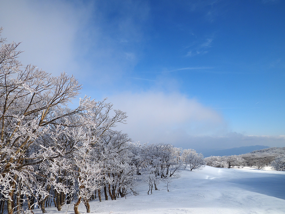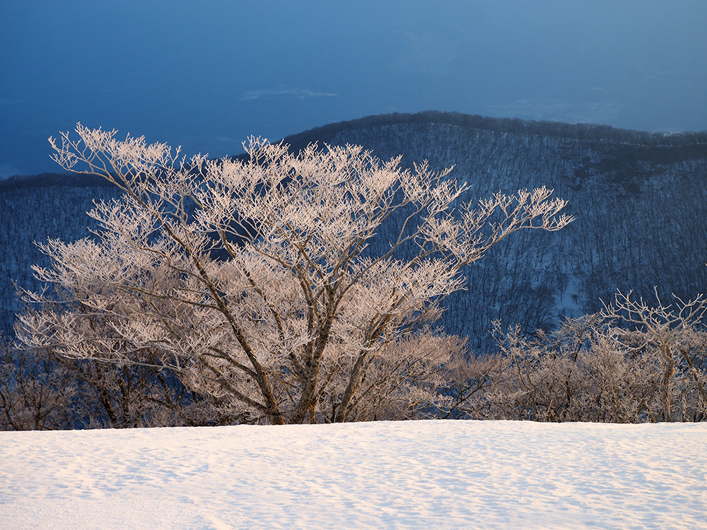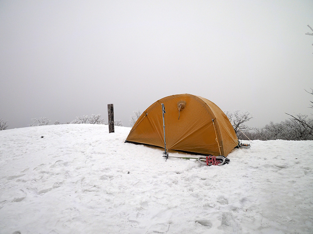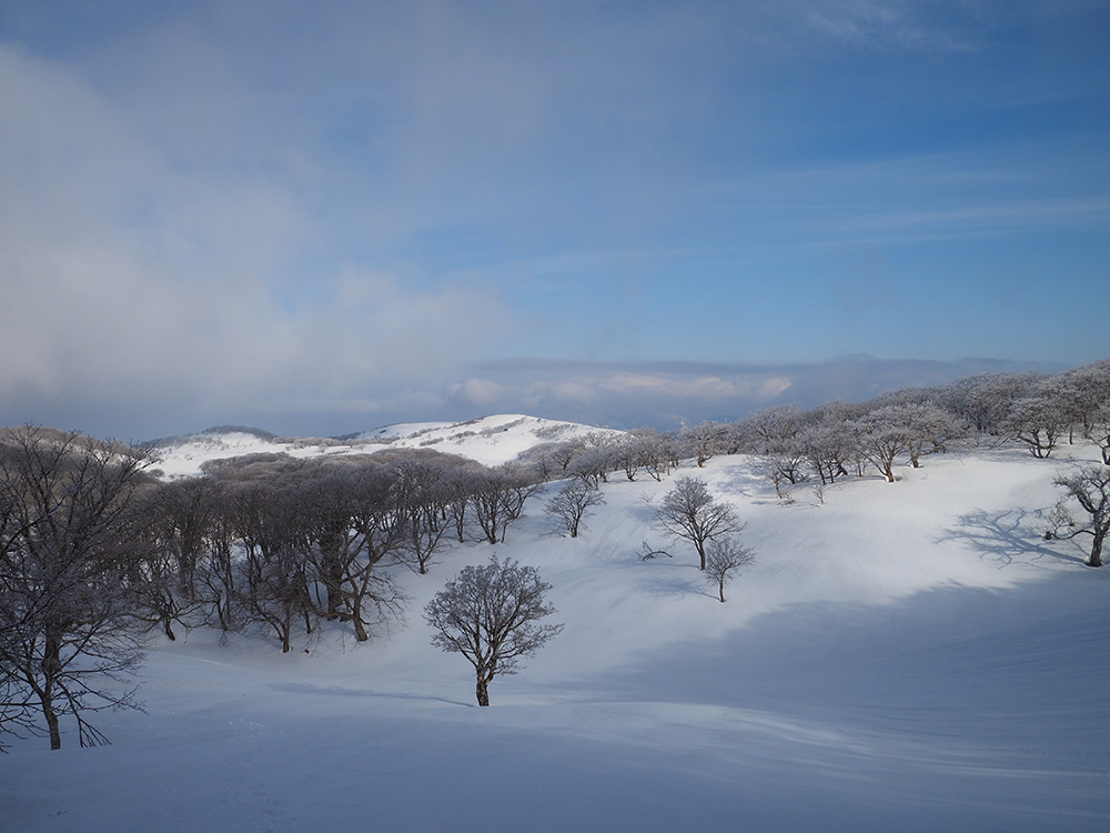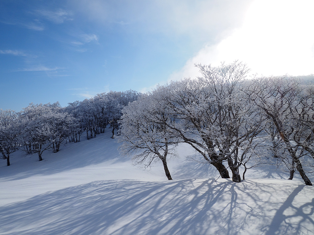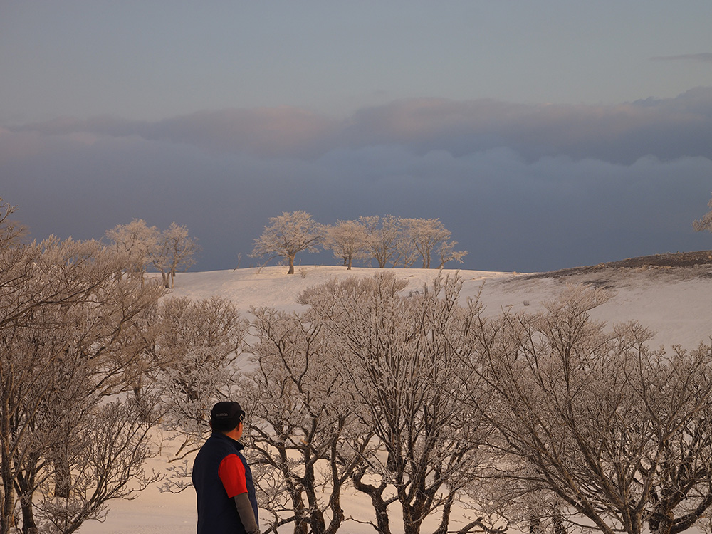 二日目 日の出が見たくて4時間に起きて食事の準備をした。霧氷がフライシートにあたりサラサラと音がしている。霧氷が成長するのはうれしいが、どうもガスのようだ。予報では晴れるようだが、少し気温が上がらないとガスも上がらない。とりあえず6時前にテーブルランドの周回に出かけることにした。 奥の平からの展望を期待したがガスで何も見えなかった。とにかく東端へ行けば視界が開けるかもしれないので、真の谷側を歩いていると、ガスが切れだし、東の方が赤らんできた。チャンスはありそうだ。東端に行くとガスが晴れ朝日が上がってくるところだった。ドリーネのあたりで待ち構えたかったがすでに遅い。中途半端な撮影になってしまったことが悔やまれた。自然相手なので、なかなか思うようにならない。 東端へ行くと単独者が一人散策に出てきた。昨日はT字尾根から登ってきたようで、登ったところにテントを設営したようだ。光と影の黄金タイムが過ぎ去ったので、東端から少し戻ってくると内側の方はまだガスがまとわりついていて、青のドリーネのくぼみすら解らない状態だ。撮影をあきらめボタンブチの方へ向かった。するとテントが三張り。ということは我々を含め今週は3パーティーが入ったということ。 ガスが晴れそうもないのでとりあえずテントのある山頂に戻ることにした。ガスは薄くなってきているので、もう少し気温が上がるのを待つしかない。その間にテントを撤収した。撤収が終わった頃に男女のペアが登ってきた。昨日はカタクリ峠にテントを張ったようだ。 山頂を後にすると青空が広がりだした。ドリーネ撮影のチャンスが巡ってきたが、もう一度戻る気にはなれず、鈴北岳に向かうことにした。鈴北岳へ行くということは、鞍掛峠に降りるということ。山頂へ登ってきたペアの話によると、国道はスノーシューが必要だったと言っていたことが気になった。 鈴北岳まで来ると青空が広がり始めた。何度も御池方面を振り返り風景を楽しいだ。 さて鈴北岳からは、県境縦走路で鞍掛峠に下る。雪の状態がいいので快調に峠までは下れたが、本日の核心はその先にあった。峠から国道までの下りだ。夏道なら20分ほどで下れるが、日当たりの良い斜面は雪が緩み、何度も雪を踏み抜きながらの下りになった。 やっと国道まで降りることができたが、冬季閉鎖の国道はガードレールが埋まるほどの積雪があり、しかも雪が緩んでいて、ワカンを装着して下った。山中ではワカンがお荷物になっていたが、まさか国道で使うことになるとは思わなかった。2時間半かかりやっと国道のゲートに到着し、そこからはタクシーを頼んで大貝戸の登山口に戻った。 | ページ1 | ページ2 | |