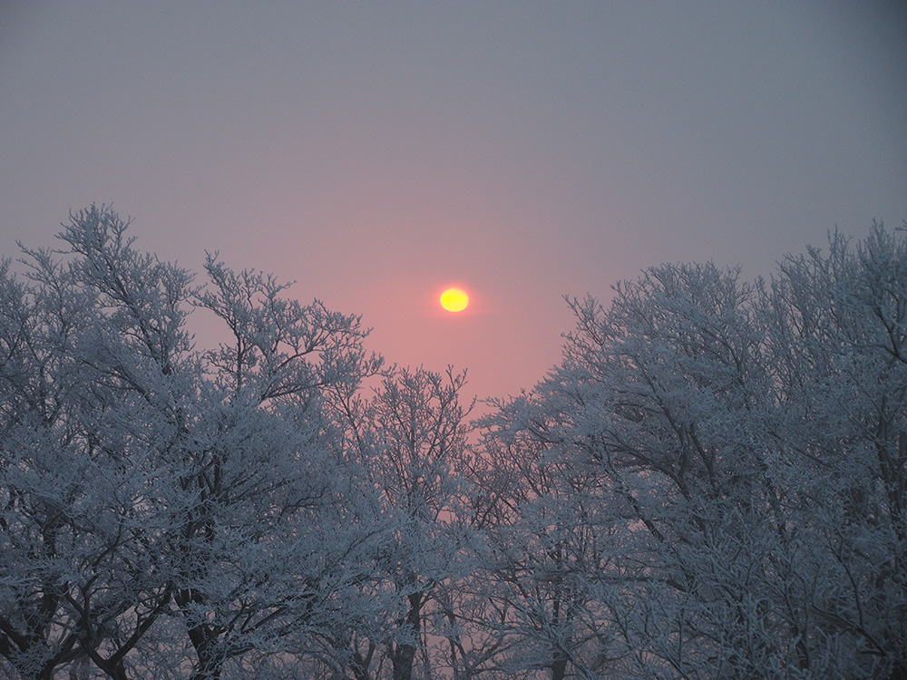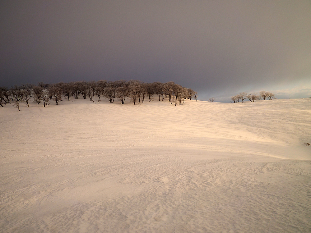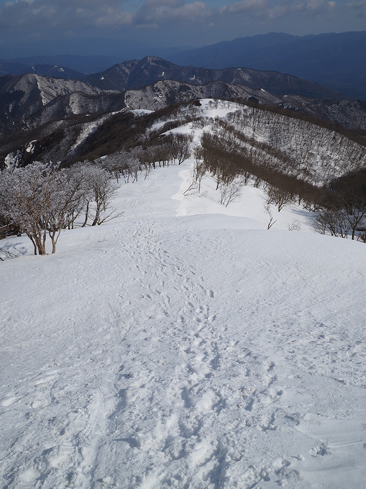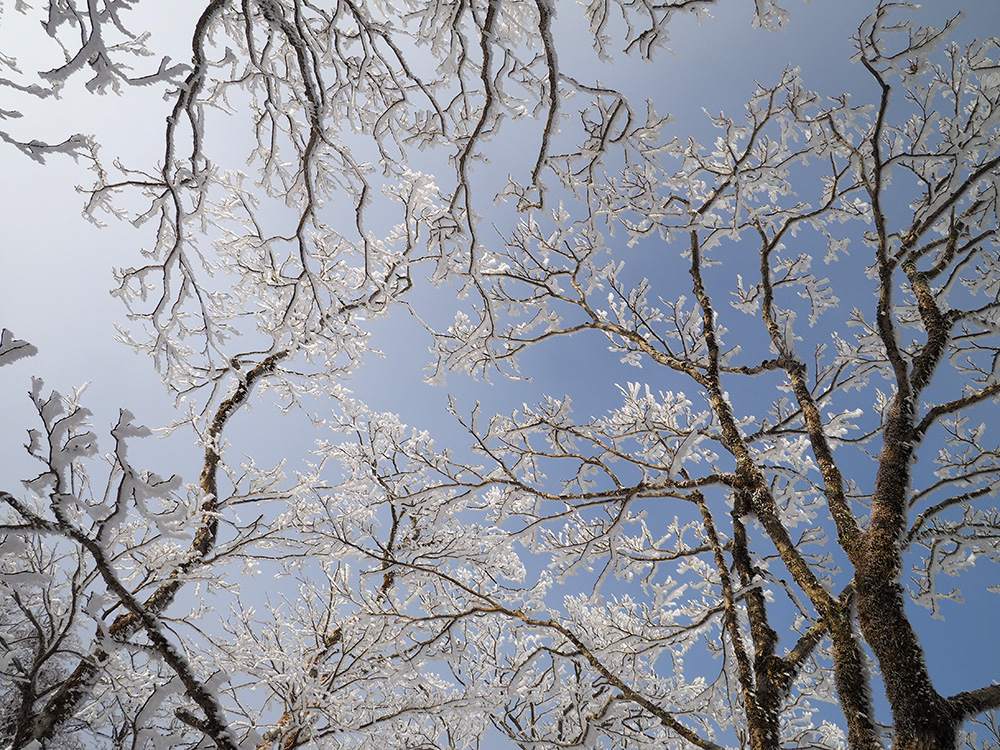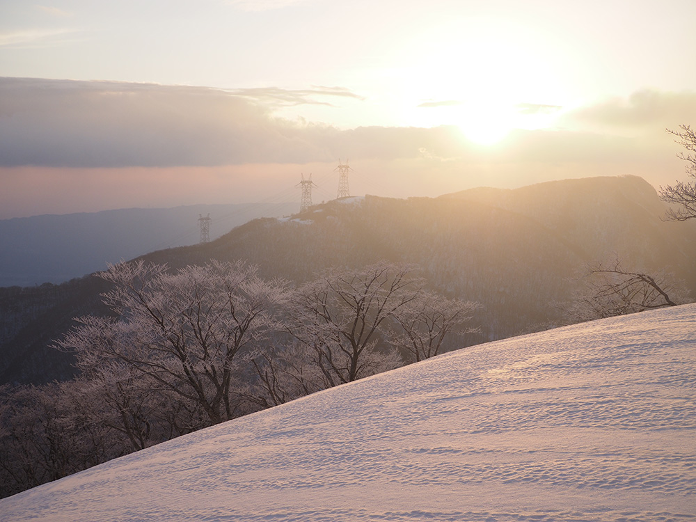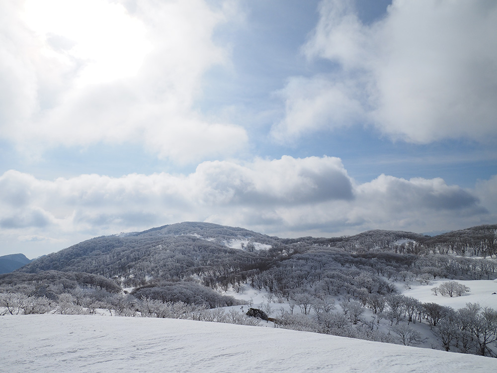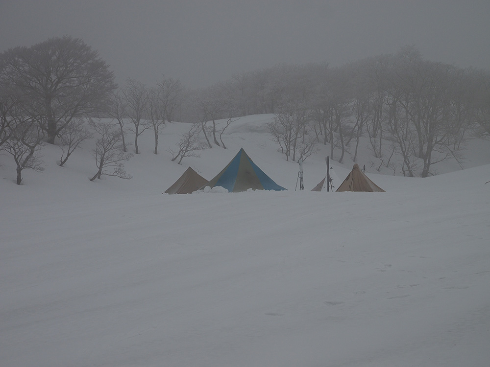 二日目 日の出が見たくて4時間に起きて食事の準備をした。霧氷がフライシートにあたりサラサラと音がしている。霧氷が成長するのはうれしいが、どうもガスのようだ。予報では晴れるようだが、少し気温が上がらないとガスも上がらない。とりあえず6時前にテーブルランドの周回に出かけることにした。 奥の平からの展望を期待したがガスで何も見えなかった。とにかく東端へ行けば視界が開けるかもしれないので、真の谷側を歩いていると、ガスが切れだし、東の方が赤らんできた。チャンスはありそうだ。東端に行くとガスが晴れ朝日が上がってくるところだった。ドリーネのあたりで待ち構えたかったがすでに遅い。中途半端な撮影になってしまったことが悔やまれた。自然相手なので、なかなか思うようにならない。 東端へ行くと単独者が一人散策に出てきた。昨日はT字尾根から登ってきたようで、登ったところにテントを設営したようだ。光と影の黄金タイムが過ぎ去ったので、東端から少し戻ってくると内側の方はまだガスがまとわりついていて、青のドリーネのくぼみすら解らない状態だ。撮影をあきらめボタンブチの方へ向かった。するとテントが三張り。ということは我々を含め今週は3パーティーが入ったということ。 ガスが晴れそうもないのでとりあえずテントのある山頂に戻ることにした。ガスは薄くなってきているので、もう少し気温が上がるのを待つしかない。その間にテントを撤収した。撤収が終わった頃に男女のペアが登ってきた。昨日はカタクリ峠にテントを張ったようだ。 山頂を後にすると青空が広がりだした。ドリーネ撮影のチャンスが巡ってきたが、もう一度戻る気にはなれず、鈴北岳に向かうことにした。鈴北岳へ行くということは、鞍掛峠に降りるということ。山頂へ登ってきたペアの話によると、国道はスノーシューが必要だったと言っていたことが気になった。 鈴北岳まで来ると青空が広がり始めた。何度も御池方面を振り返り風景を楽しいだ。 さて鈴北岳からは、県境縦走路で鞍掛峠に下る。雪の状態がいいので快調に峠までは下れたが、本日の核心はその先にあった。峠から国道までの下りだ。夏道なら20分ほどで下れるが、日当たりの良い斜面は雪が緩み、何度も雪を踏み抜きながらの下りになった。 やっと国道まで降りることができたが、冬季閉鎖の国道はガードレールが埋まるほどの積雪があり、しかも雪が緩んでいて、ワカンを装着して下った。山中ではワカンがお荷物になっていたが、まさか国道で使うことになるとは思わなかった。2時間半かかりやっと国道のゲートに到着し、そこからはタクシーを頼んで大貝戸の登山口に戻った。 | ページ1 | ページ2 | |