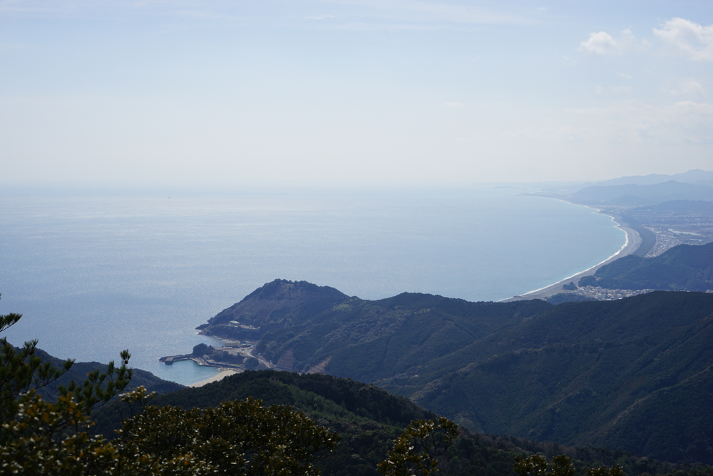 大蛇峰 山頂には三等三角点があり、基準点名は「大蛇峰(だいじゃみね)」で、標高は687.29m。山頂は樹林帯の中だが、南側が樹木が切り払われ展望が開けている。吉野熊野国立公園に指定されている七里御浜を一望できる。しかしこの展望だけではちょっと寂しい。やはり帰りに烏帽子岩に立ち寄ってこそこの山域んkはいいる価値がある。