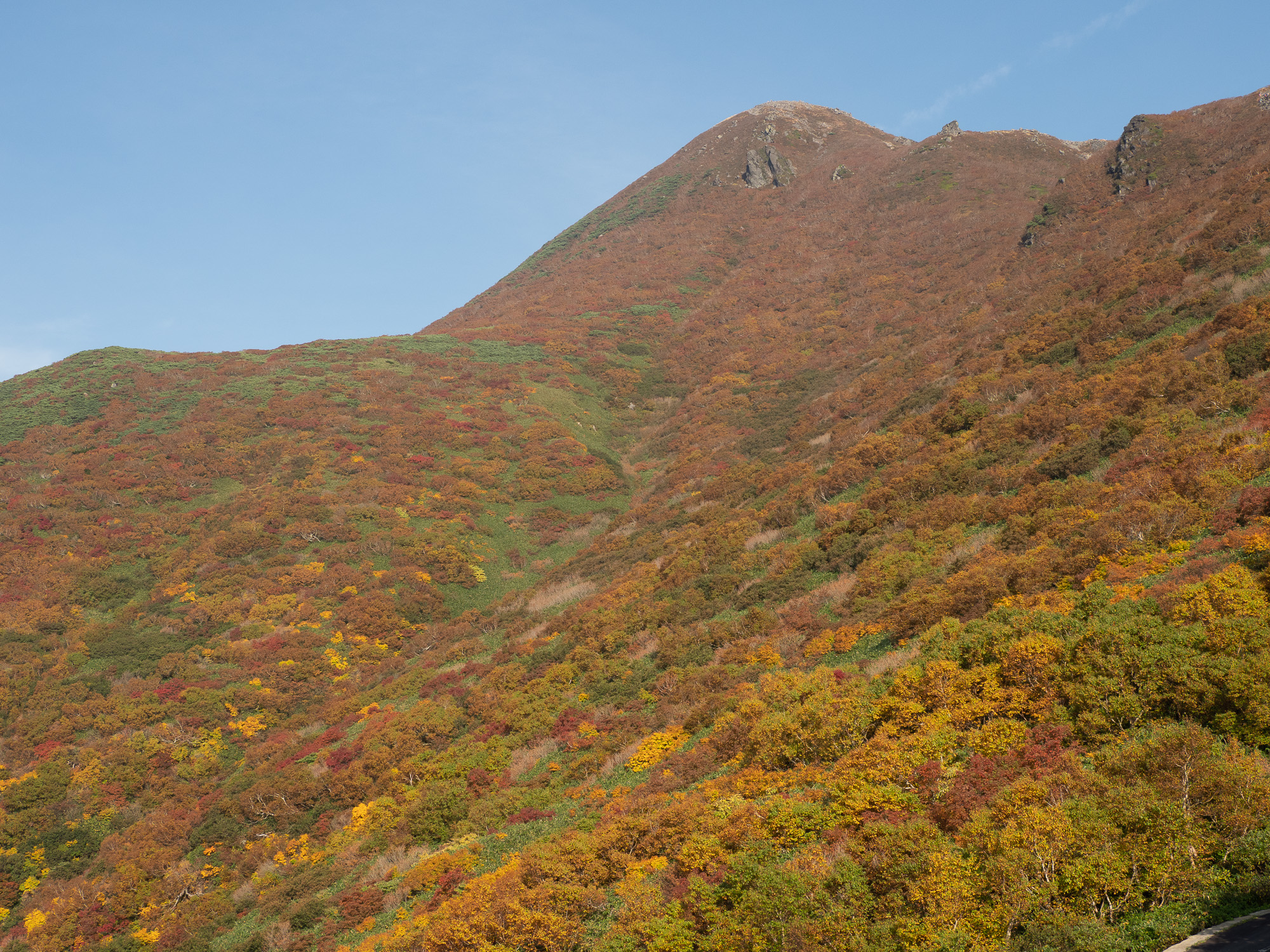 さて帰路は、ルートを変えてスカイラインで下ることにした。8号目の駐車場に降り、1時間半ほどバスを待った。山全体を見るにはこの8号目が最適だと思った。山腹の紅葉が見頃だった。天気にも恵まれいい季節に登れたので、もう一度来ることはないだろう。山麓の嶽温泉でバスを乗り継ぎ岩木山神社に戻った。