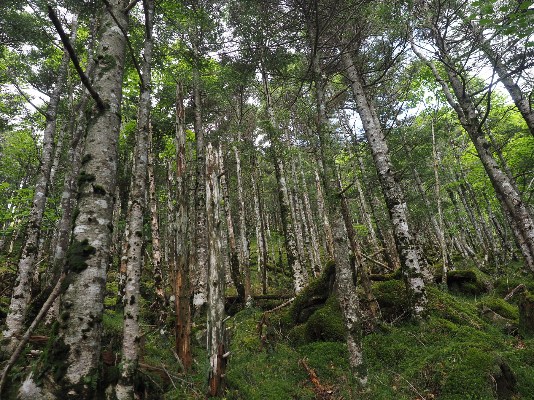 弥山に向け、徐々に高度を上げるにつて、植生が変化するのは興味深い。ブナ、ヒメシャラ、モミからトウヒ、コメツガ、して、1700m以上になるとシラビソ林がなる。シラビソは、亜高山帯の常緑針葉樹で、自然分布の北限が福島の吾妻山で、南限がこの大峰山系だ。先月、大峰の釈迦に登ったが確認できなかったので、この山が南限だろうか。
