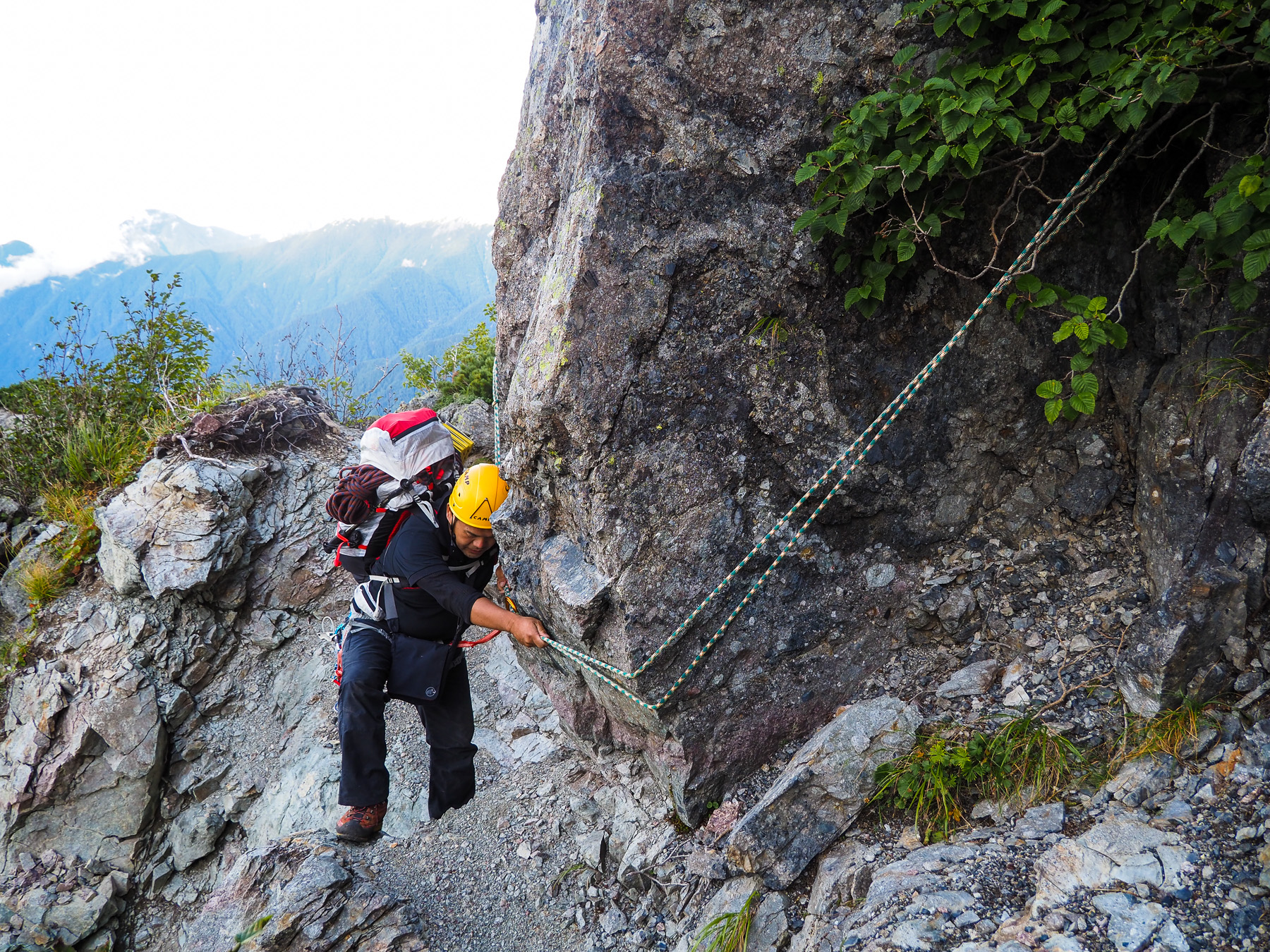 ロープは40mm持っているし、プロテクションもあるので直登したいが時間が無い。一般的なルートでトラバースし、ギャップの手前で主稜に上がった。この間核心は三カ所あるが、難しくはない。ただし、ミスをすると滑落につながる。時計を見ると16時30分を過ぎていた。明日の行程を考えると少しでも進めておきたいが、撮影の出来る敵地があったかどうか、記憶が定かでない。