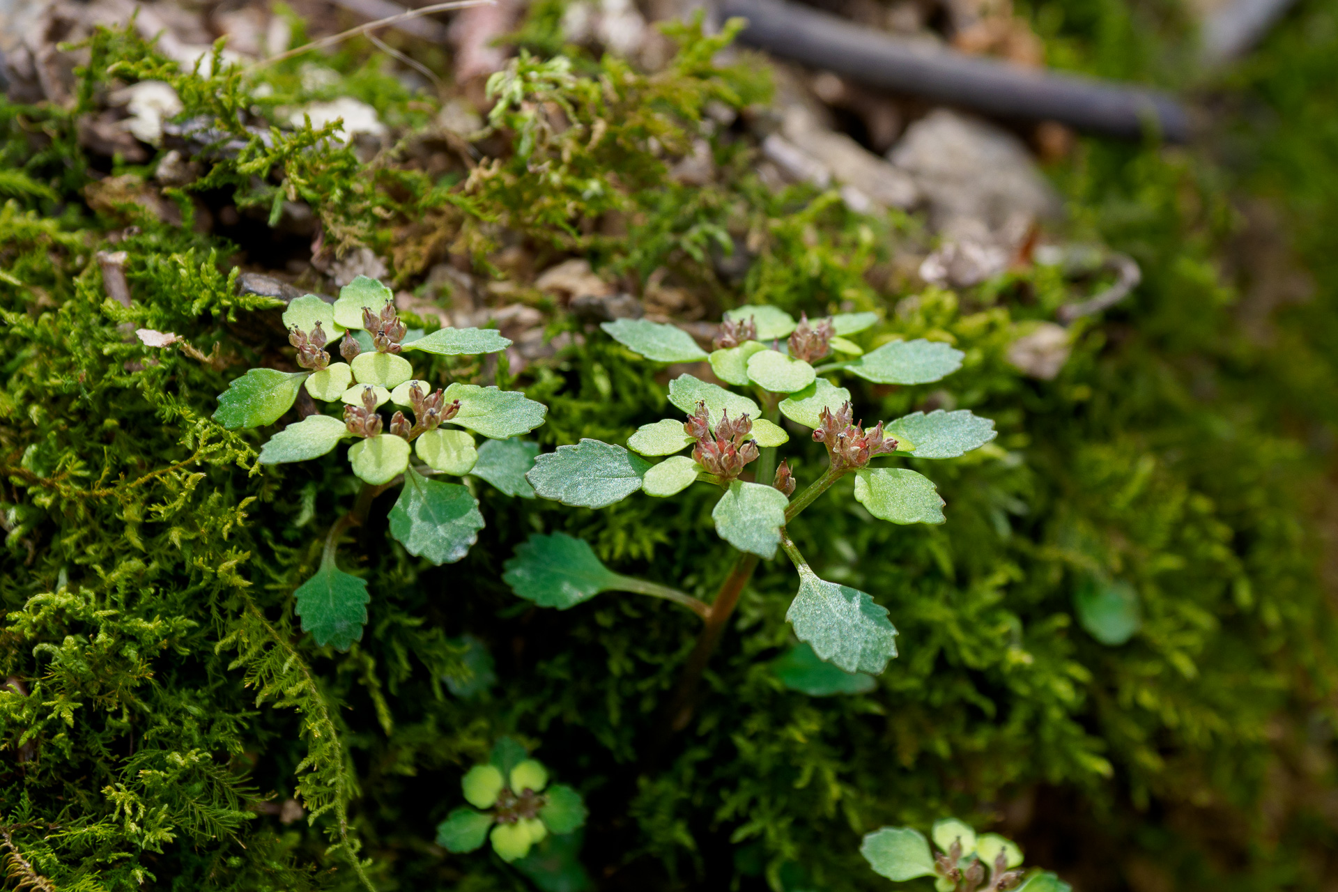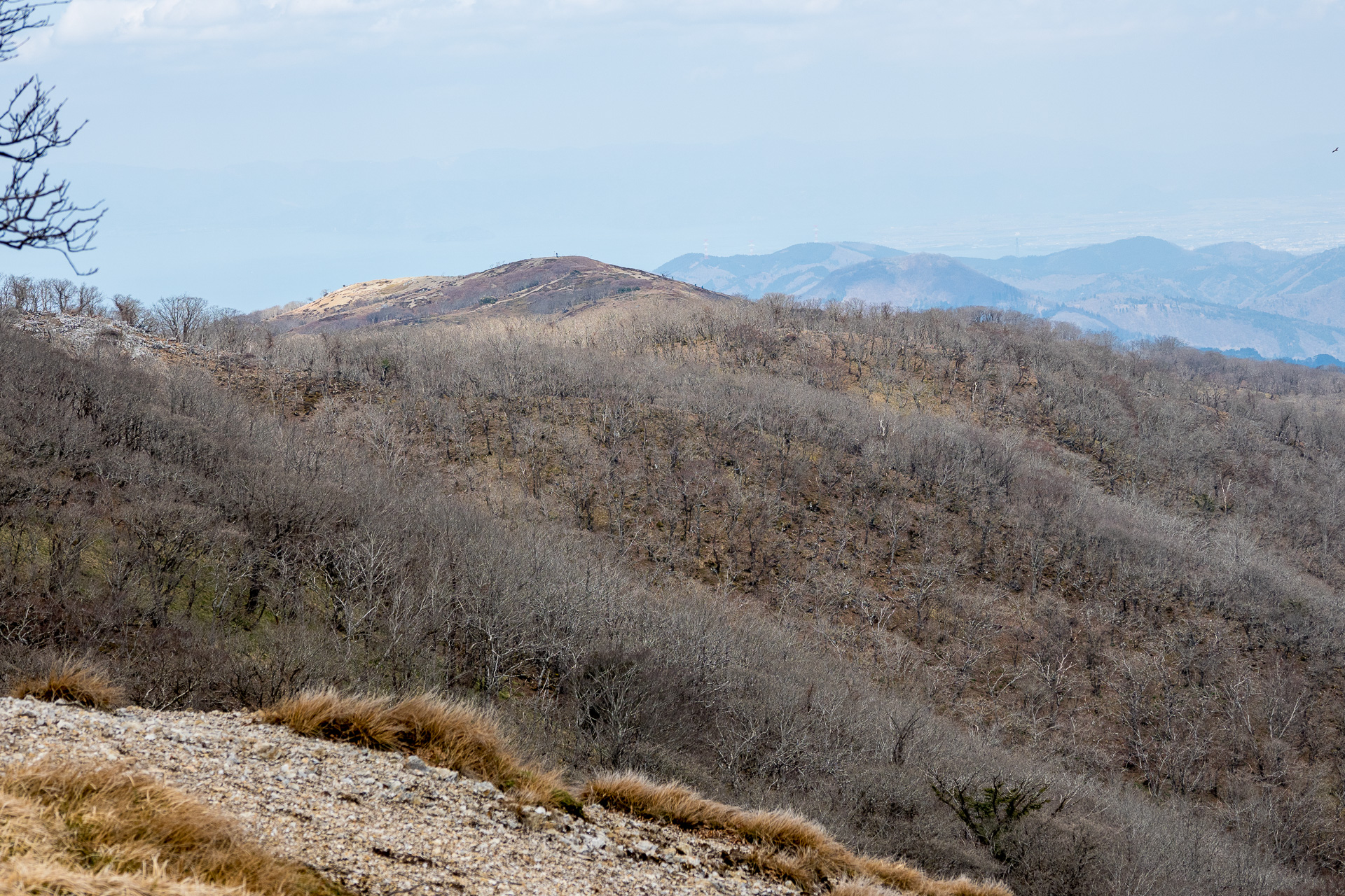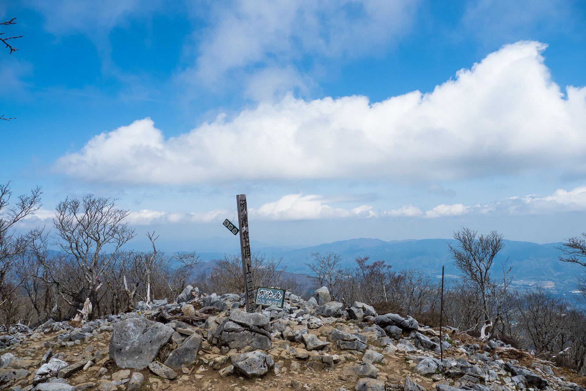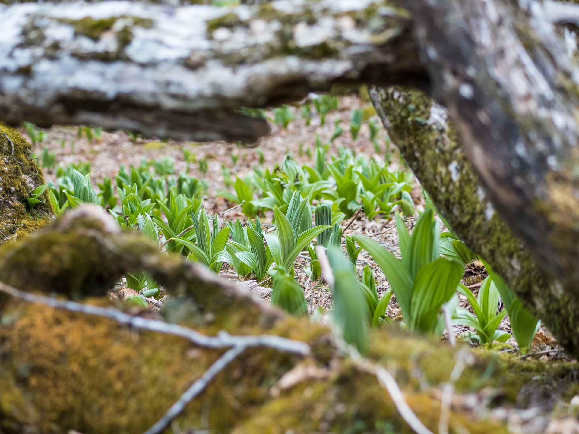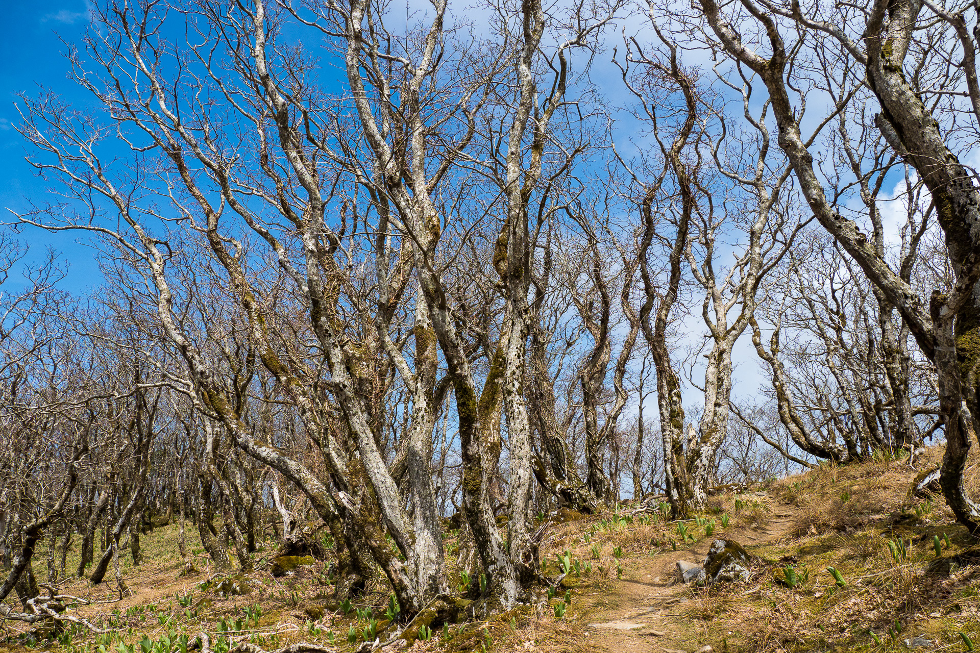 奥ノ平は誰もいなかった。藤原や御在所と比べると登山者はそれほど多くない。イワヒメワラビの葉が茂ると一面が草原状になるがこの時期はまだ冬の装飾だ。陽射しと青空で暖かさは感じるが、低気圧の接近でが出てきた。オオイタヤメイゲツ林の林床にバイケイソウが出始めいよいよ春の始まりだ。少し山頂に立ち寄って下山することにしよう。