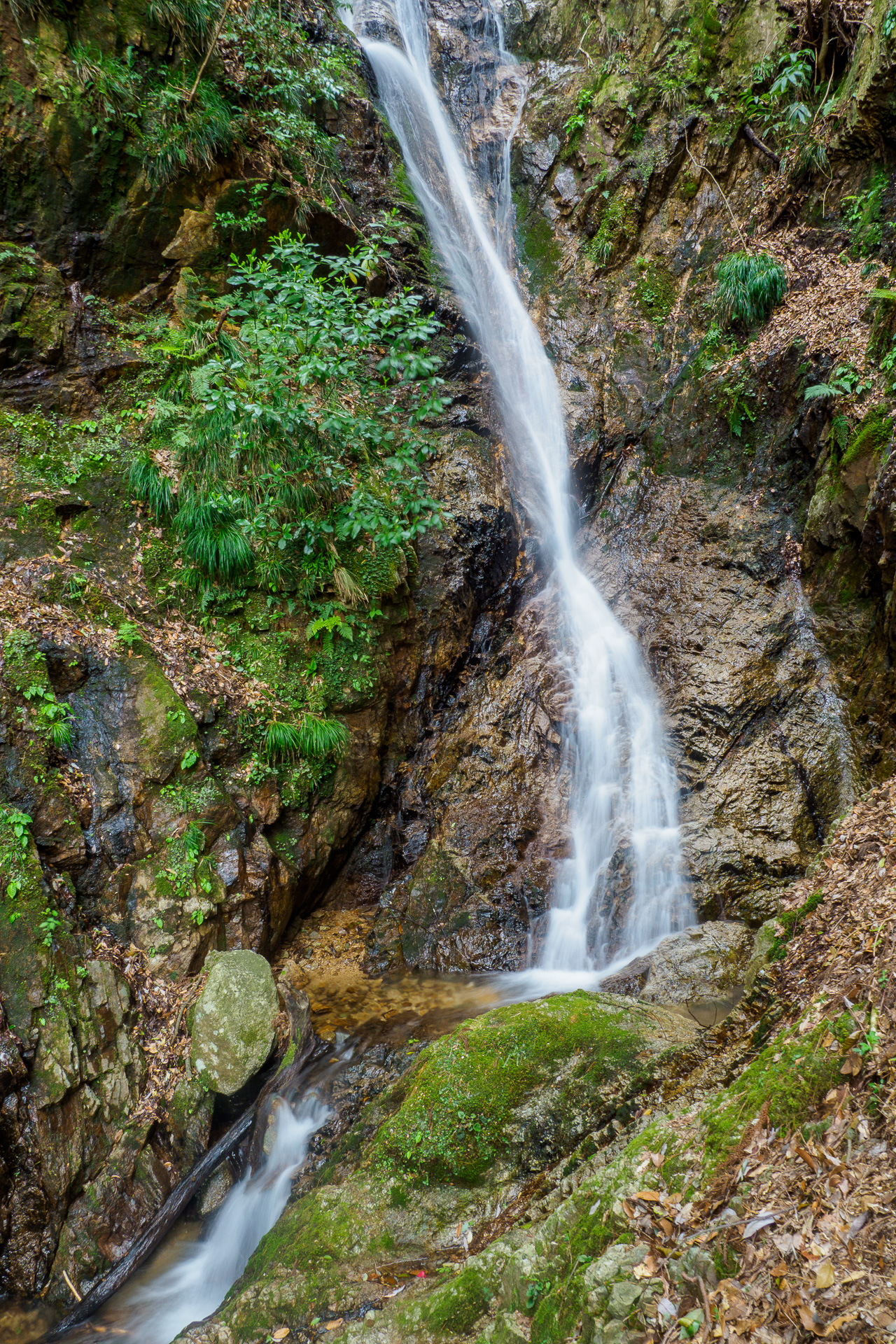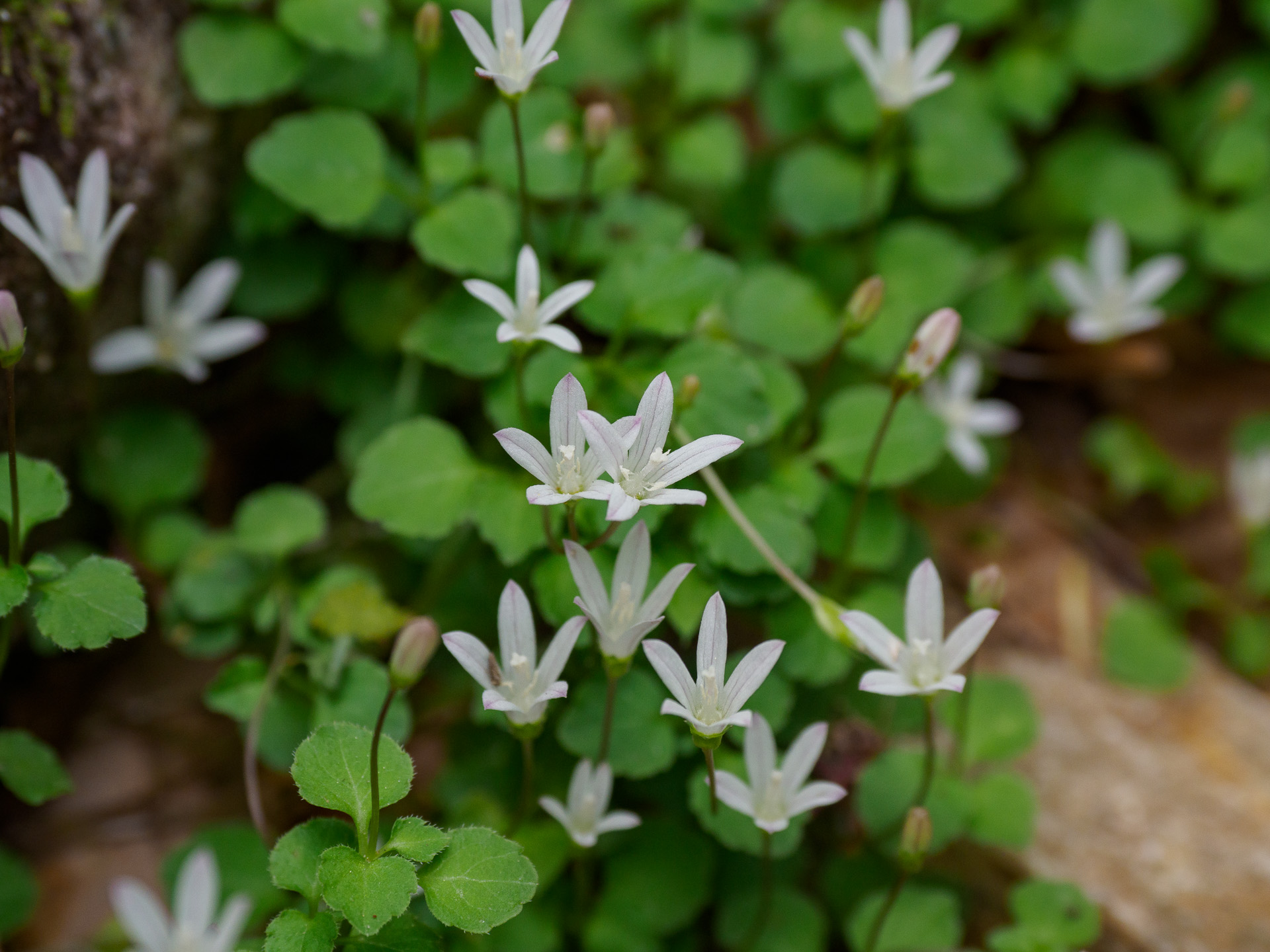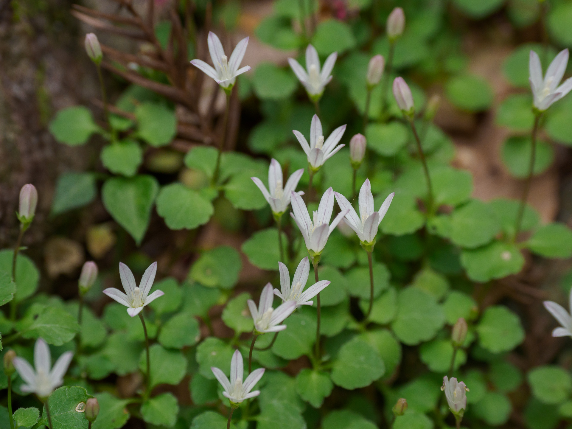 水場からは歩きやすいルートで、気がつくとカズラ滝まで下っていた。谷にはタニギキョウが白く小さな花を開いていた。