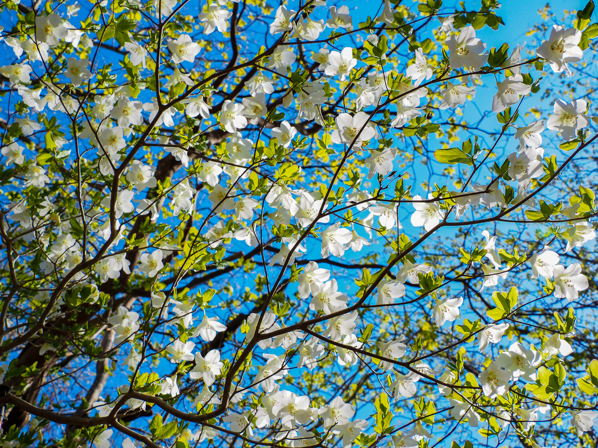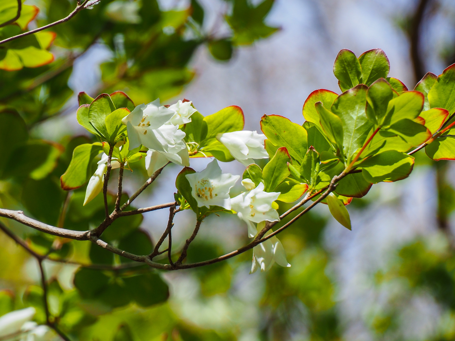 白い花をつけている樹木はアオダモとシロヤシオだ。青空があると白い花が強調され美しい。