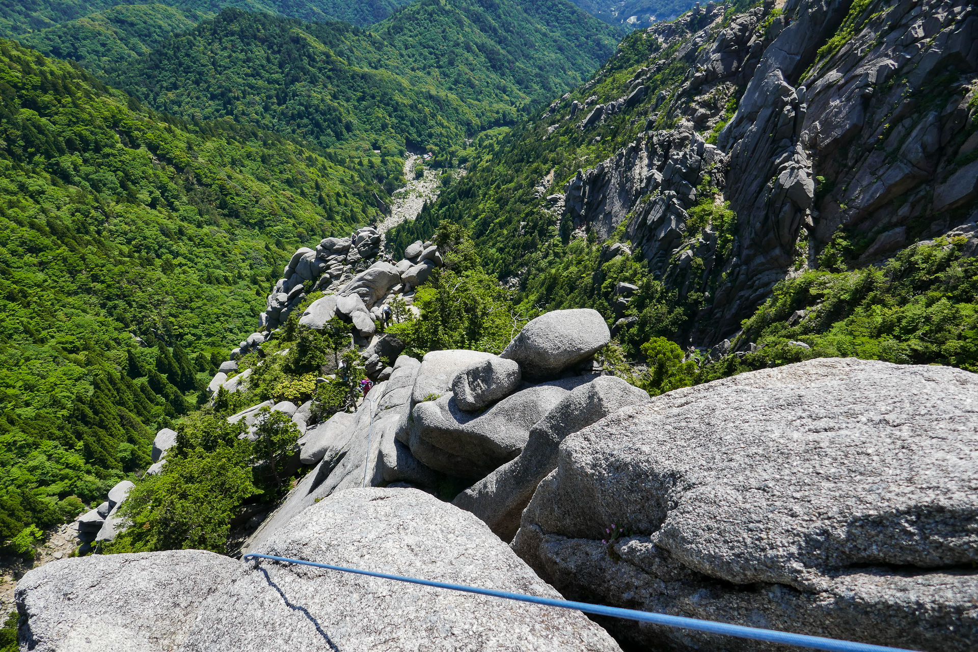 このピッチの北谷側は容易な長いガリー、藤内沢側は滑り台と呼ばれ、スラブ、クラック、フェイスからなり、前尾根の醍醐味を味わえるピッチ。普通、2ピッチで登る。ルート所見で入門レベルのWさんだが、少しテンションはかかったが登りきった。登攀の要素がいくつか詰まったルートなので、無理してでもやった方が上達早はくなるだろう。