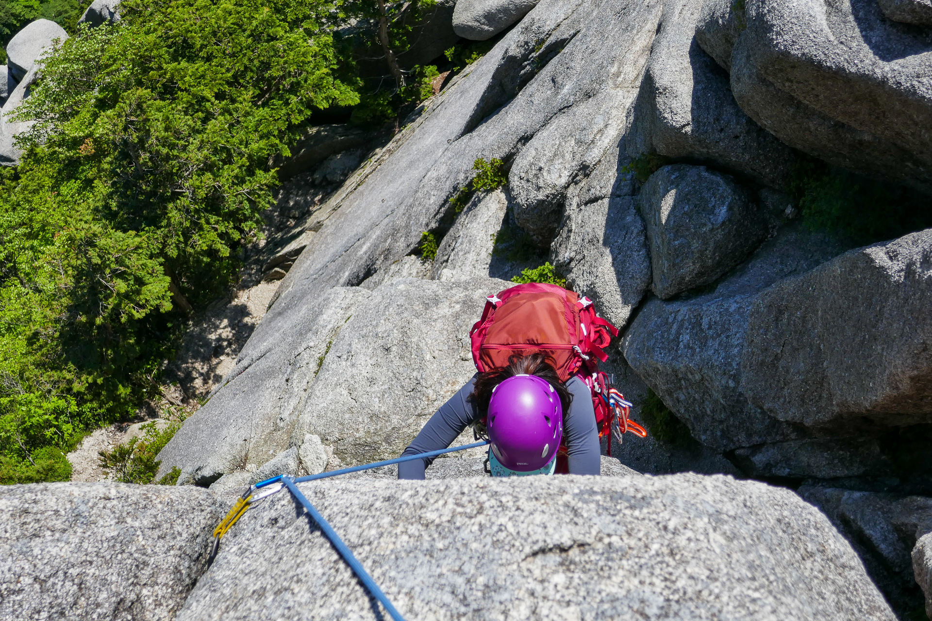 P2は25mと短いが、クラック、フェイスクライミングが楽しめる。核心は後半のフェイスの立ち込みで露出感と高度感でなかなか思い切りができない。最初のトライはテンションをかけたが、足を高く上げて見事成功。足を上げるといいことがあることが学習できた。二人パーティーだったので、P5からP2まで待ったなしで一気に登ることができた。