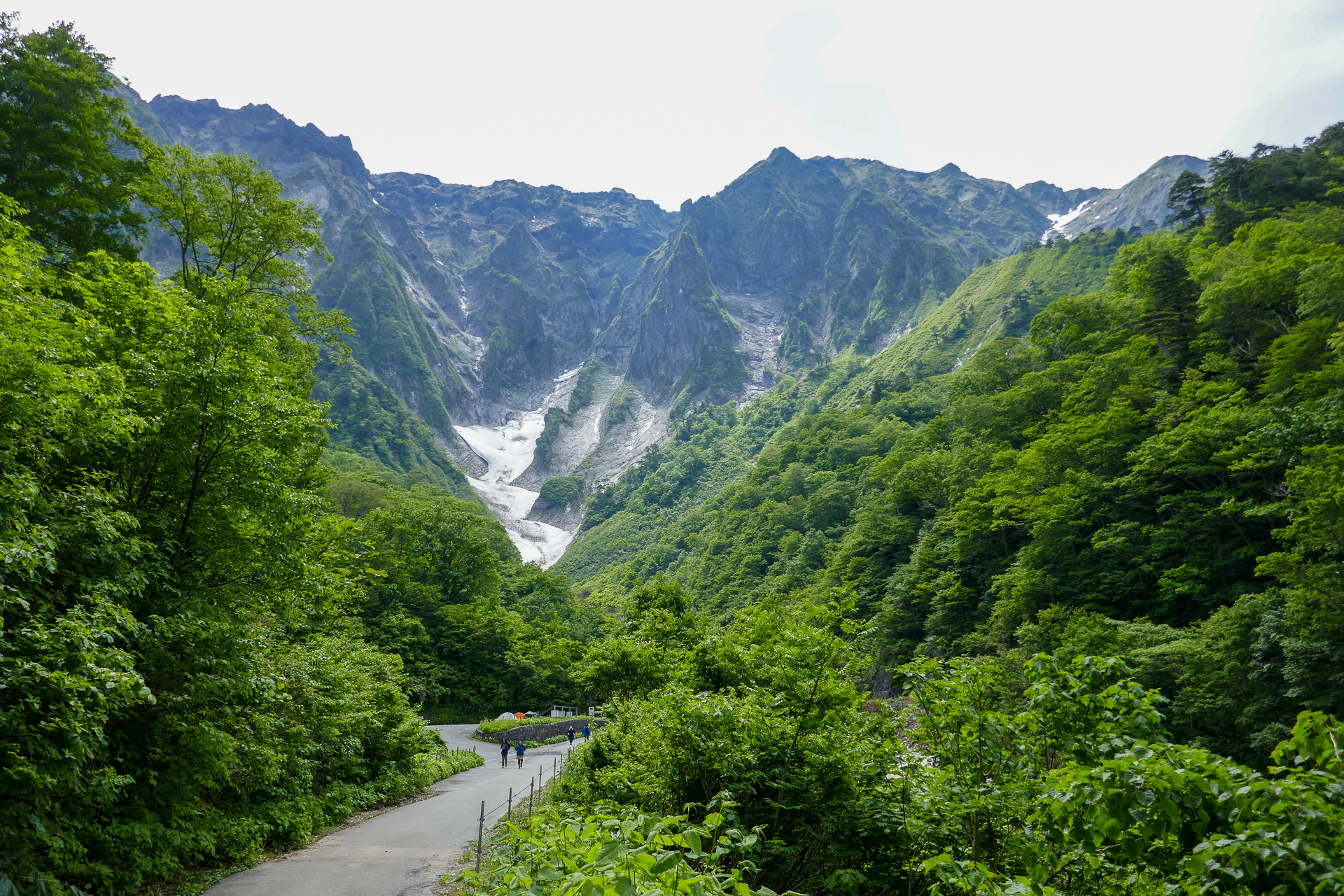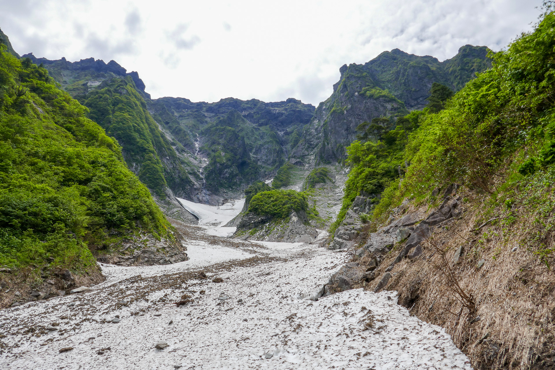テールリッジはベニサラサドウダン、アオダモなどの花が見られた。ベニサラサドウダンは面白い。鈴鹿のベニドウダンとサラサドウダンをかけ合わせたような色と形をしている。雪渓に降りると両岸の草付き斜面にシラネアオイとサンカヨウ、キバナノコマノツメが咲いていた。シラネアオイは特に、日本海側で見られる花なので中部圏の我々にとってはとてもめずらしい花だ。