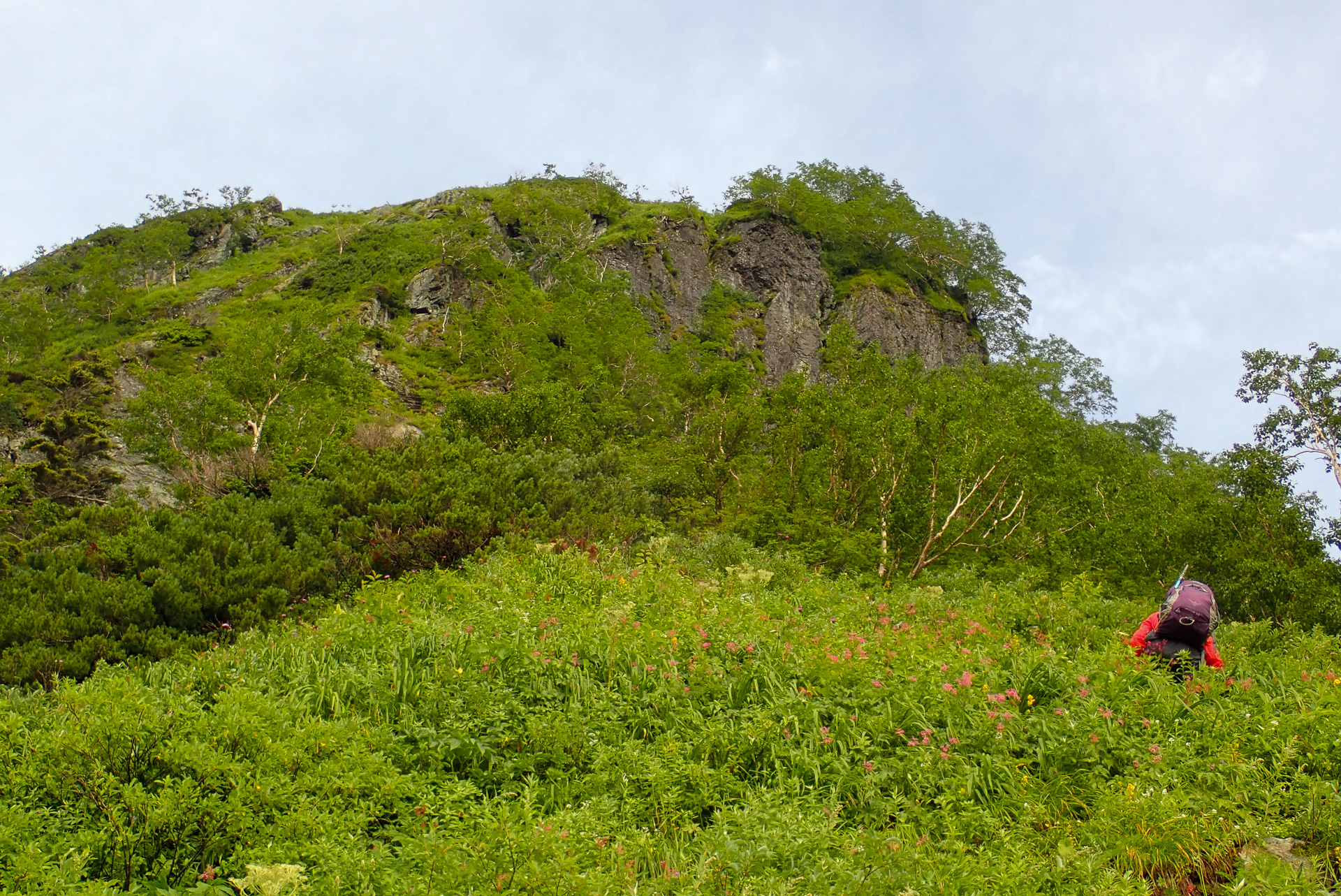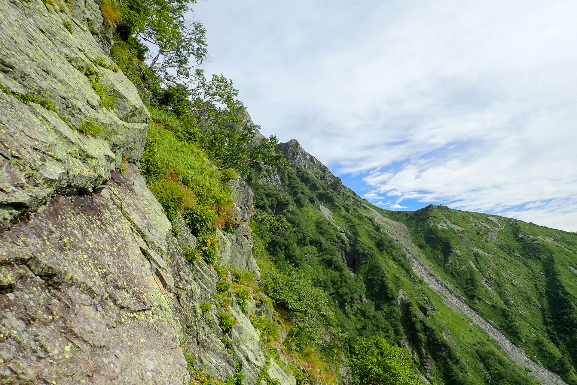 岩場は岩峰登攀というほどではない。それより草付きの急斜面が厳しい。草を掴むが力はかけられない。両手足に力を分散しソフトタッチのホールド、スタンスが求められる。こんなところはアックスとアイゼンが武器になるかもしれない。スタイルにこだわってはいけない。あらゆるものを使って登る、山の総合力が試される。