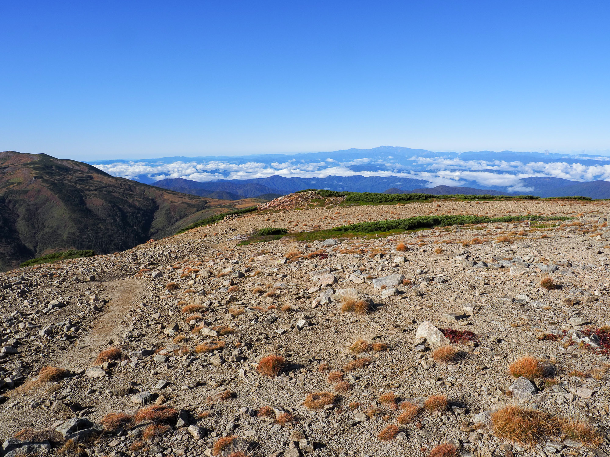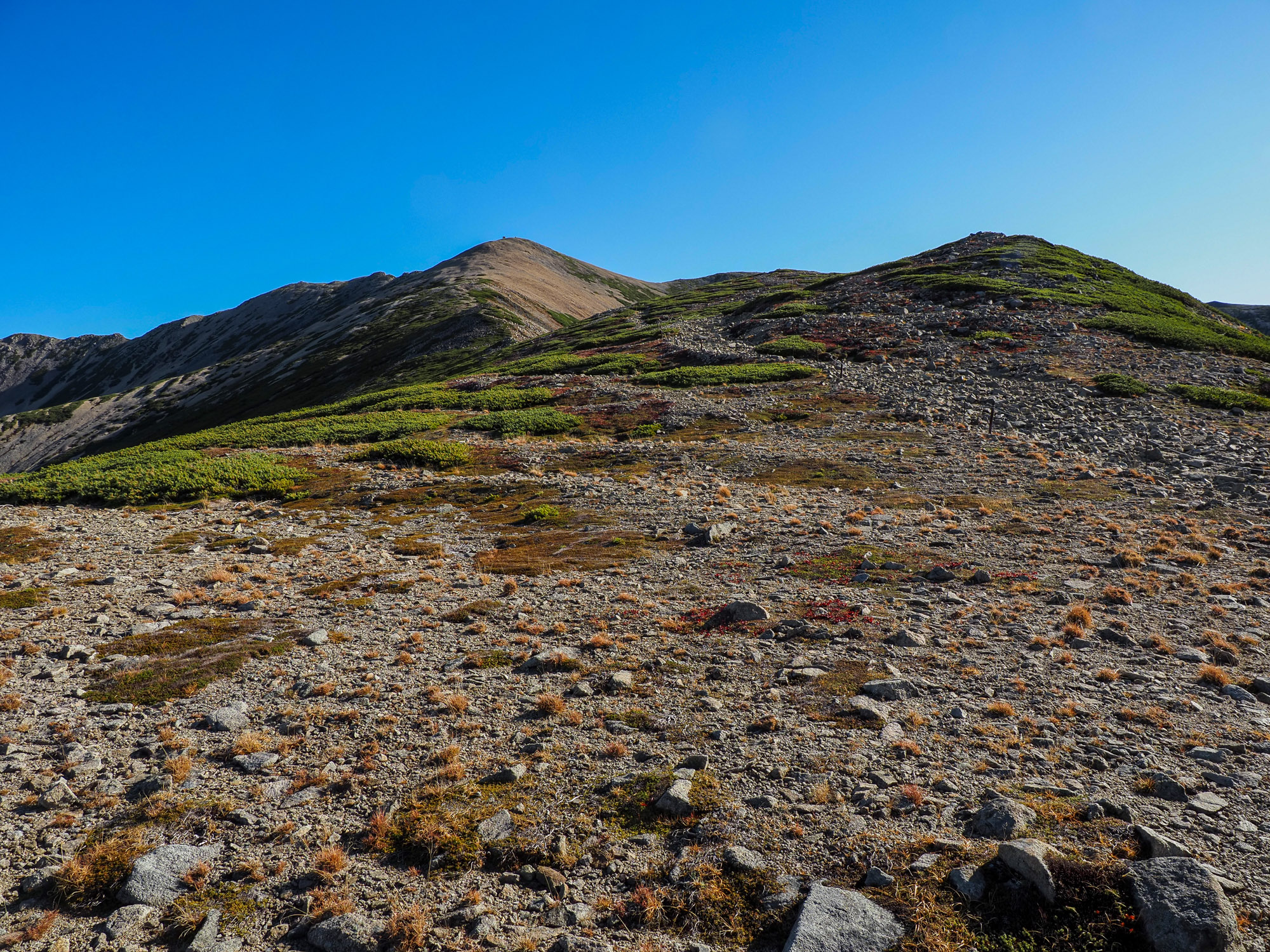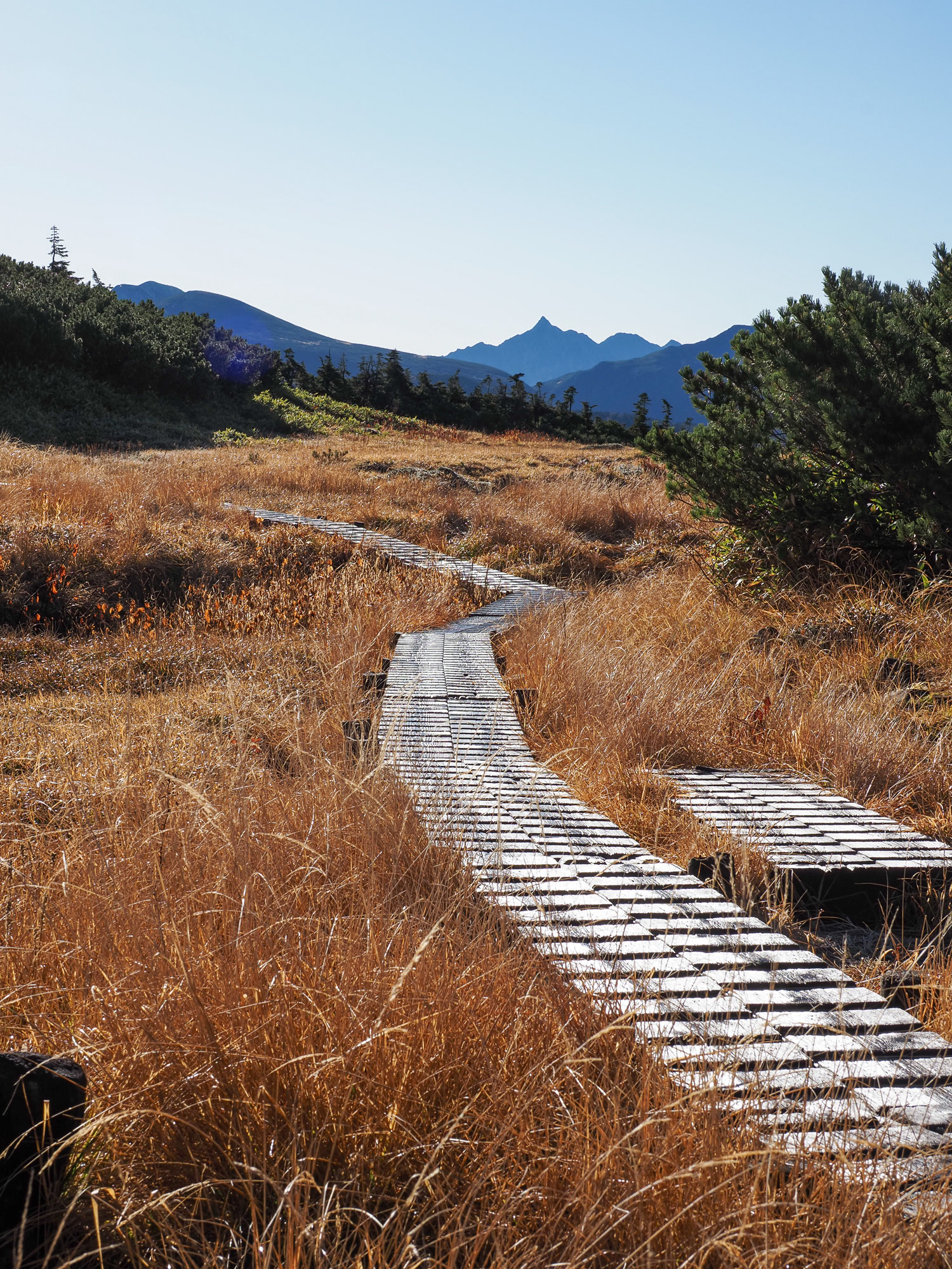 昨夜2:30からの星景撮影が終わり布団に入り目覚めると5:30だった。朝食は6:00からで温かい味噌汁とご飯がうまかった。準備を整え不要な荷物を小屋で預かってもらい6:30に出発した。山頂までのコースタイムは3h20mなので往復後、下山の時間を含めても多少のゆとりがある。しっかりと撮影しながら楽しむことにした。もう一組の二人組は今日、黒部五郎に行くそうなので、薬師は我々だけだった。