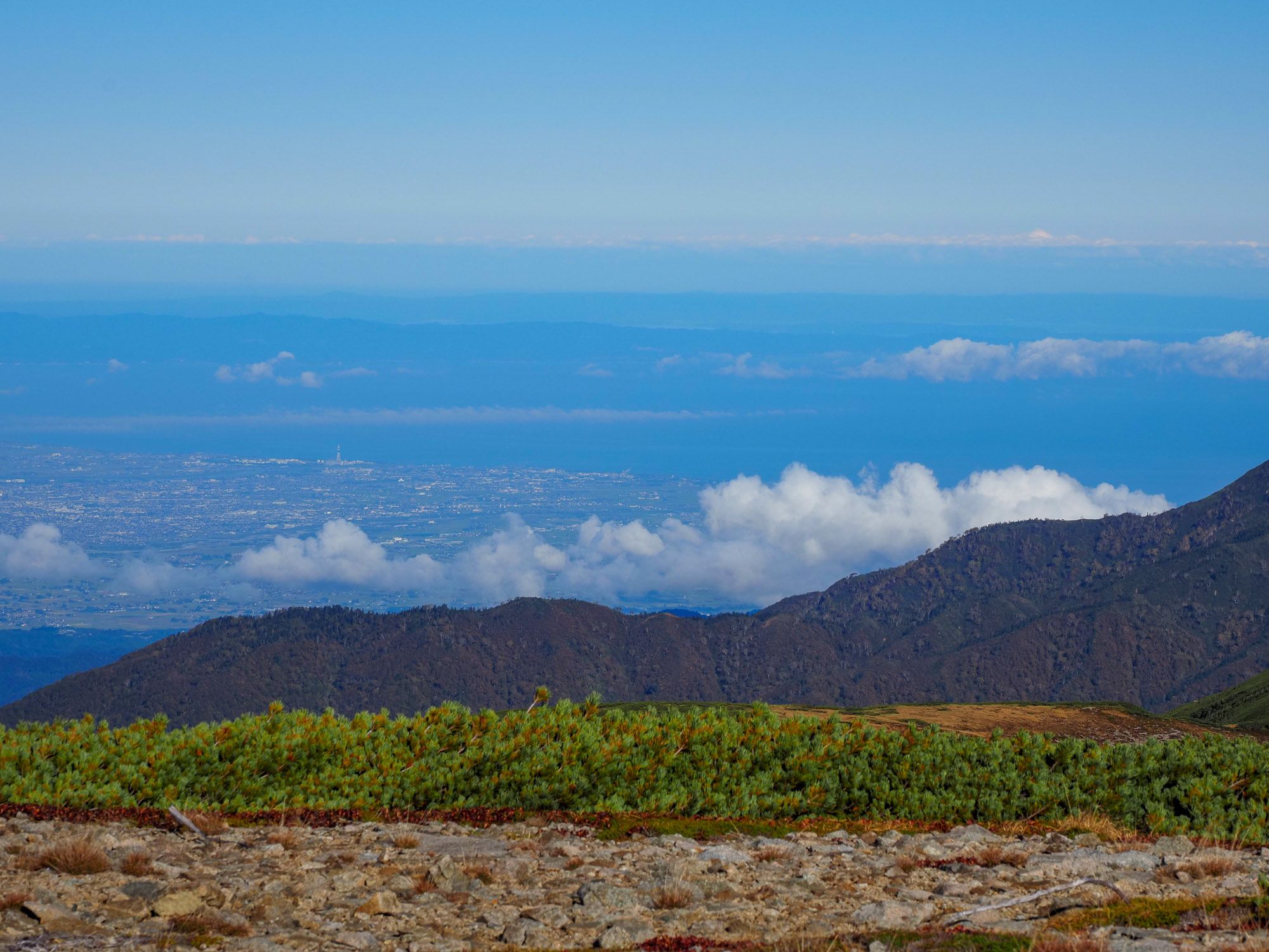 薬師平に上がると展望が開け開放的にな雰囲気になる。この時期花はないが、クロマメノキやチングルマの紅葉が綺麗だった。山頂に興味を示さないうさぎは、ここで展望楽しみ引き返すようだ。クロマメノキの実が気になるらしい。