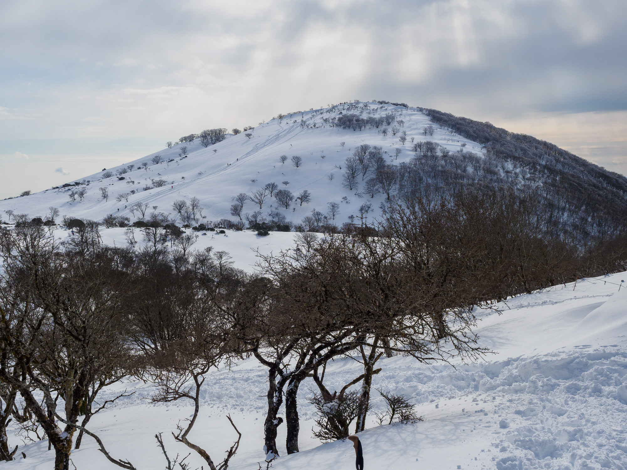 4合目くらいまで登ると膝上まで積雪していた。先人のラッセルに助けられ、冬装備のテントの重さ以外は、苦もなく歩きやすかった。8合目あたりから雪が閉まりだし、気持ちよく歩ける。例年このあたりからラッセルが大変になるが、トレースがあり楽をさせてもらった。