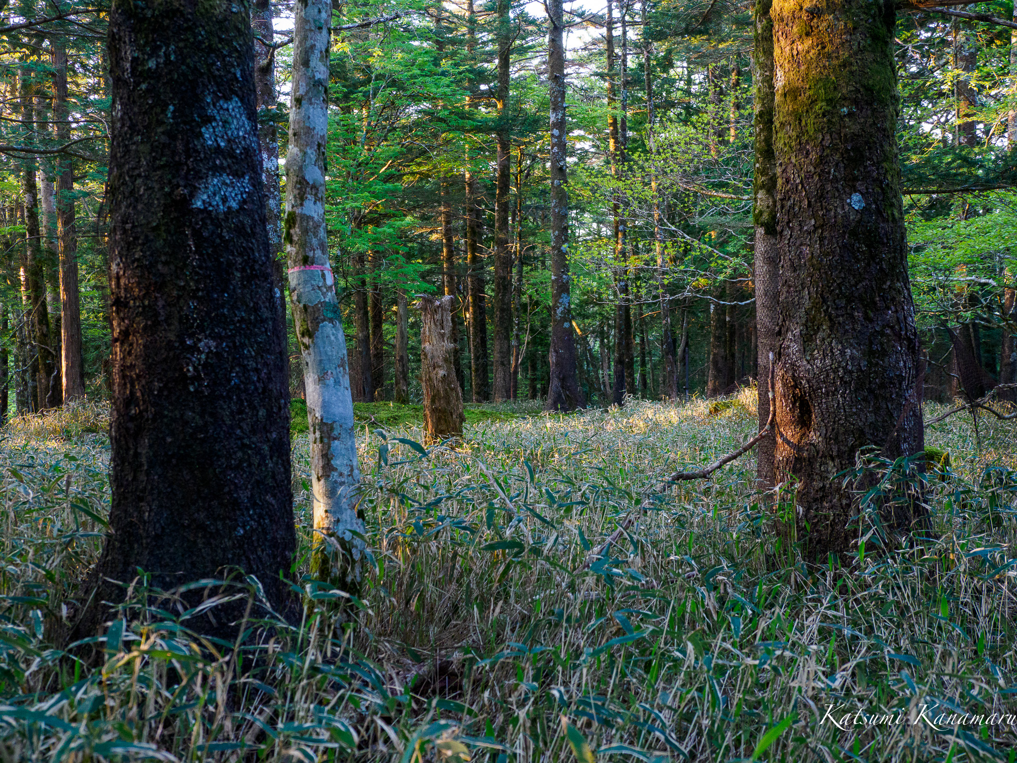 5時過に駐車場を出た。朝が早いので朝食はお弁当にしてもらった。歩き出すと朝日が樹林に咲き混んできた。林床に繁茂するミヤコザサ、スズタケが穂のに見える。オオイタヤメイゲツ、ブナ、ミズナラなどの新緑が鮮やかだ。平日だし、この時間から歩き始める登山者はいなかった。耳を澄ませ、鳥の鳴き声を聞きながら歩いた。ミソサザイが朝から活発で、早速、写真を撮らせてくれた。早朝、光量が少ないので、SSとISO感度の値をどの辺で折り合いをつけるかが難しい。尾鷲辻で朝食のお弁当を食べた。