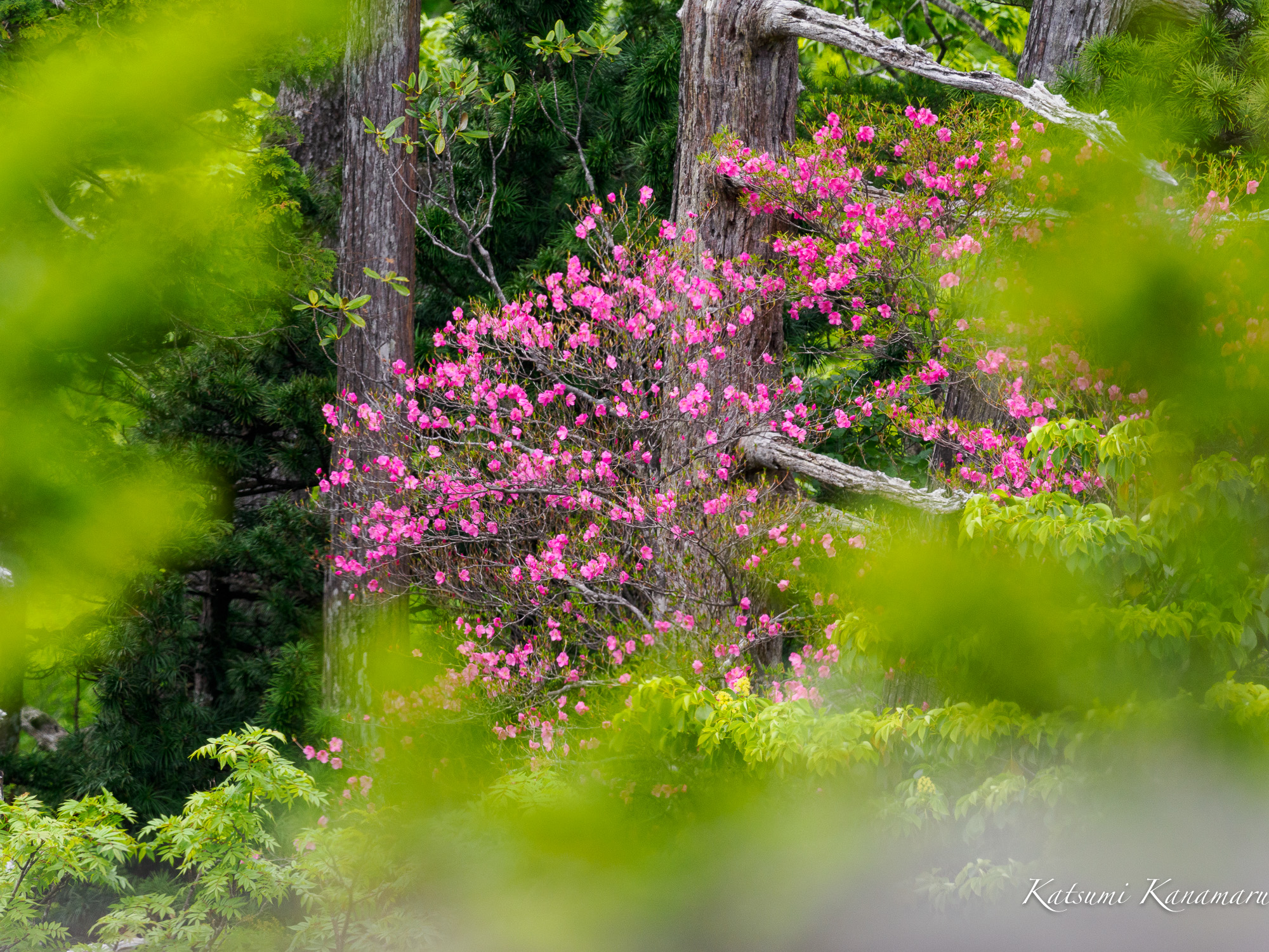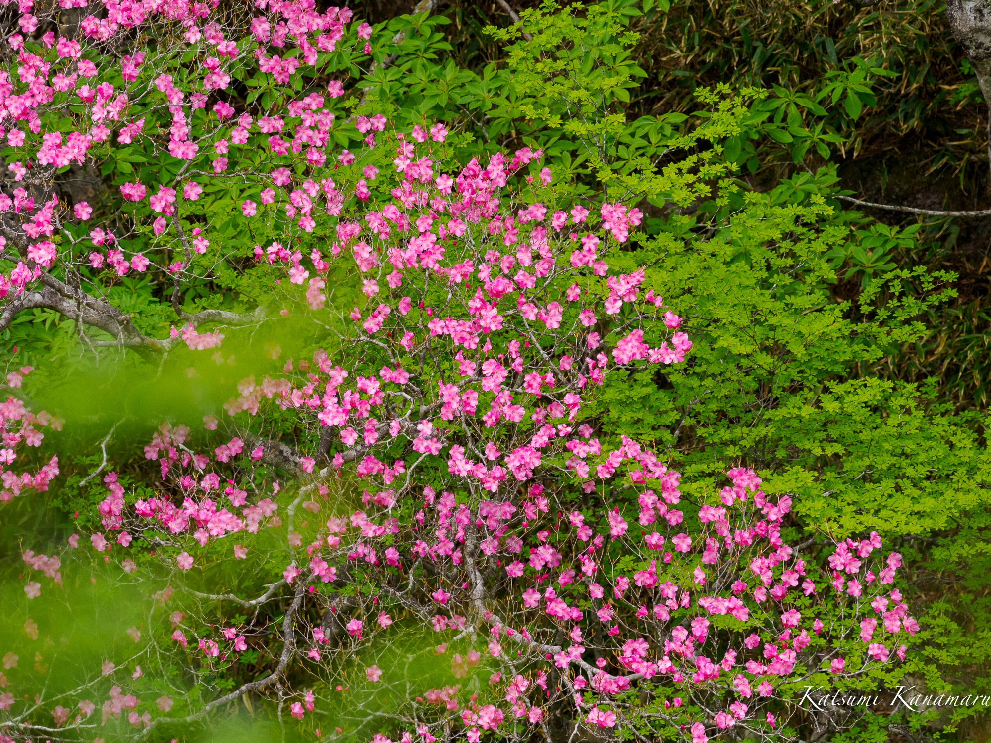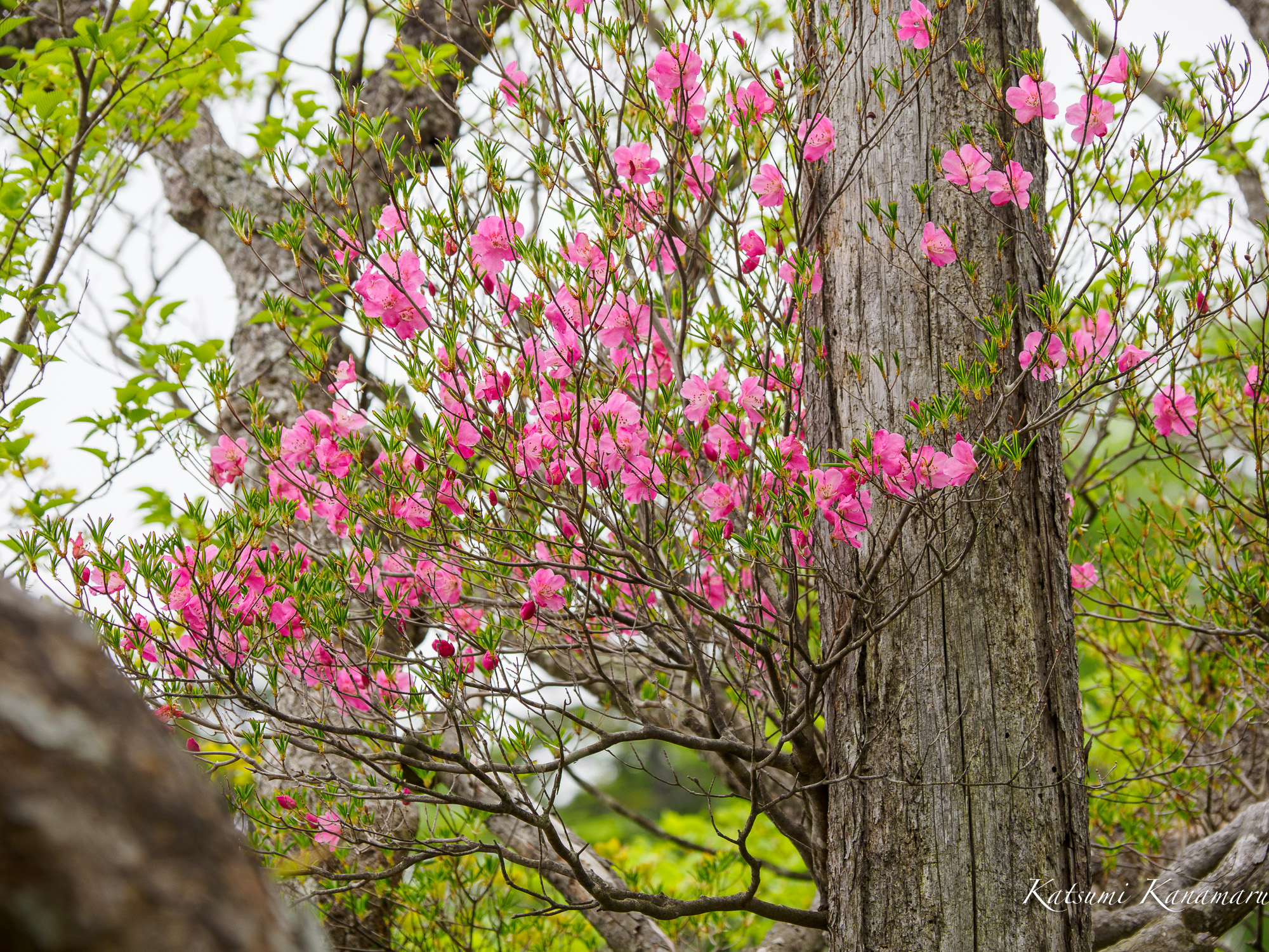 大蛇嵓付近は地形的に厳しくなる。断崖は桟橋や切り通しで、大蛇嵓はトンネルで抜けようとしたらしい。このトンネル工事を請け負ったのが藤村組だったようだが、四日市製紙側の資金のやりくりで工事が中止になったようだ。蒸籠嵓のとんえるも同じだ。蒸籠嵓の登攀レポートを参照する。トンエルの上の斜面を登ると大蛇蔵の登山道に合流した。アケボノツツジ、シロヤシオの花が見頃だった。