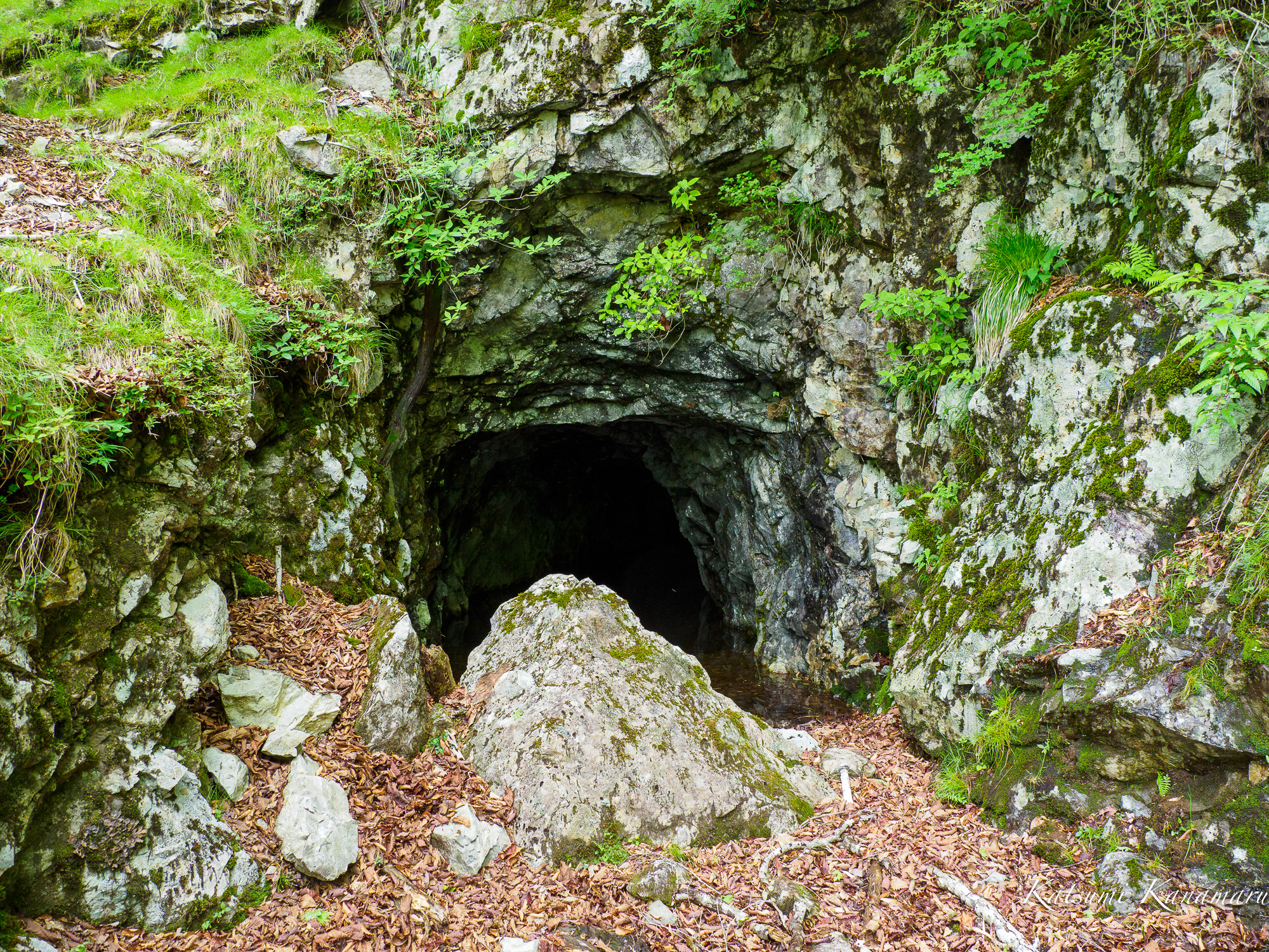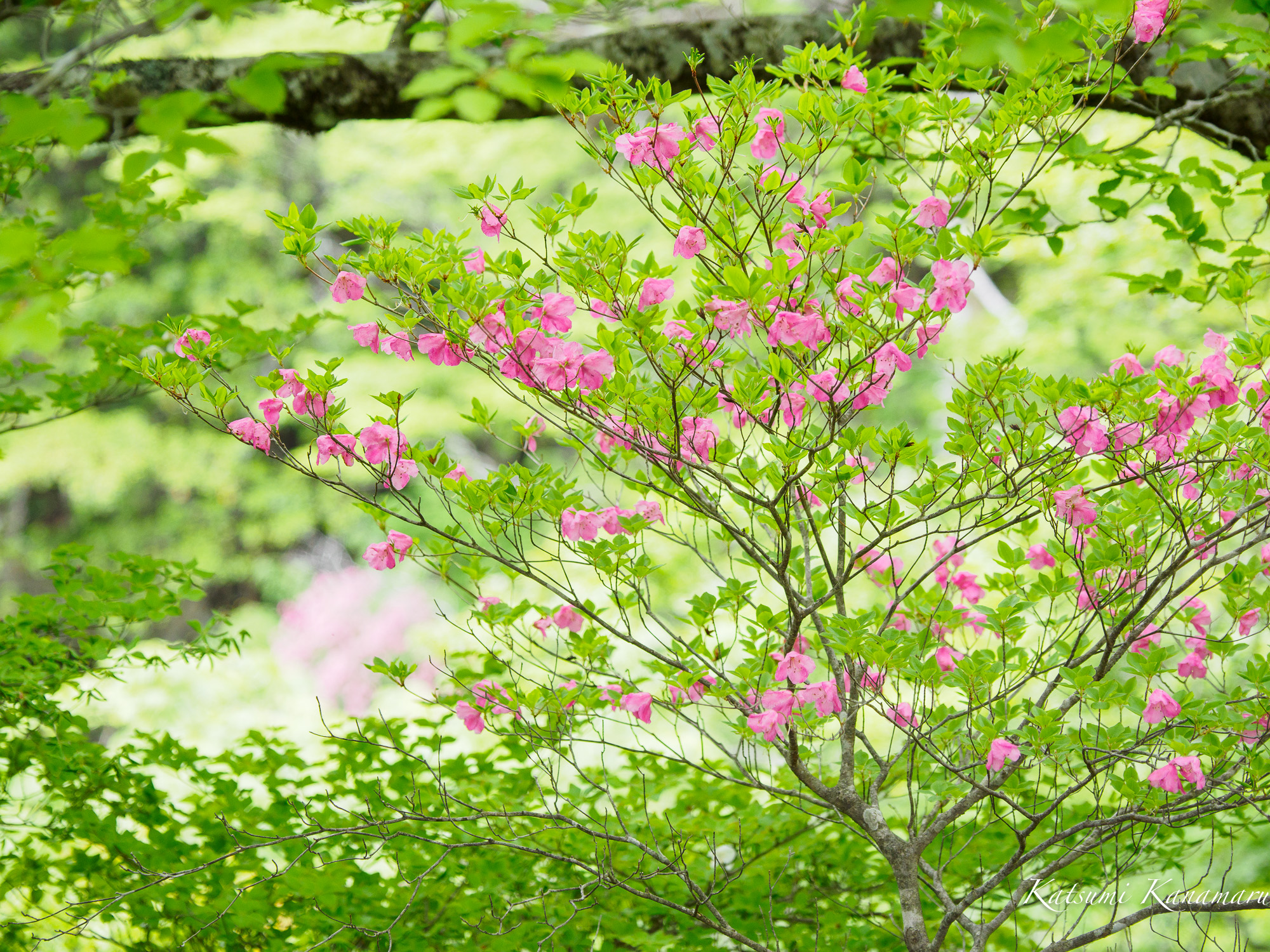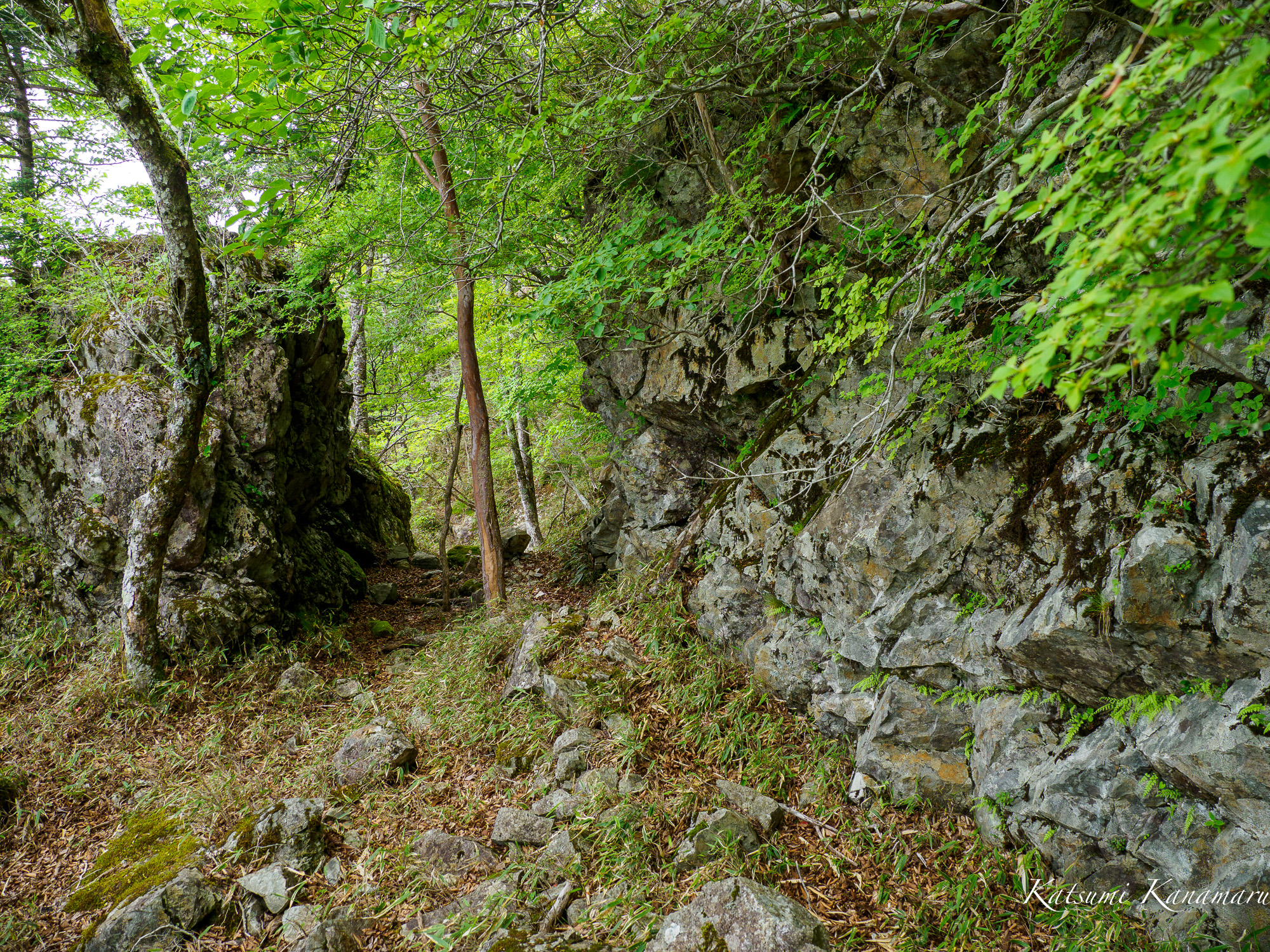 大蛇嵓付近は地形的に厳しくなる。断崖は桟橋や切り通しで、大蛇嵓はトンネルで抜けようとしたらしい。このトンネル工事を請け負ったのが藤村組だったようだが、四日市製紙側の資金のやりくりで工事が中止になったようだ。蒸籠嵓のとんえるも同じだ。蒸籠嵓の登攀レポートを参照する。トンエルの上の斜面を登ると大蛇蔵の登山道に合流した。アケボノツツジ、シロヤシオの花が見頃だった。
