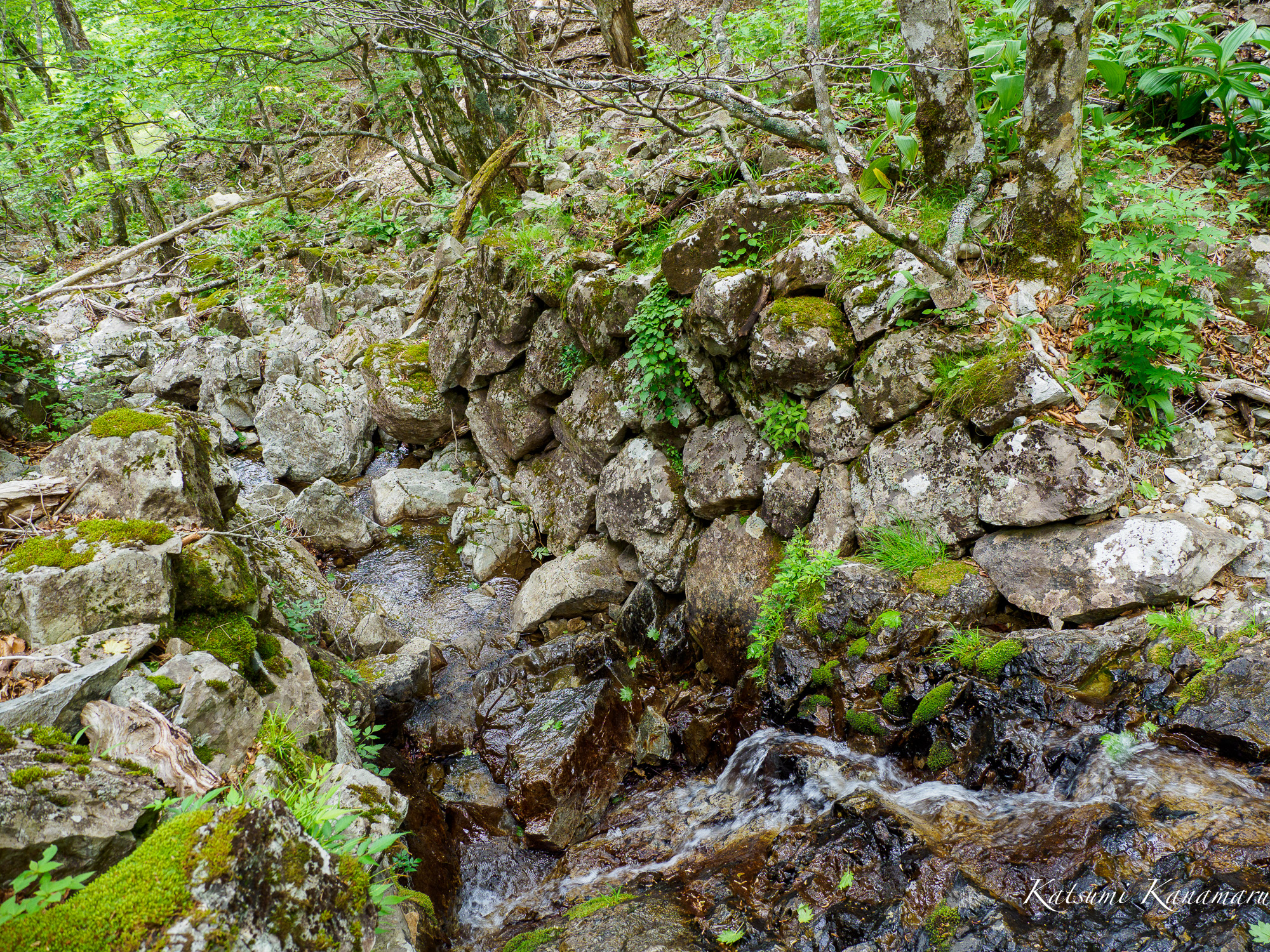 大蛇嵓、蒸籠嵓の隧道工事は中止になり山手線は、斜面の途中の白崩から牛石が原、元木谷へインクラインが通された。地点の白崩は白崩谷の源頭付近にあり、木材の集積場になってようだ。書籍「三重の森林鉄道」に当時の木材集積場の写真が掲載されており興味深い。