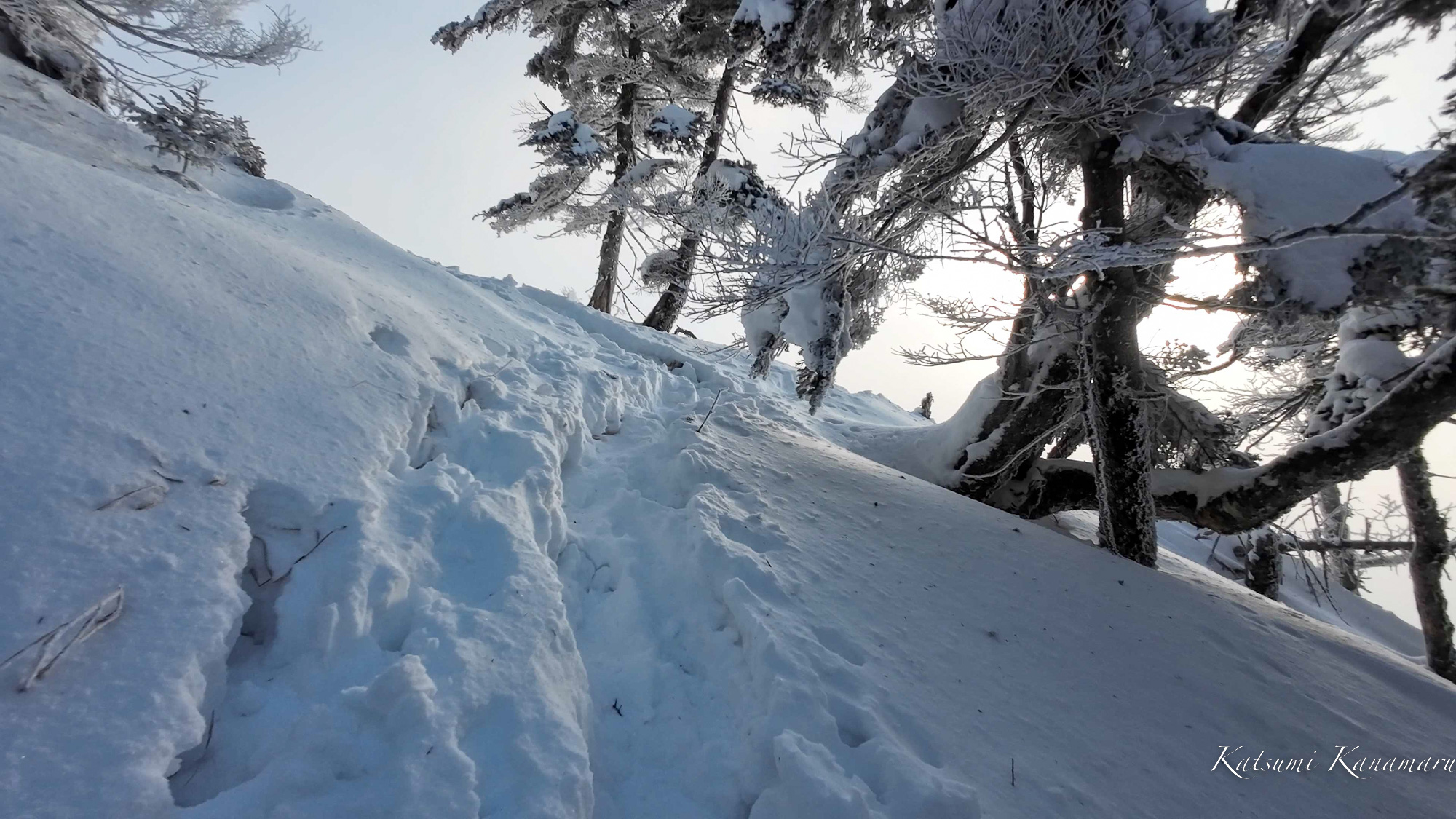 薊畑に上がると一気に展望が開けた。樹氷が素晴らしいが、ガスと強風で状況が一変した。身が引き締まる。これに負けないように気持ちのギアを一段上げる。スノーシューを装着し戦闘態勢に入った。小聖までのコースタイムで成否が決まる。