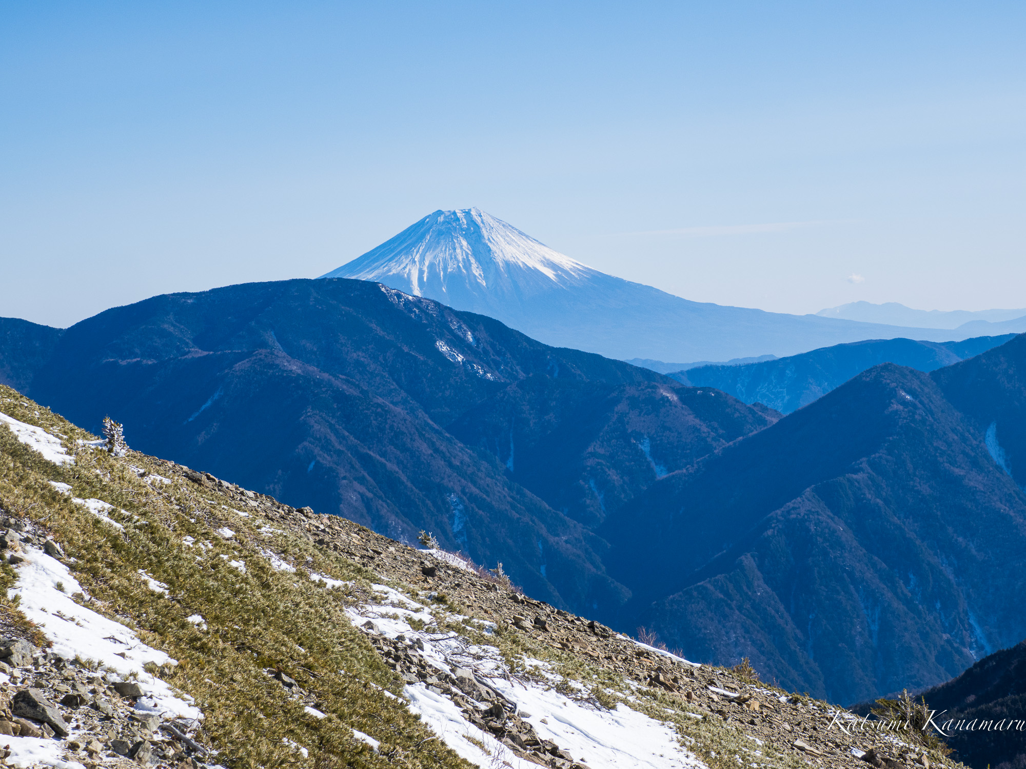 地形的に風裏になるようで、強風は避けることができた。ここまで上がると展望が良い。間近に上河内岳2803m、茶臼岳、光岳と続く稜線。秘右手には富士山、左手には来年の干支の兎岳2818m、実に素晴らしロケーションだ。