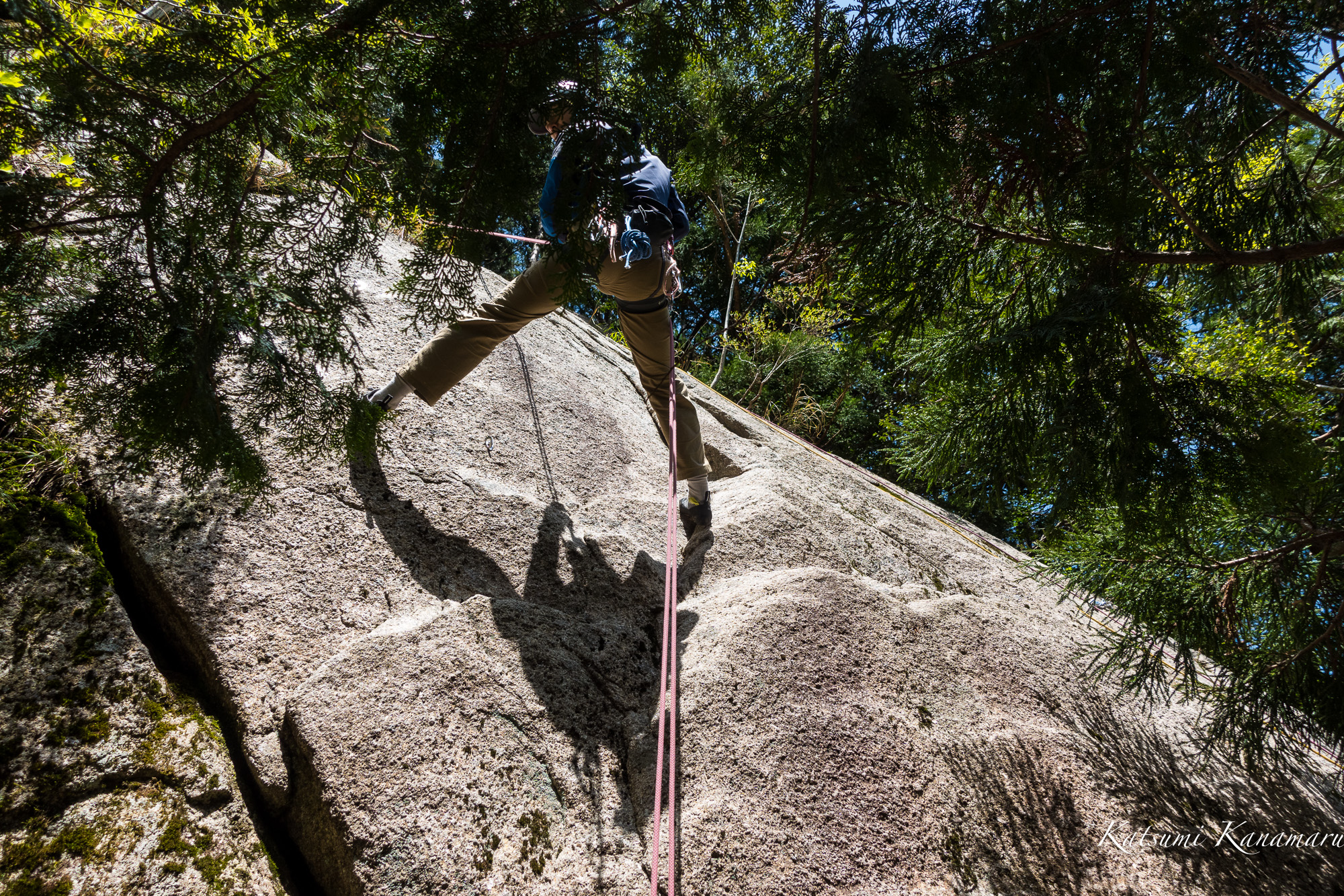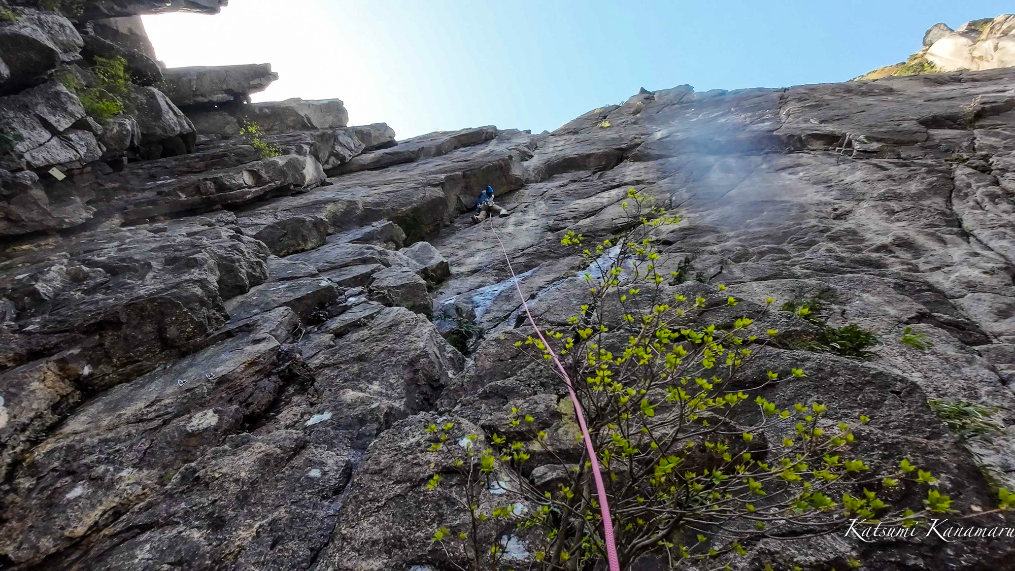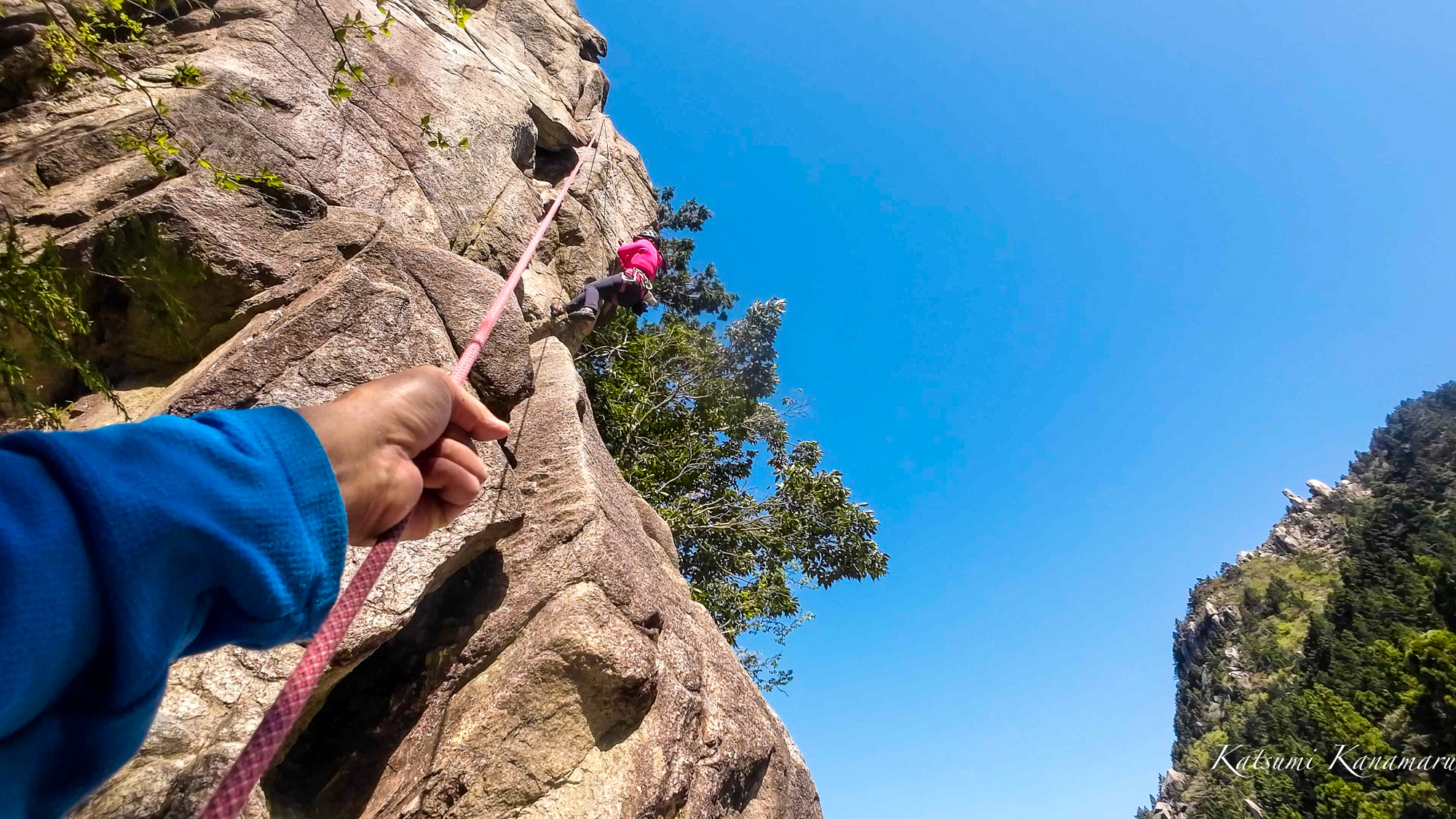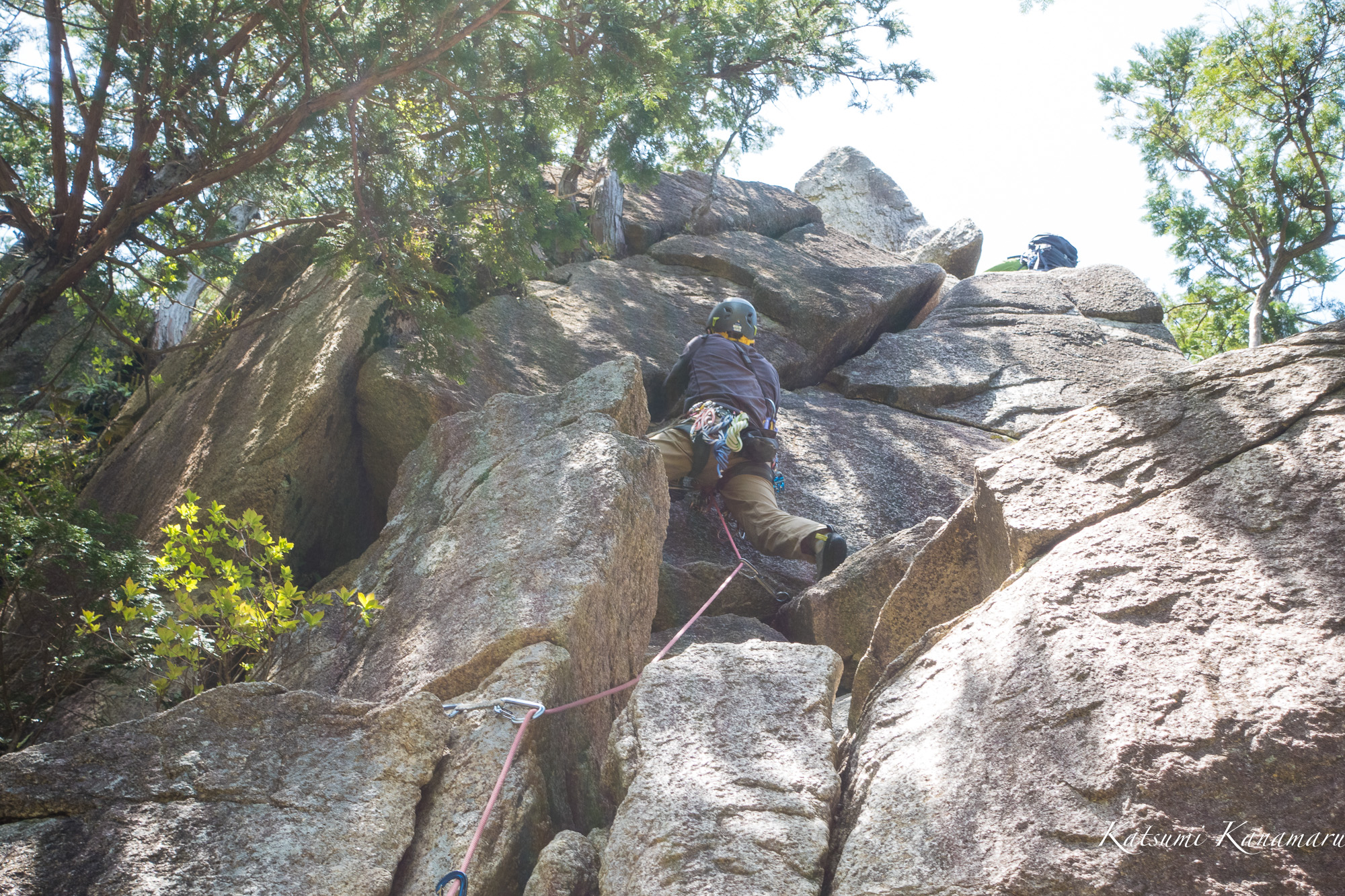ルートは2本あり、カンテのルートはやさしいが、フェイスは難しい。初級の二人はハンギングビレイでピッチの切り方を講習した。