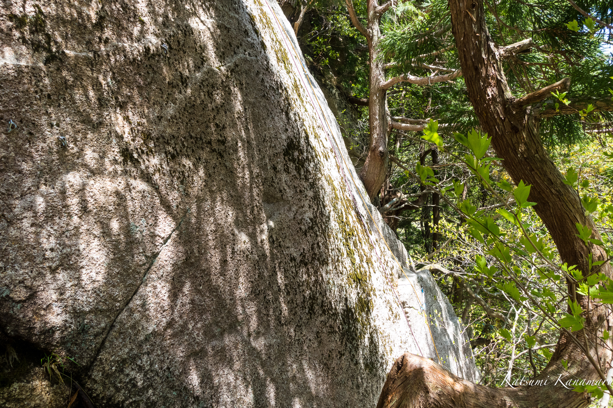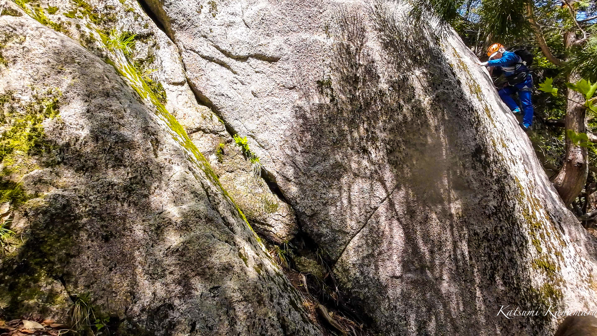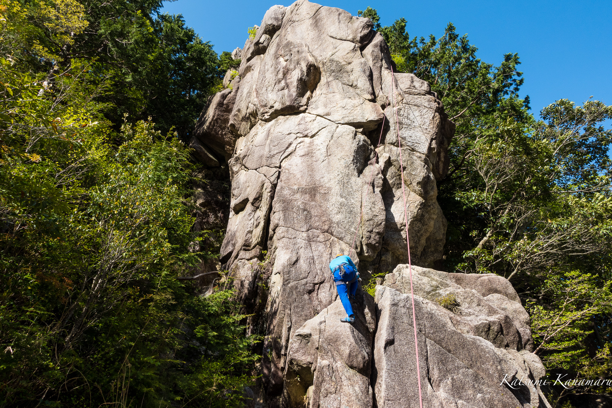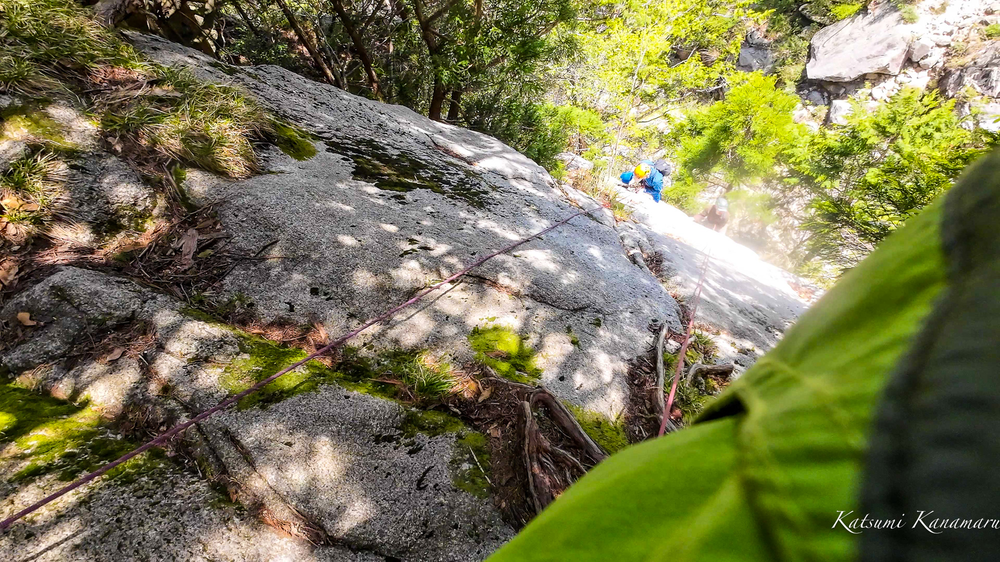ルートは2本あり、カンテのルートはやさしいが、フェイスは難しい。初級の二人はハンギングビレイでピッチの切り方を講習した。