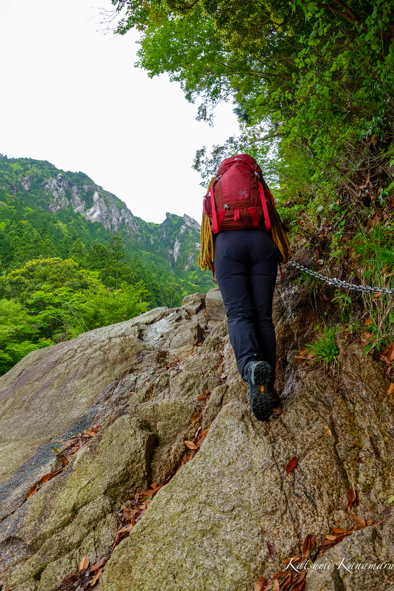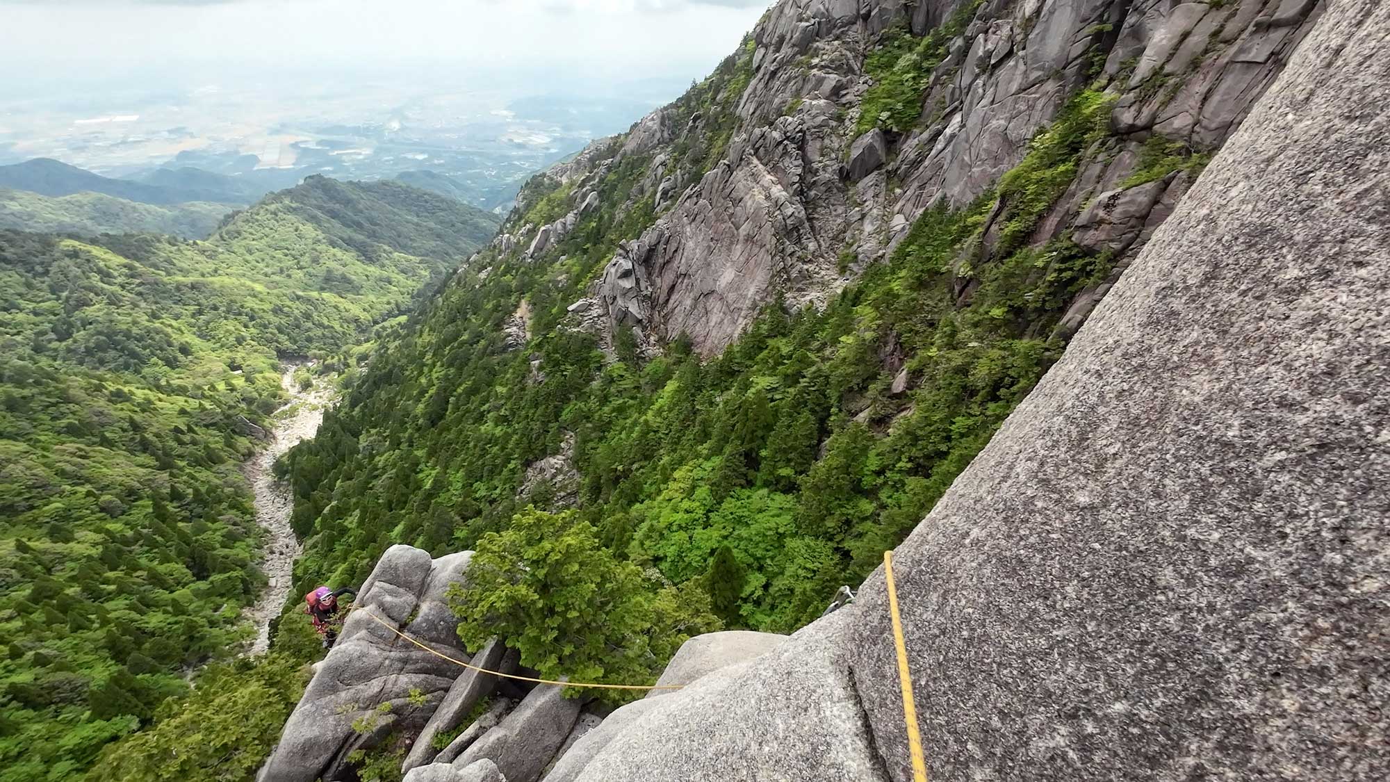 御在所岳前尾根でアルアインの基本を練習した。夏のバリエーションに備え、前尾根の需要が高まる時期だ。予想通りだったので、初級者の入らないP5、P4の藤内沢側でじっくりと、ロープワーク、ビレイと登攀準備、登攀、懸垂下降の練習をした。そして、今度の講演会用チラシ写真を撮影した。シロヤシオ、サラサドウダン、ベニドウダンが満開、オオルリが元気に鳴いていた。