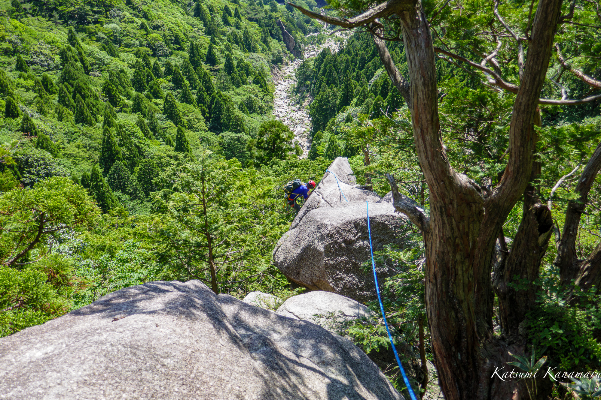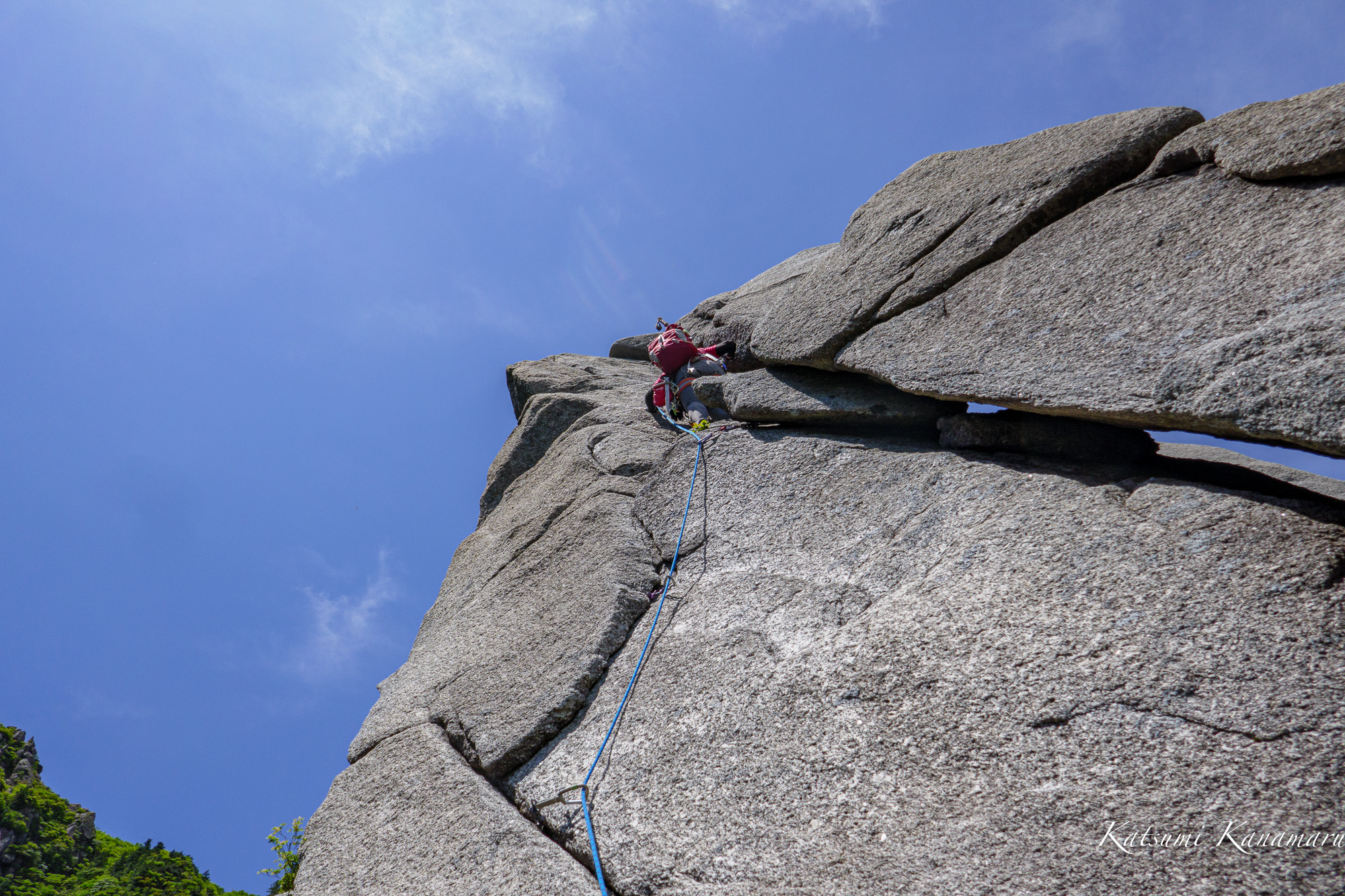 藤内沢側を登る。スラブ、フェイスの変化のあるピッチで、ロープの流れを気にしながらプロテクションをセットするが、どうしてもロープが重くなる。ここでだったが、一の壁からドンという音と叫び声や怒鳴り声が聞こえてきた。何かあったようだ。5>