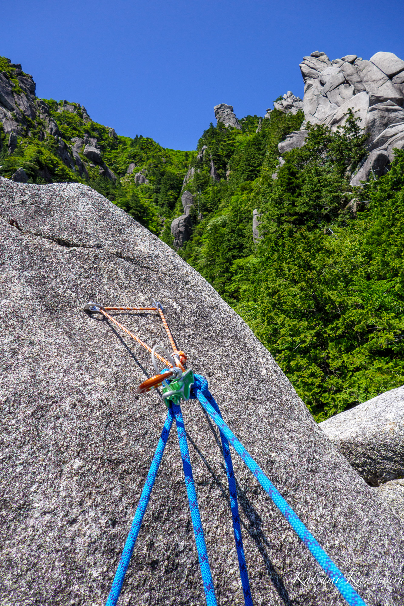 いつもの様に北谷側から1ピッチで藤内沢側へ。2ピッチで登りP4の頭へ。P3が混んでいたら懸垂で戻るつもりだったが。大丈夫なようだ。5>