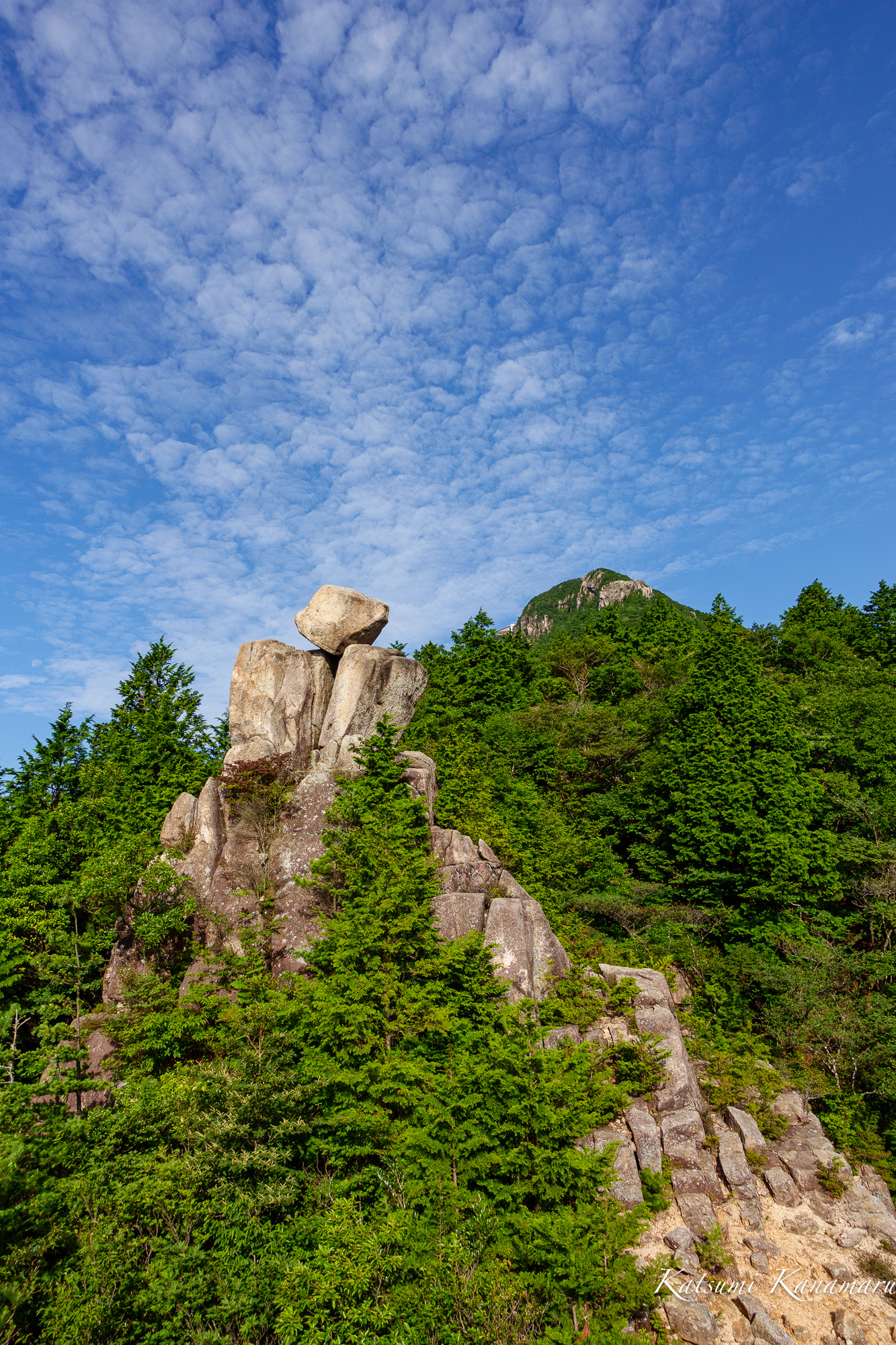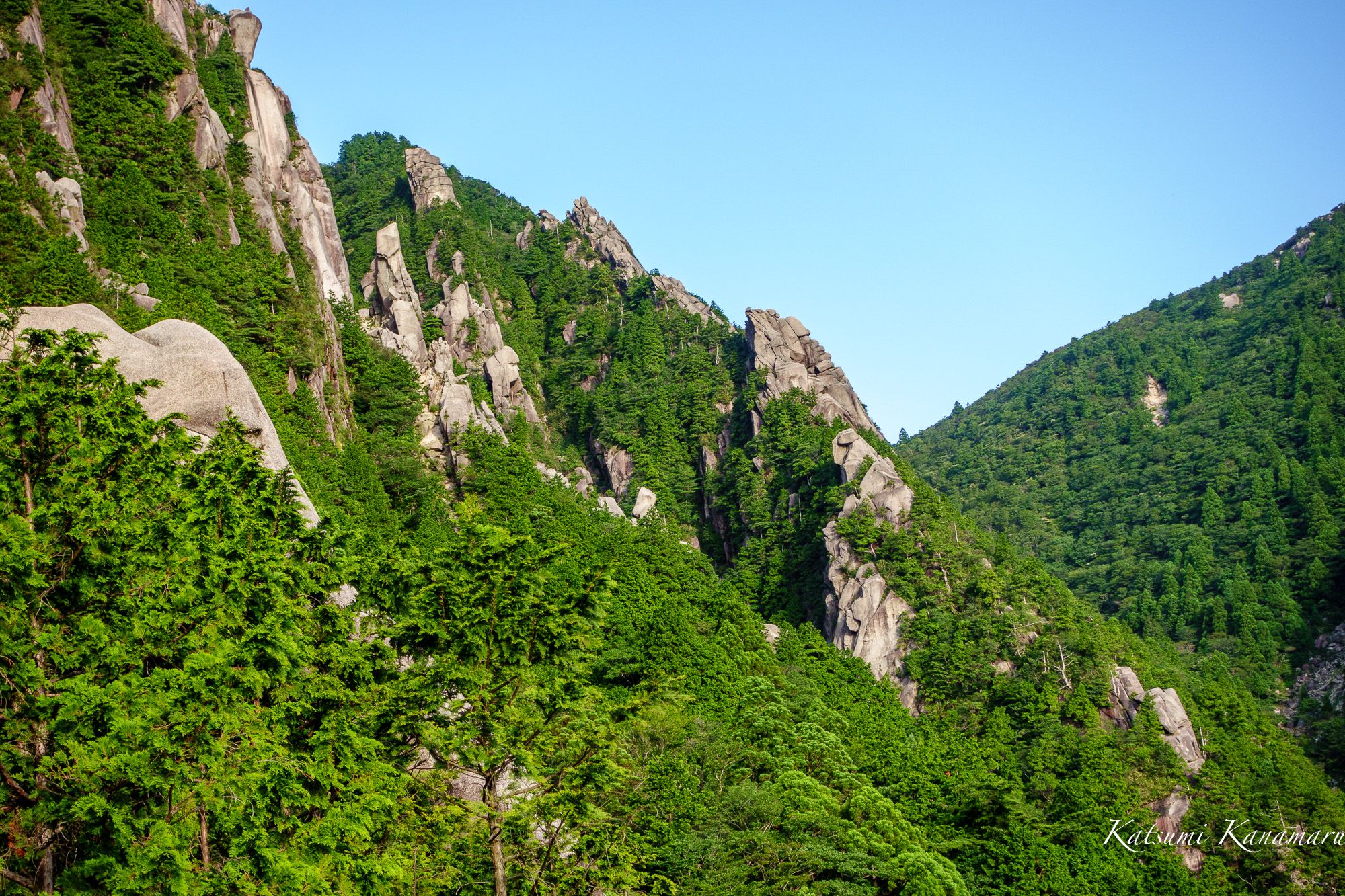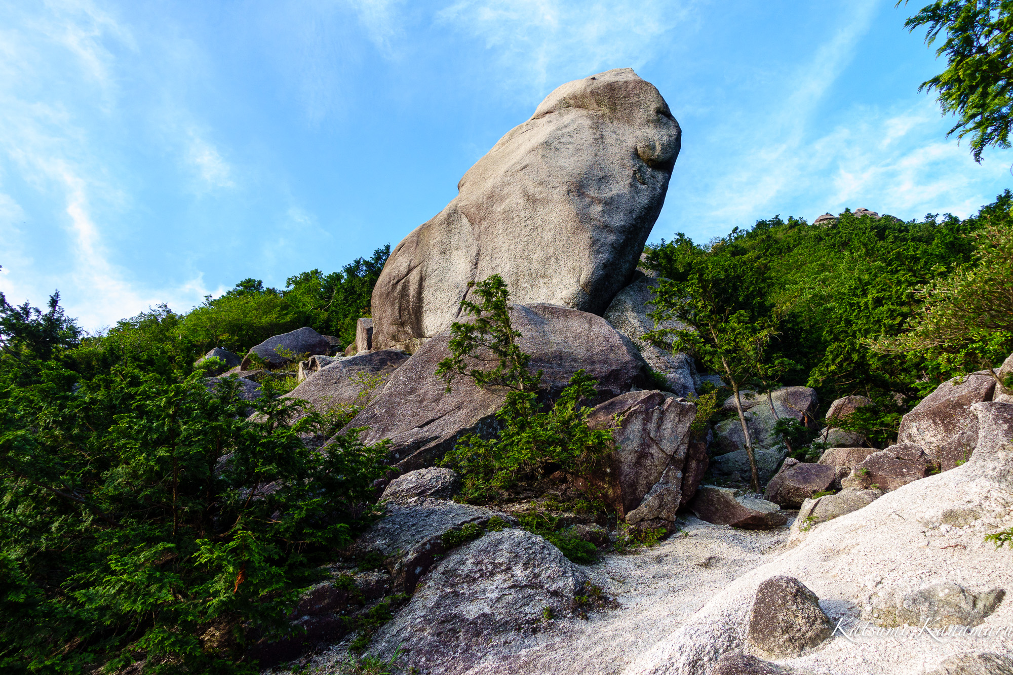 中道を下る。登山者と数人行き交った。交わす言葉は「暑いですね」。その通りだ。早く下山して車のエアコンで涼みたい気分だ。ガイドブック用の写真を取りながら下った。