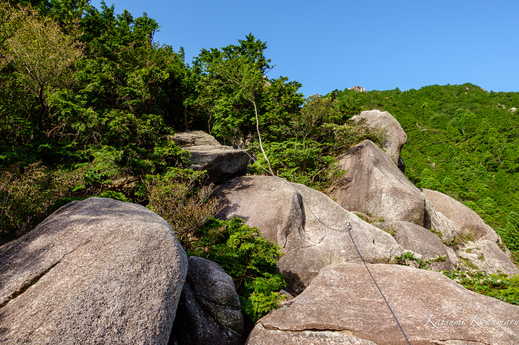 後尾根を登ると中道の岩峰帯の上に出るが、このルートはカモシカ広場の少し下に出た。ロープが張ってあった。5>