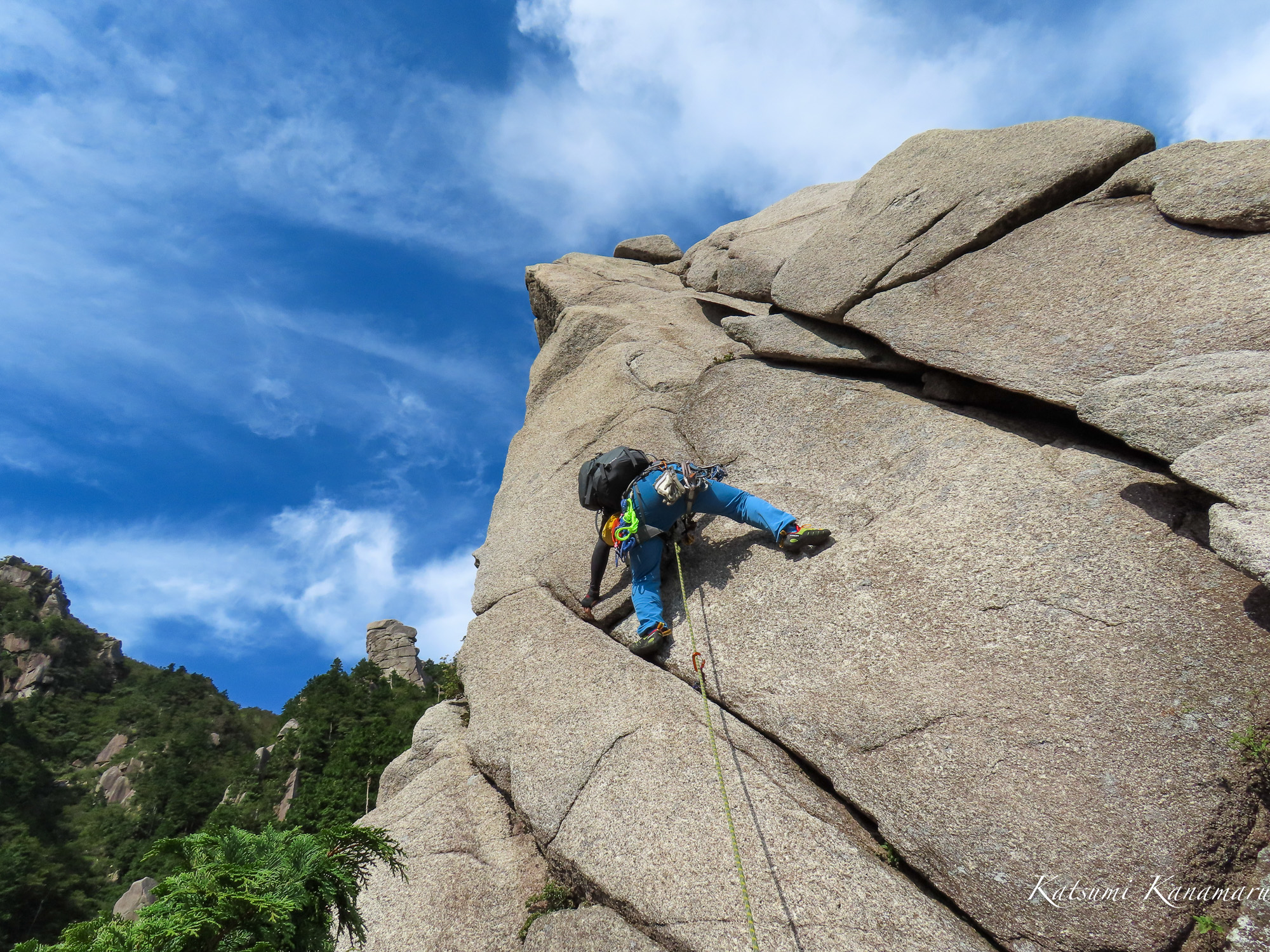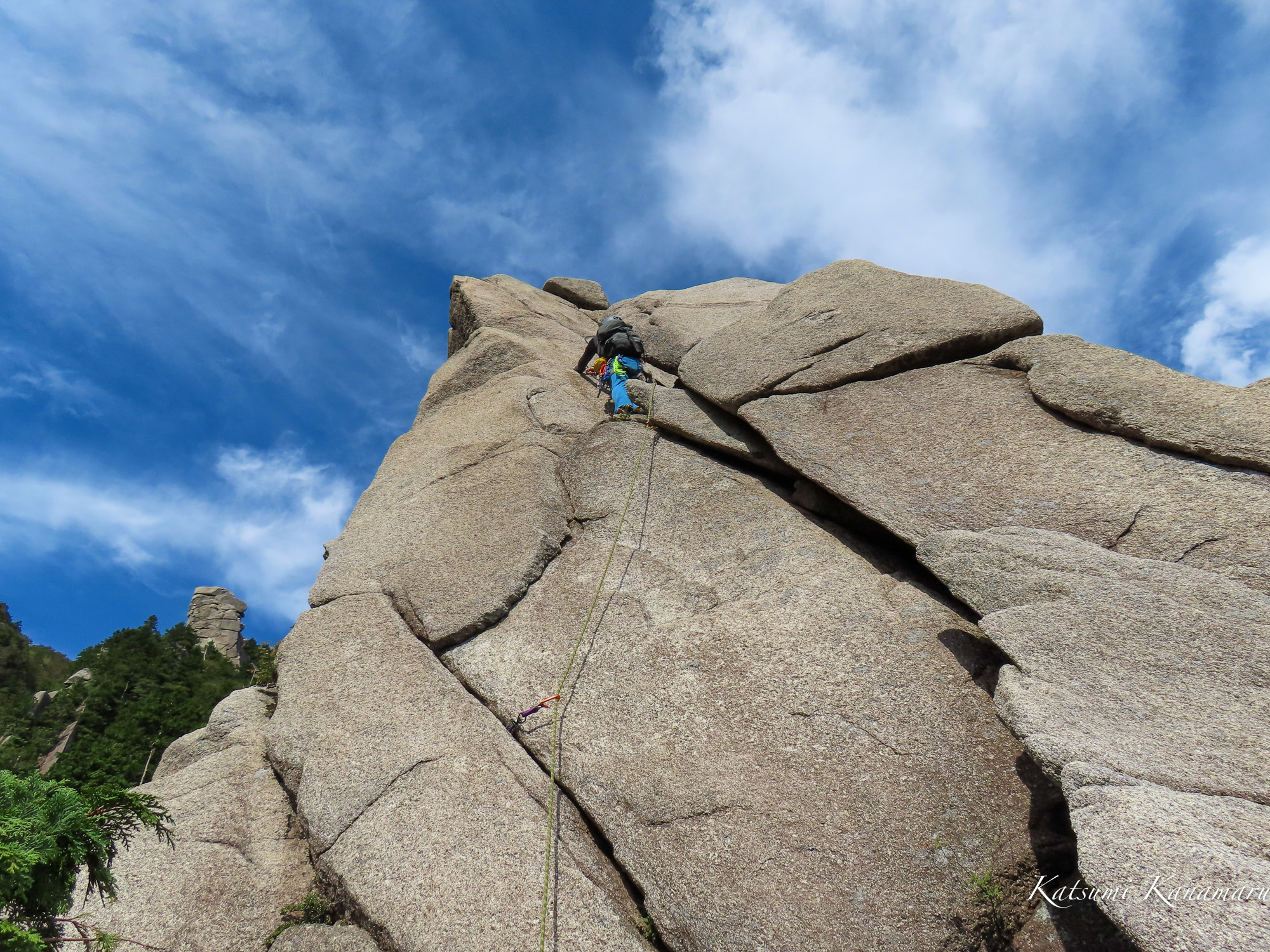 クラックやチムニーをやる時間がないので、ノーマルルートを上る。岩が暑いかと思ったがそうでもない。藤内沢側から吹き上げる風が涼しい。早朝とはいえ、1ピッチ登ると汗が出る。