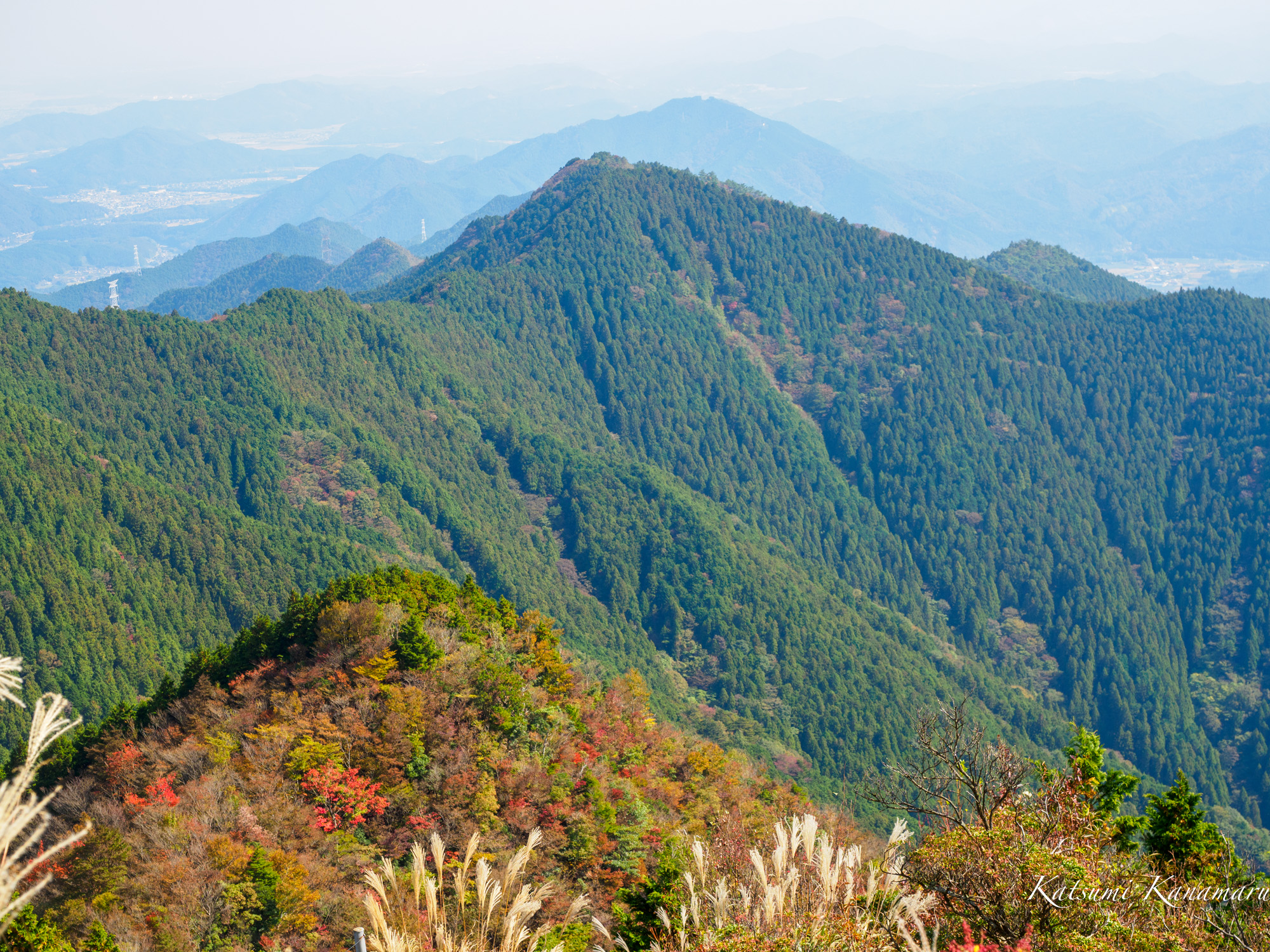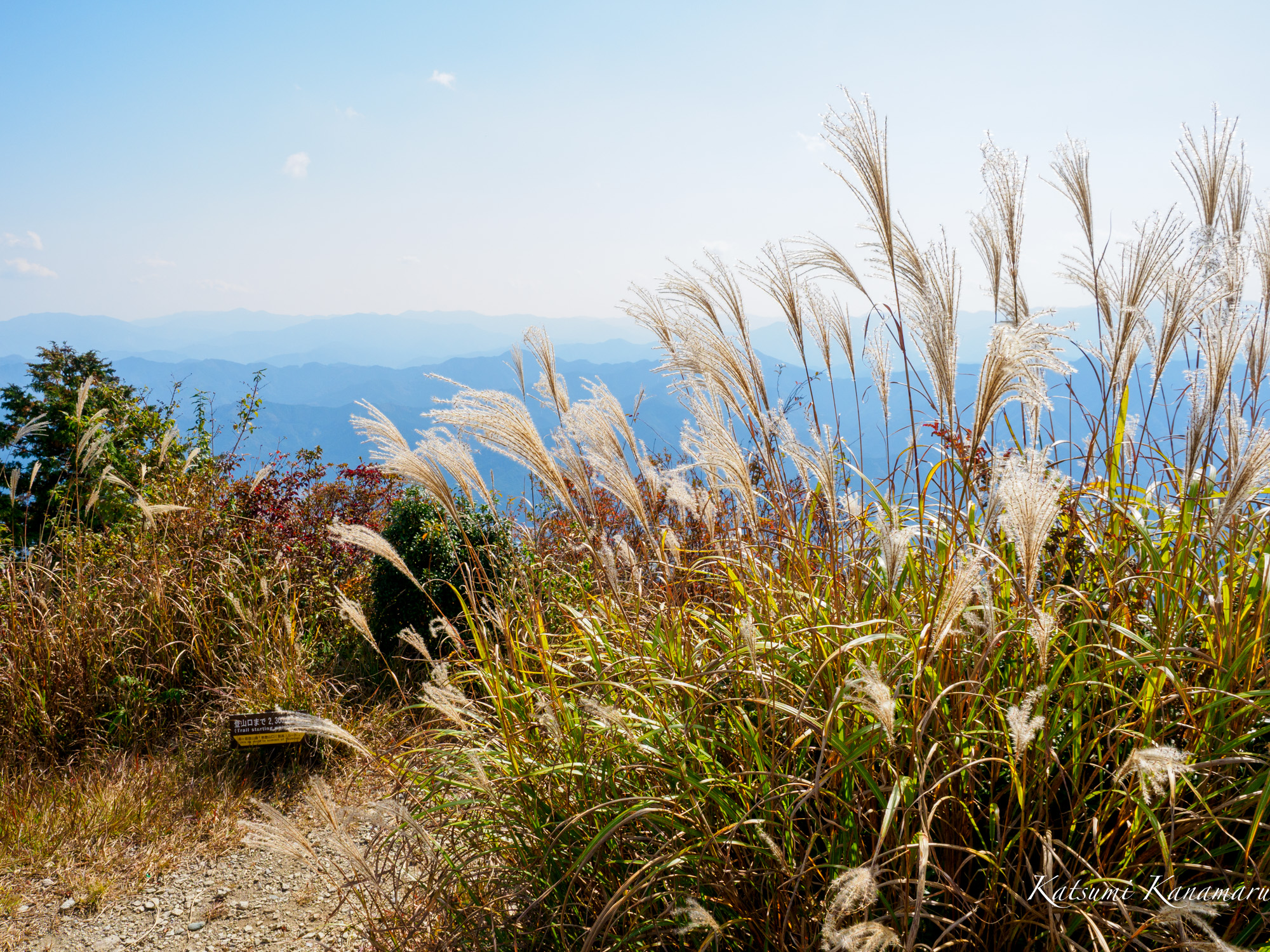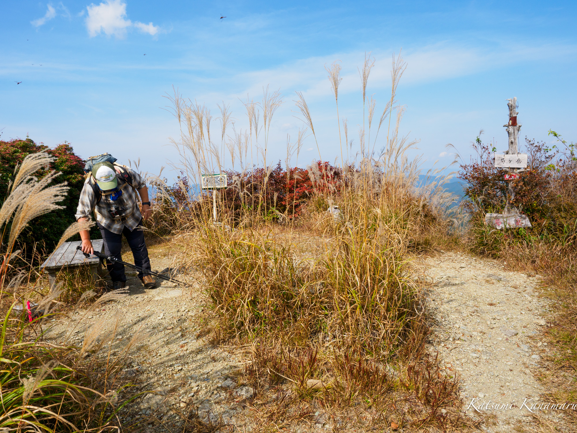 山頂はシロヤシオが色づき、ススキの穂が風になびいていた。秋らしい風景だ。20年以上前だが、なんとなく山頂の雰囲気を覚えている。円錐のてっぺんにある山頂で360度の展望が開けている。5>