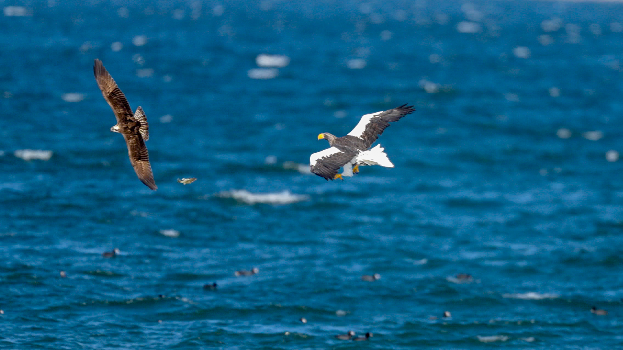 琵琶湖山本山のオオワシ2025No 72025年12月18日19日 野鳥撮影 おばあちゃん 渡来40日目 北西の風に乗りよく飛んだ オオバンに追うが失敗 魚を捕食