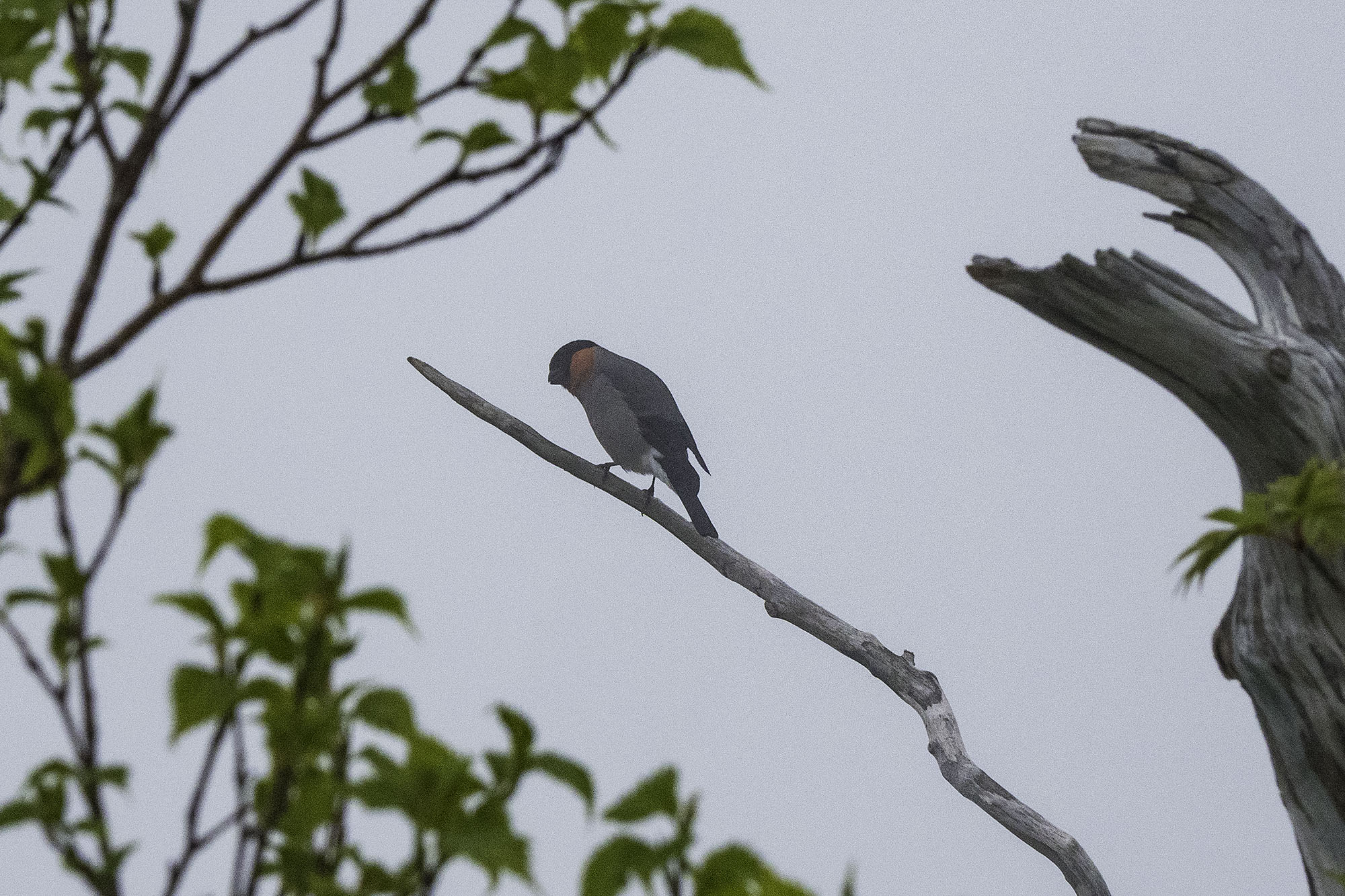 ウグイスに紛れて、ウソがやってきた。「ひーほー」という独特のさえずりで存在感を誇示していた。すぐ近くの小枝にとまってくれたが、ガスが濃くてすっきりしない写真になった。鳥用に望遠レンズの持参も検討したが、行程が長いので持ってこなかった。鳥撮影は待ち時間がかかる。