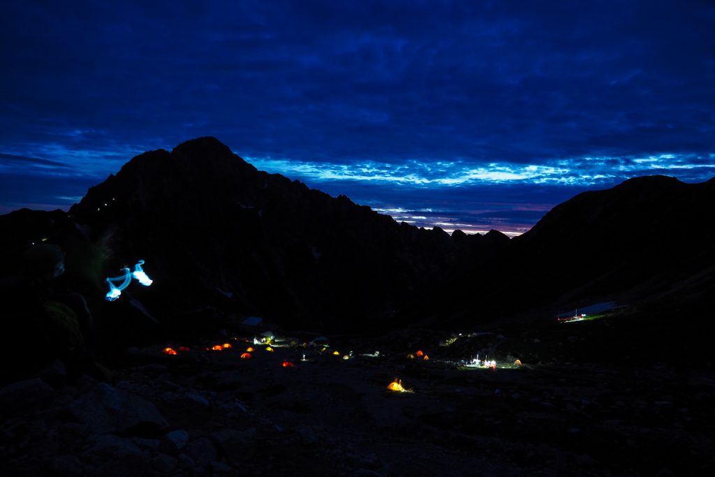 日が傾くと山に陰影ができ写真写りが良くなる。刻一刻と変化する積乱雲を見ていると飽きないし、青空と雲が脇役となり、主体である剱が際立つ。しばらく撮影が楽しめた。