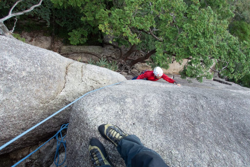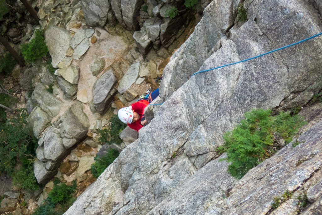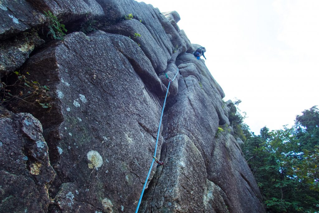 P6、P5は難なくクリアし、P4の滑り台へ。個々はNP中心のクラックといフェイスルートで、高度感があり登攀の醍醐味が味わえるルートだ。クラックで少しもたつくが ここも問題なくクリアした。