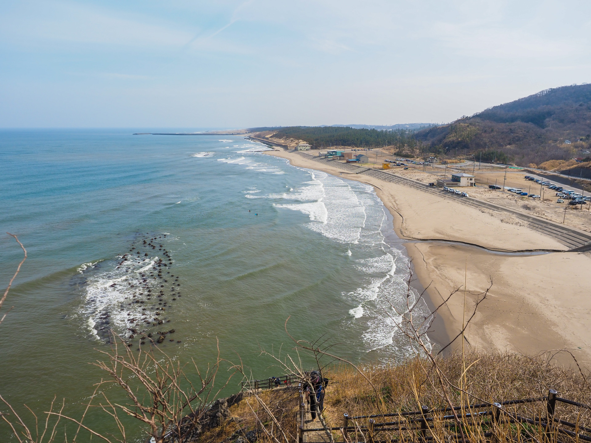 角田山の登山コースはいくつかあるが、花見だけではなく全般的に人気があるのは灯台コースだと思う。今回もこのルートを登りに使った。浜の駐車場には多くの車で溢れていた。まずは海岸を歩き、灯台まで階段を登る。振り返ると日本海が広がっている。
