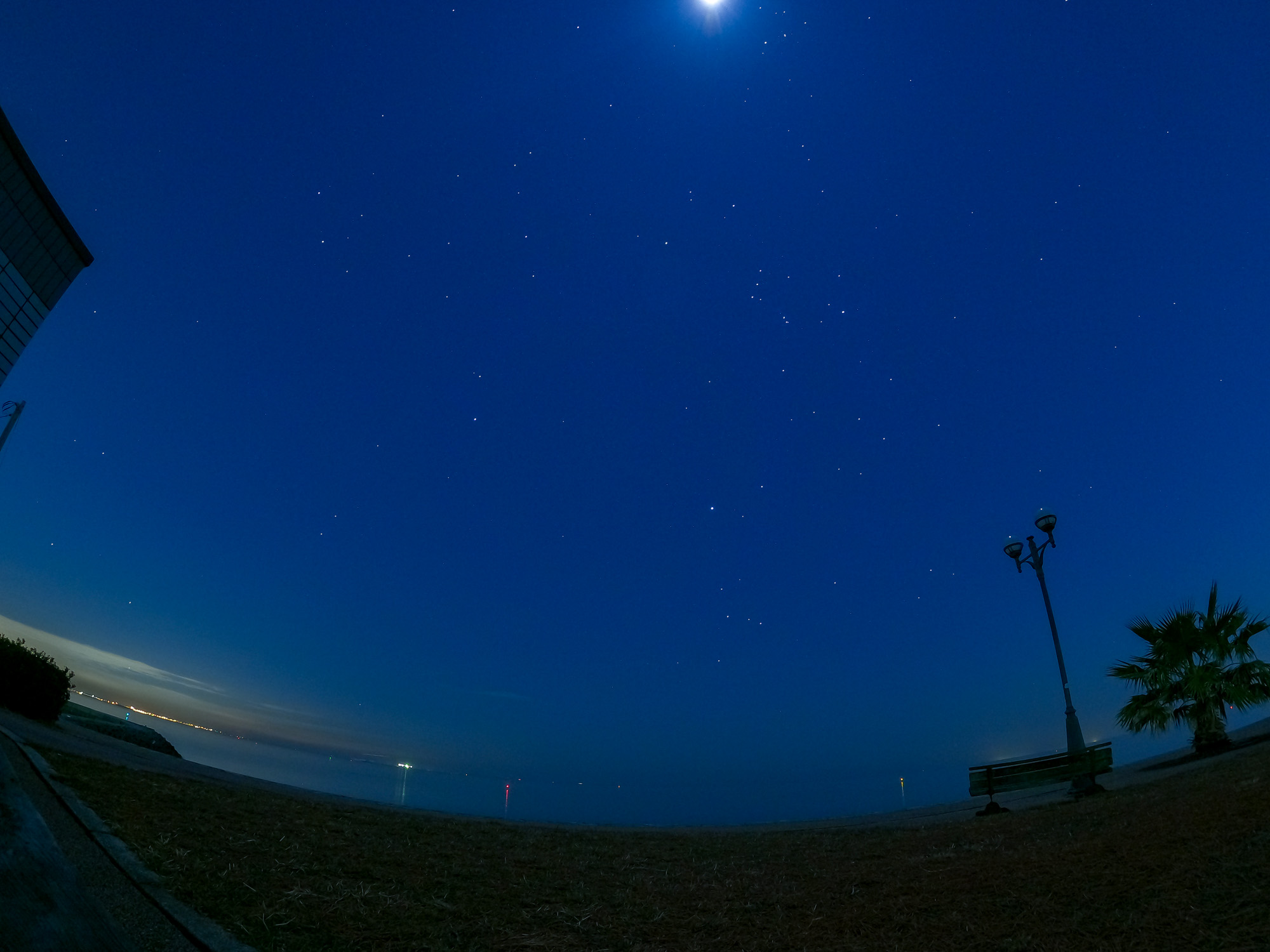 GoPro9 ナイトショット ISO800 SS20-30。ISO800くらいが適当だと思う。1600まで上げるとノイズが目立ってくる。露出20秒〜30秒くらいでやってみた。星の大きさと、色温度はPhotoShopで編集した。