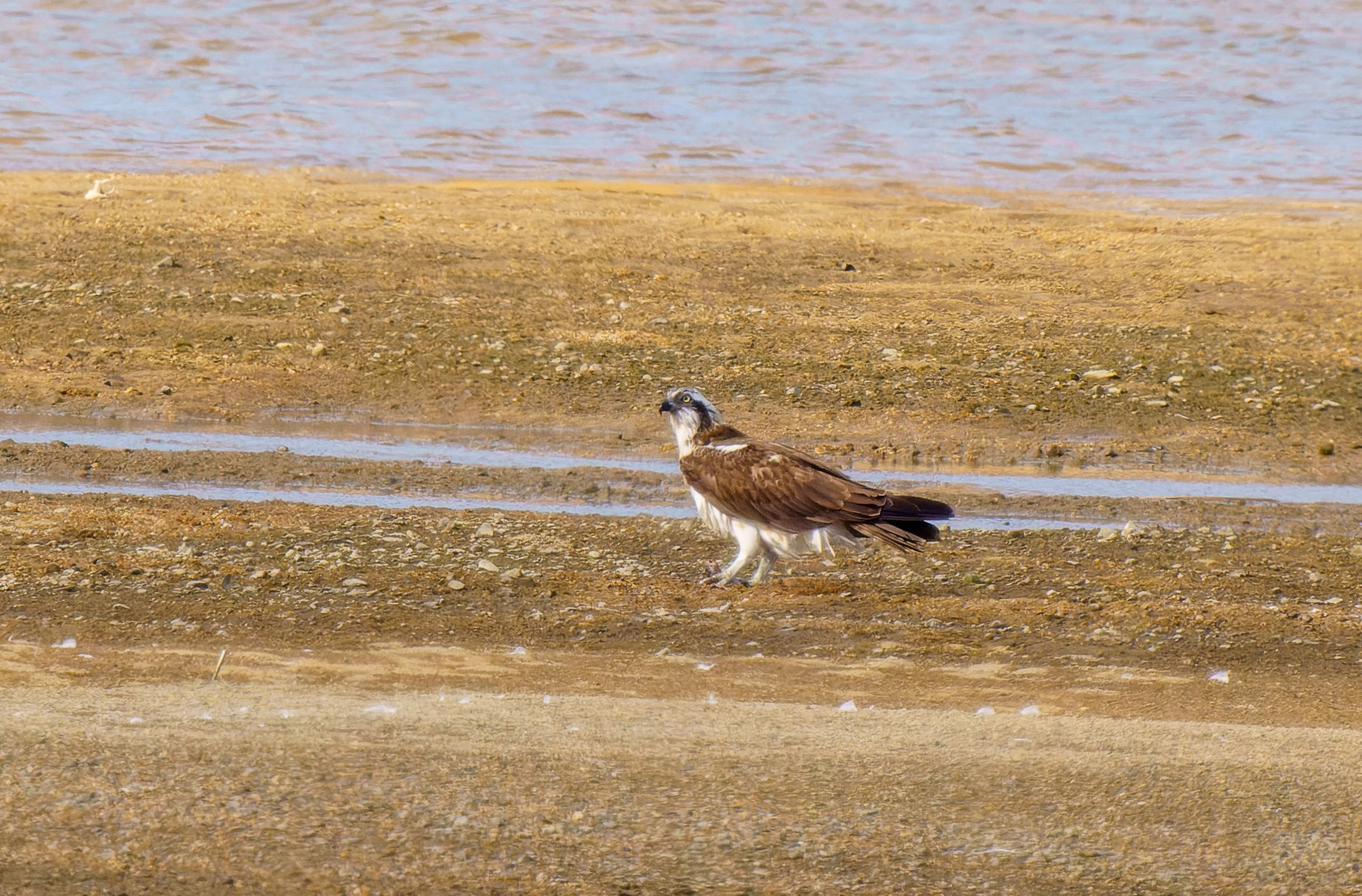 低いところで小さく旋回し始めたので、ダイブしそうとだと思っても、距離が遠いので双眼鏡で観察を続けた。すると飛び込んで水しぶきが上がった。車で近くまで行くと、中州で雄物を食べ始めていた。飛翔シーンは容易に撮れるので、狩りのシーンだけに絞って待機した方がいいだろう。時刻は15時だった。朝と夕が狩りのシーンを見られるチャンスが多いようだ。