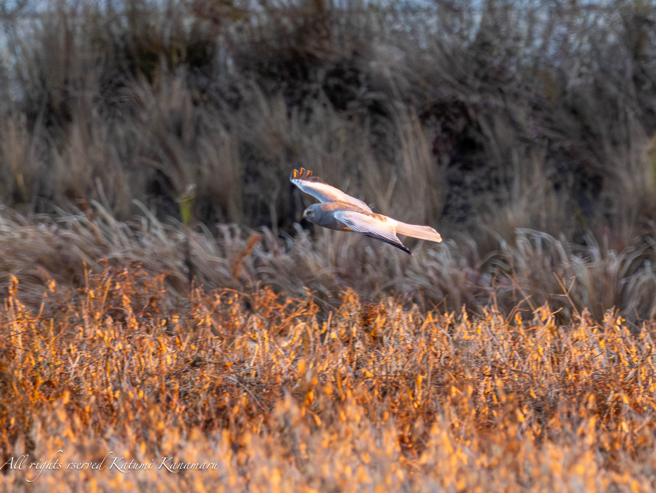 夕日に染まるハイイロチュウヒ 鍋田 2023/12/1