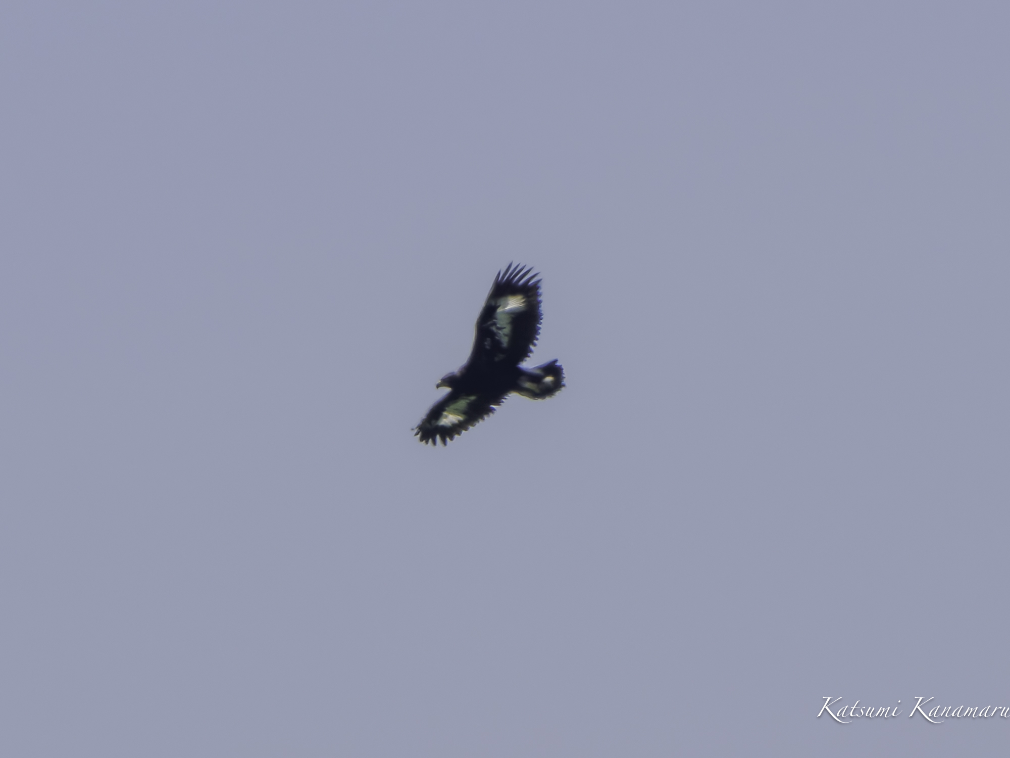 イーブレットさんのYouTube を見るとやはり巣の周辺を飛んでいたようだ。しかし駐車場からはよく見えない。もう少し風が出てくると、高度が上がるだろう事を期待し待った。するとペアで上がってきて見張り台にとまった。Sさんからの情報で北面の木にとまっているとのこと。
