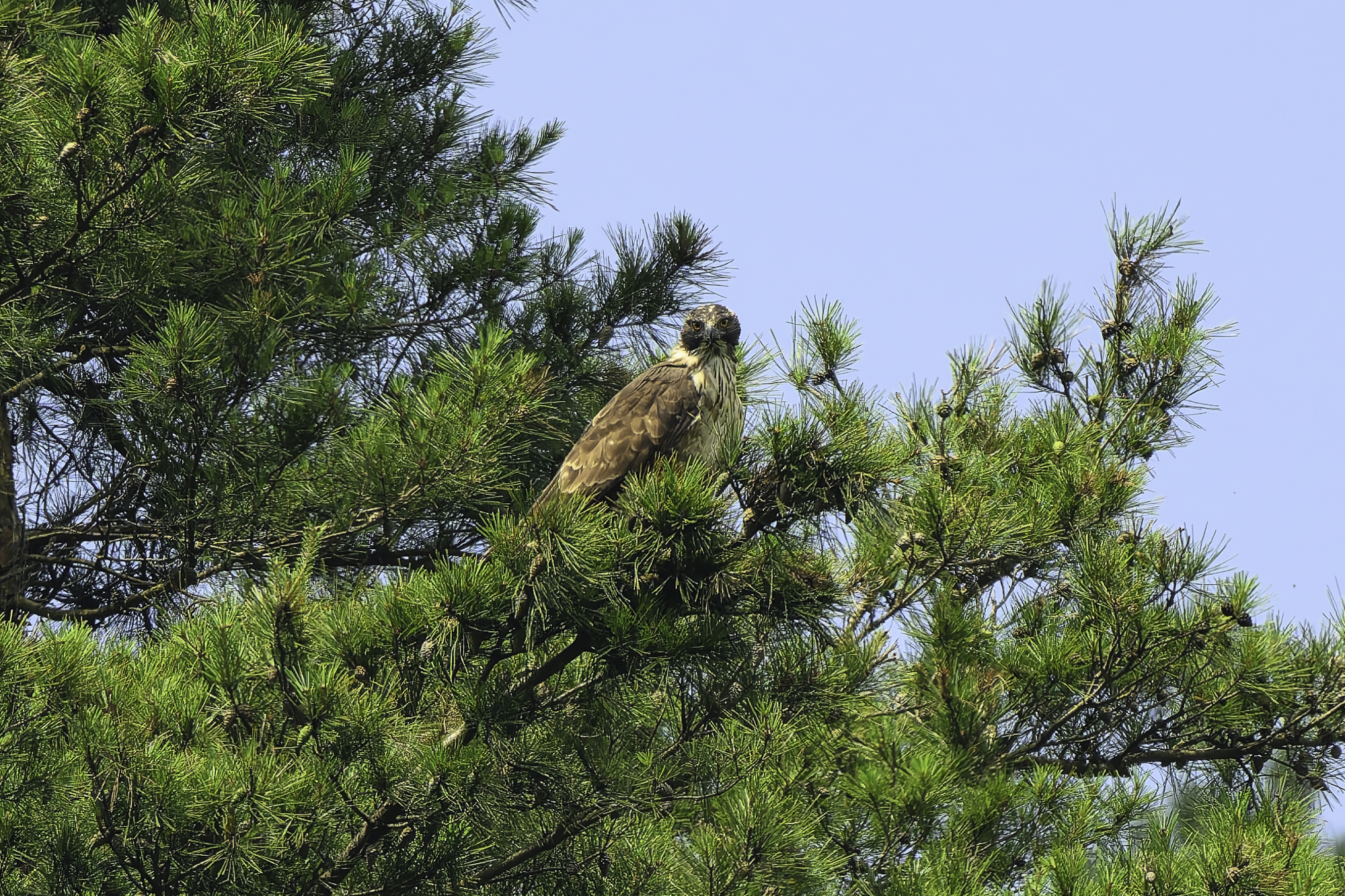 昨日は山麓のクマタカもだめだったので、もう一度リベンジしてイブキに上がることにした。到着して巣バラクすると運良く、クマタカの雌が出てきてくれた。7月に入り出が悪いようだ。クマタカの場合、森の中を移動出来るので、子育て中だが姿を出さないことが多い。